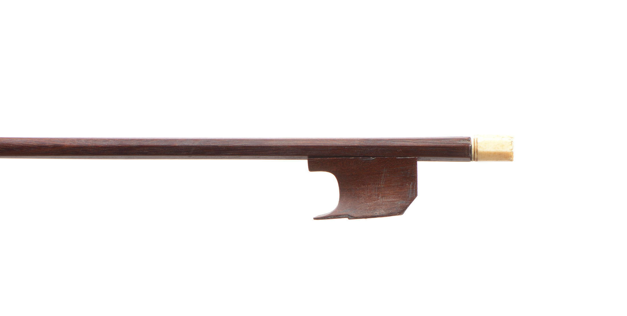 Baguette ronde, en beau bois de pernambouc brun rouge, légèrement raccourcie à l'arrière. Tête sur un modèle "tête de marteau", correspondant au style "CRAMER". Hausse en pernambouc à restaurer. Bouton en os d'un autre auteur.
