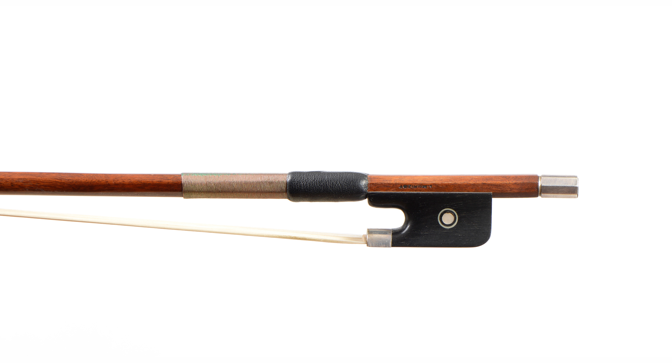 portant la marque au fer L.MORIZOT. Baguette ronde en bois de pernambouc. La Hausse est en ébène montée argent, grain cerclé. 64 g. 728 mm.