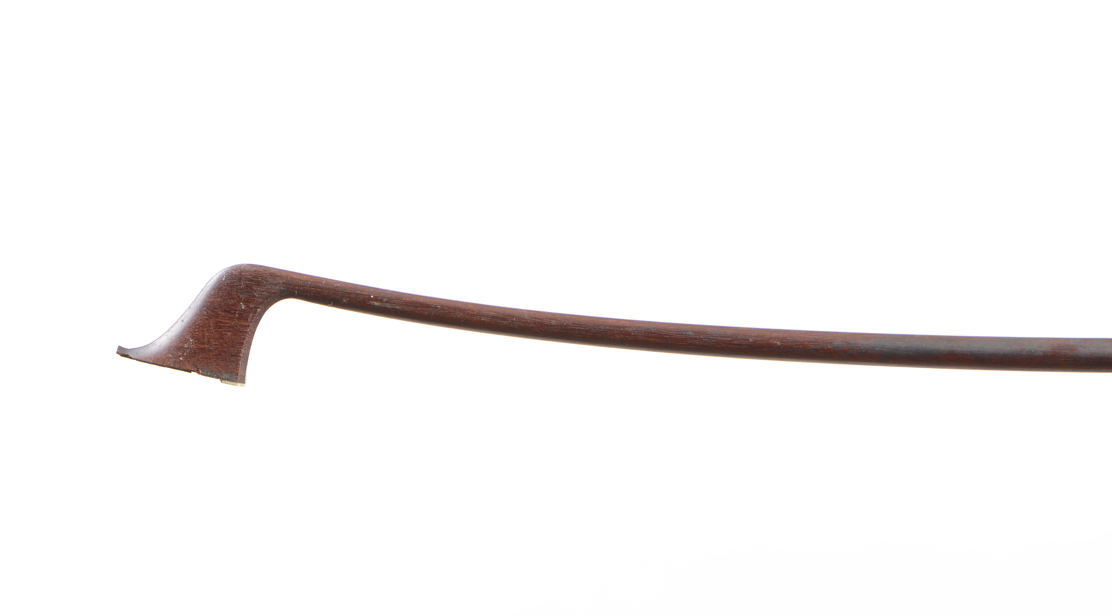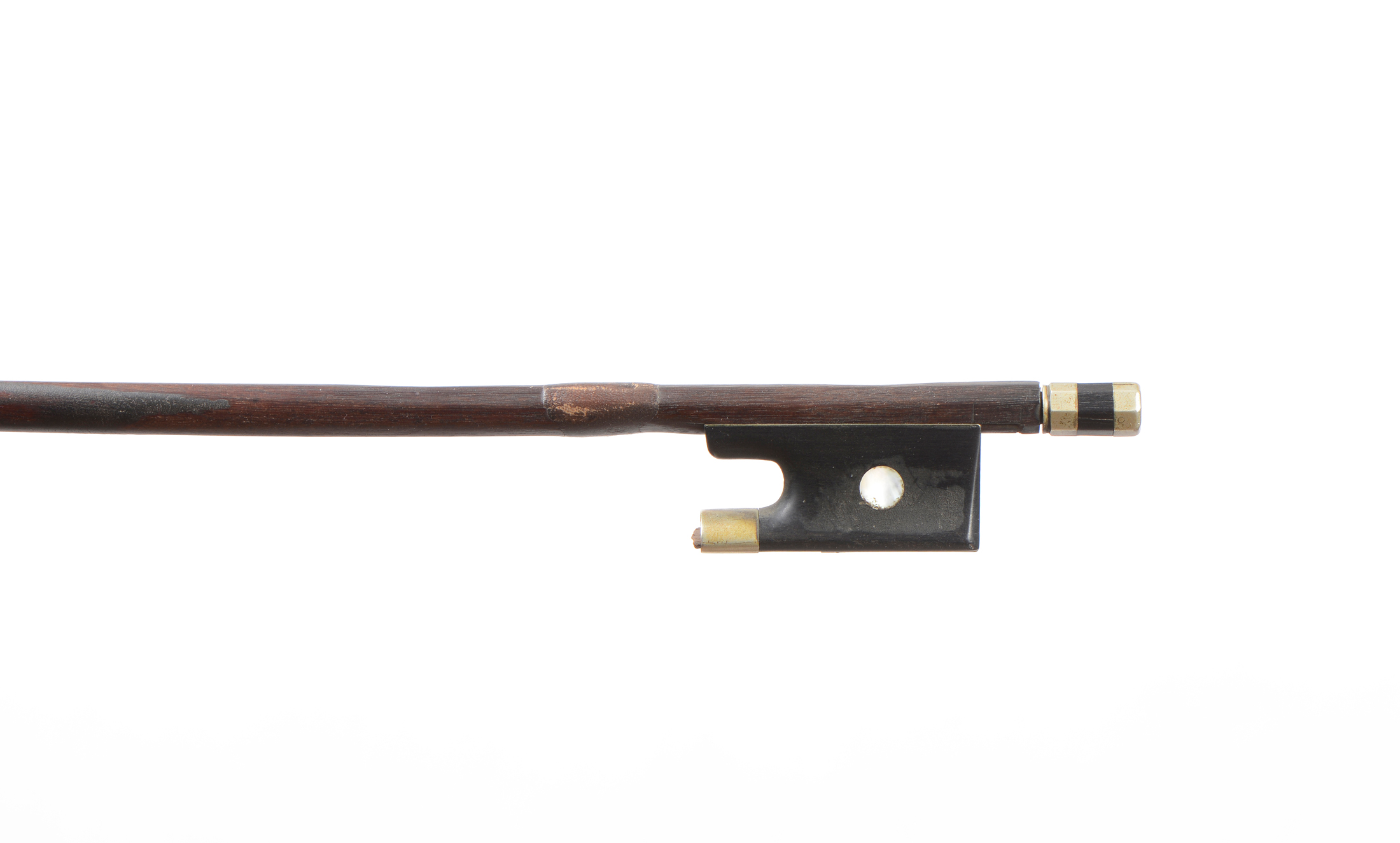 Baguette ronde en pernambouc. Hausse ébène, sur un modèle de Vuillaume, montée maillechort. Usure à la baqette. 698 mm. 63 g. Sans mèche, ni garniture.