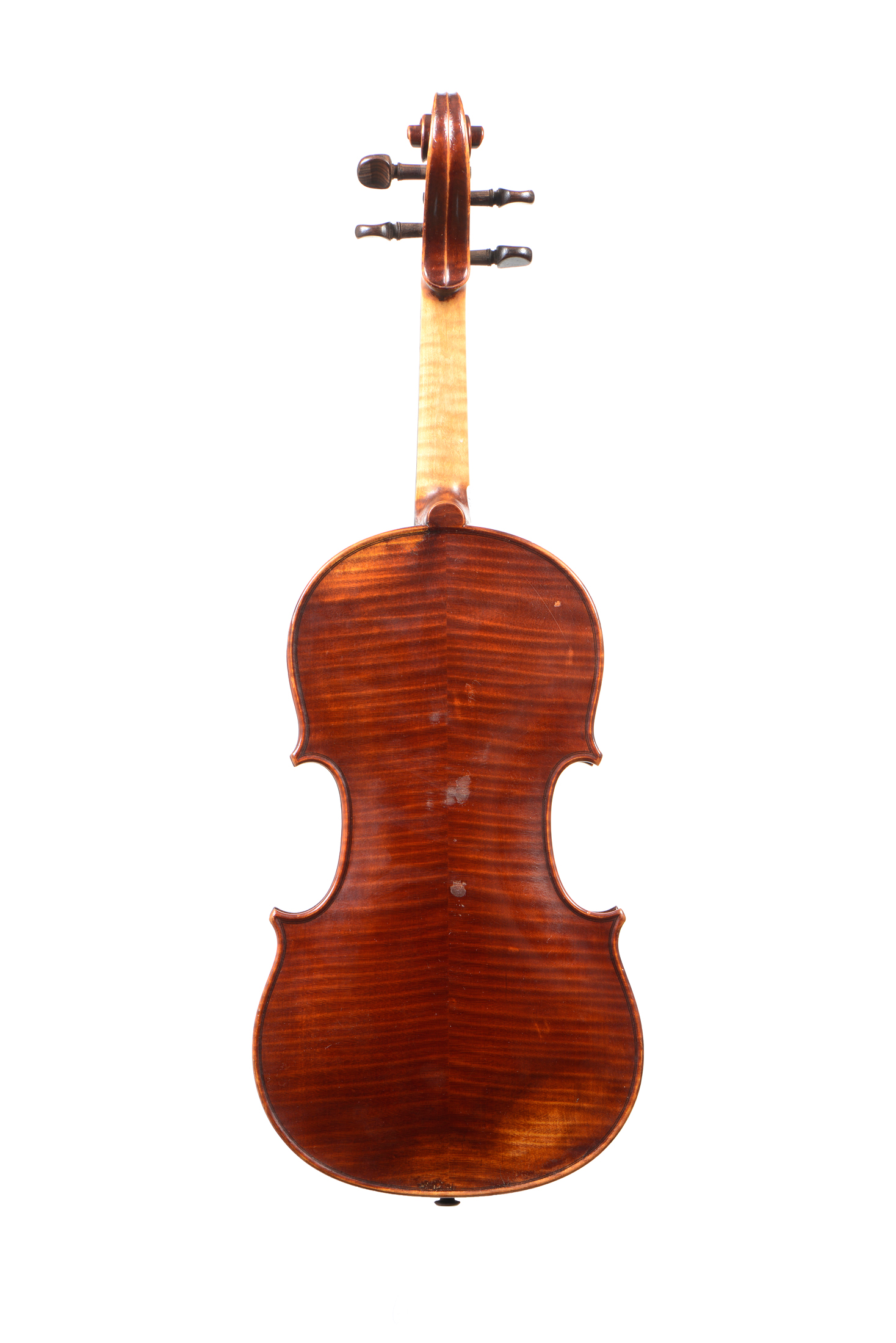 fait par Charles Bovis dont il porte l'étiquette au millésime de 1939, à NICE. Fond de deux pièces en bel érable aux ondes réguières. Vernis rouge brun sur fond doré. 358 mm. Bon état général.