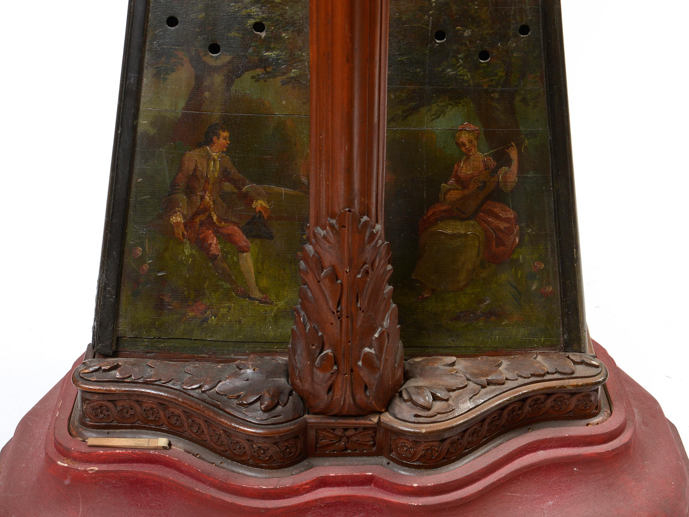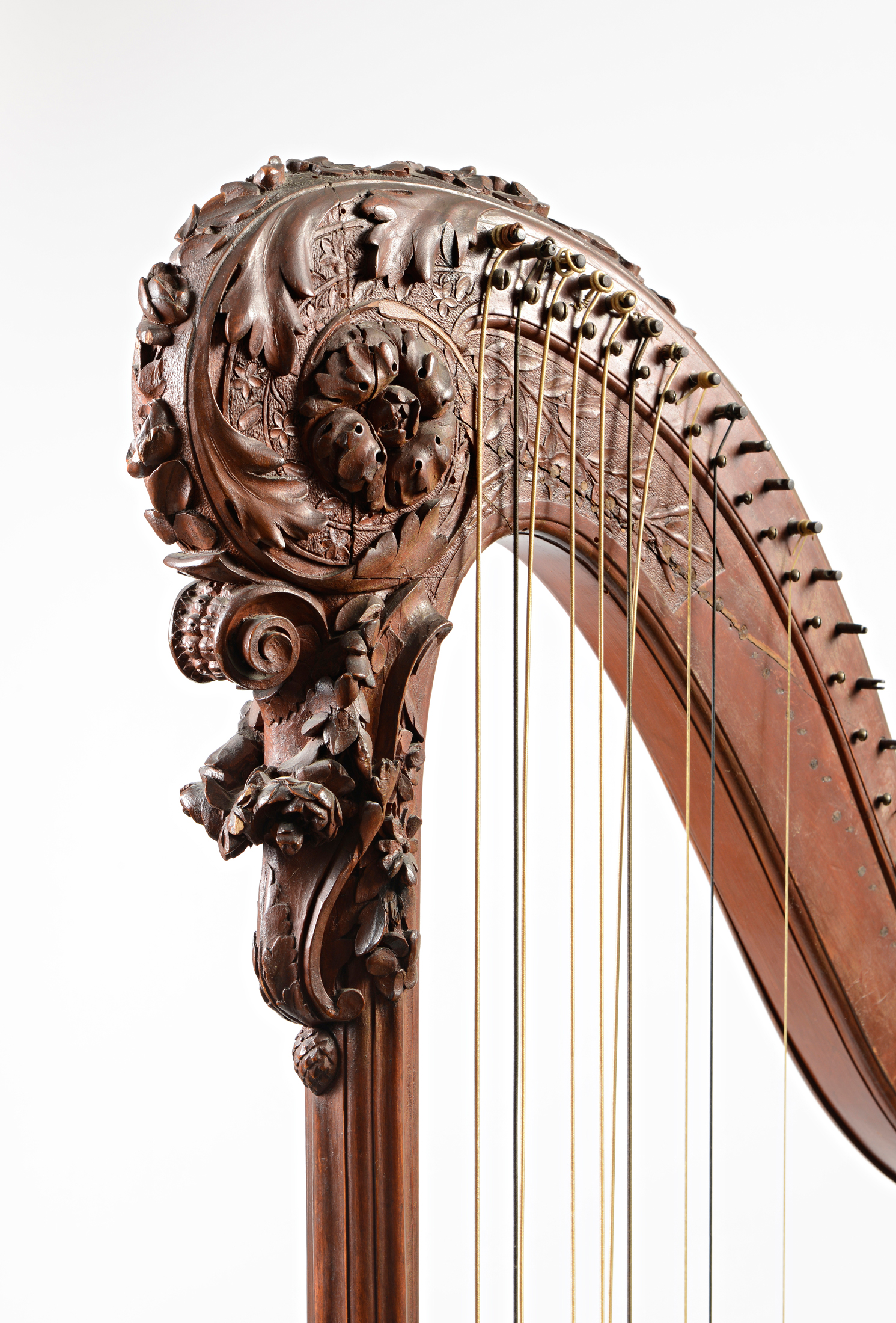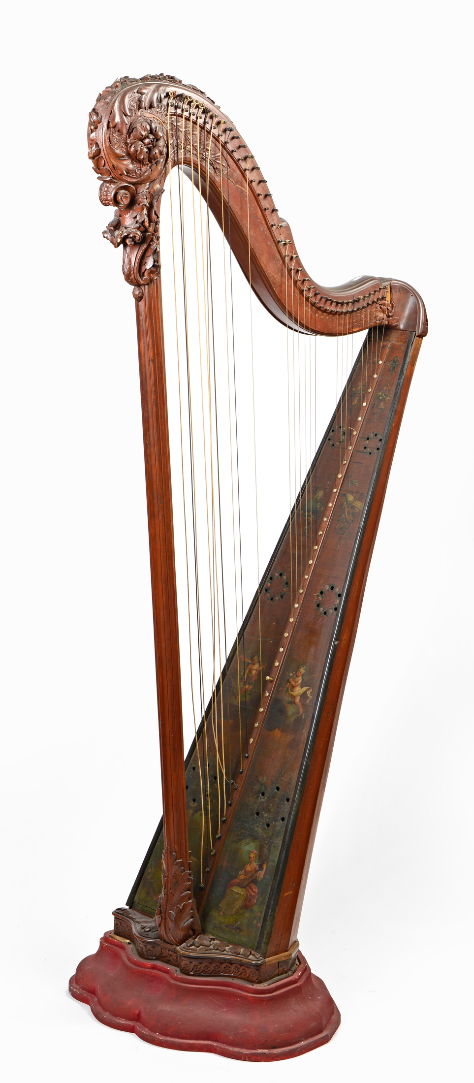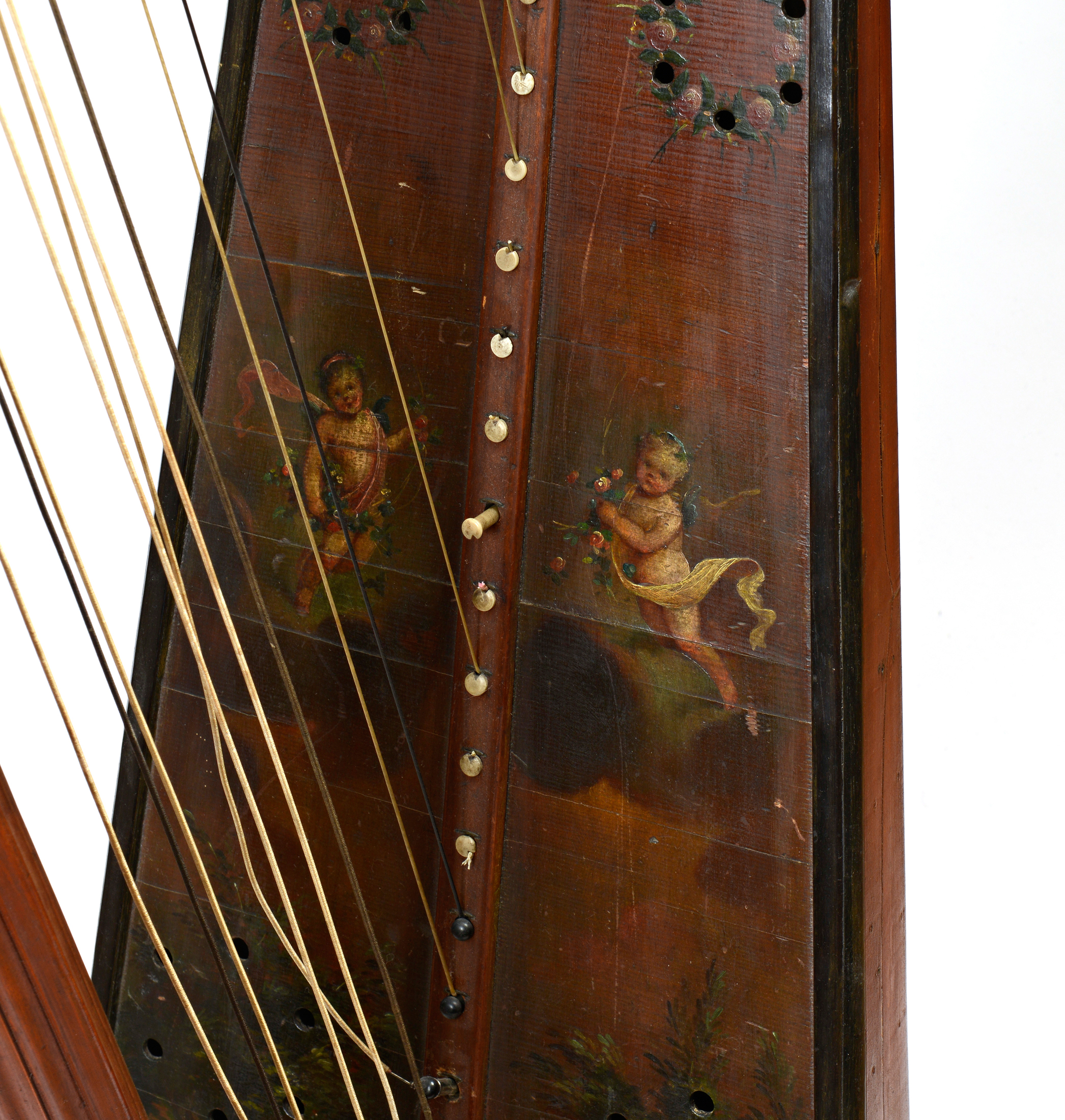 portant la marque au fer à coté de la culée "Holtzman à paris". Harpe à 36 cordes, table d'harmonie en épicéa aux pores disposés en travers, sur face peinte de plusieurs motifs Rococos. Le corps est composé de 9 cotes. La mécanique, et les pédales sont manquantes. Elle repose sur un socle moderne adapté pour une exposition. L'ensemble est à restaurer.