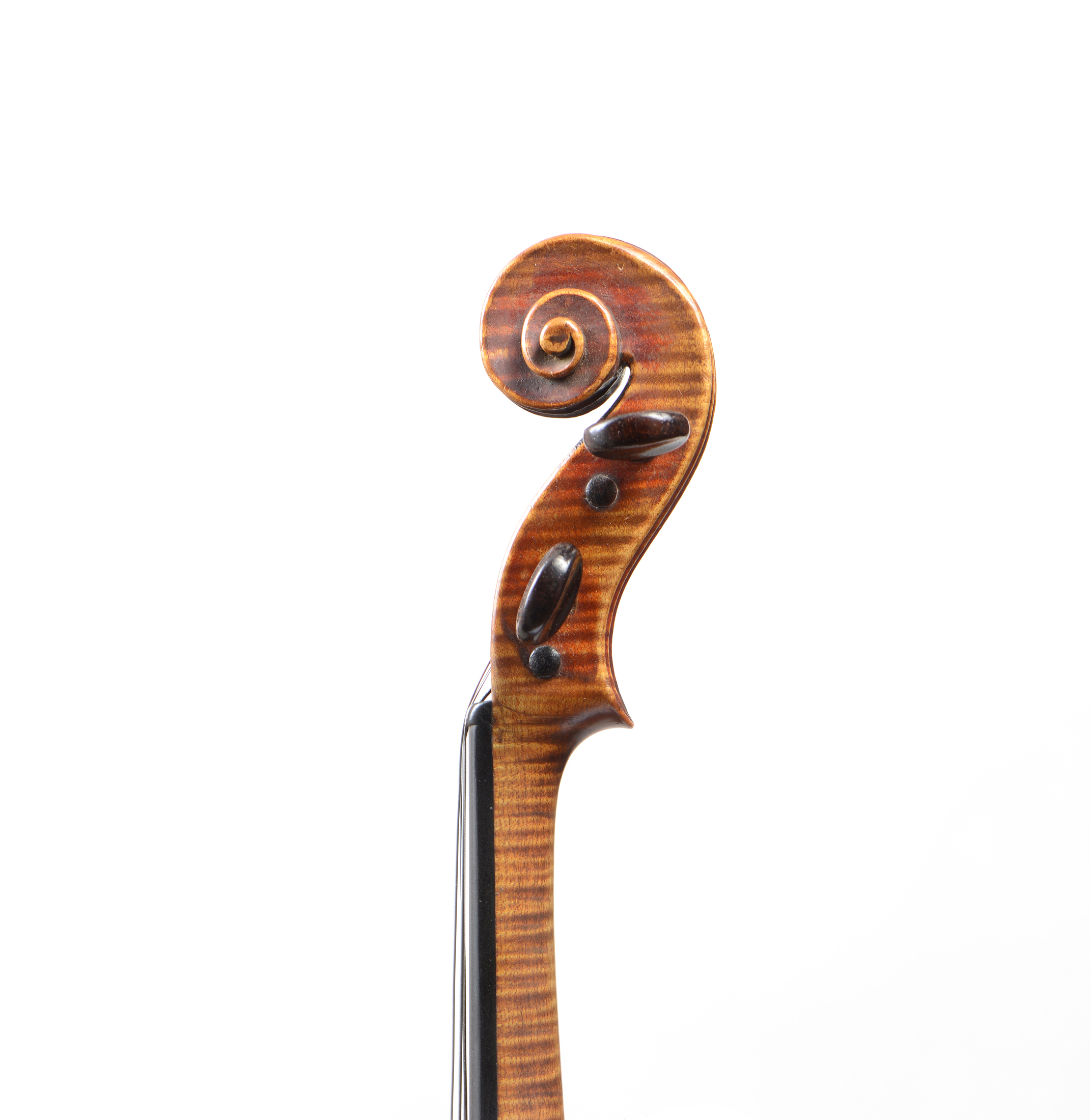 Fait par Pierre SILVESTRE, à Lyon, en 1852 dont il porte l'étiquette originale. Modèle Guarneri. Fond de deux pièces en bel érable. Eclisses et tête du même bois.L'ensemble en parfait état de conservation. 358 mm. Avec boite et deux archets.
