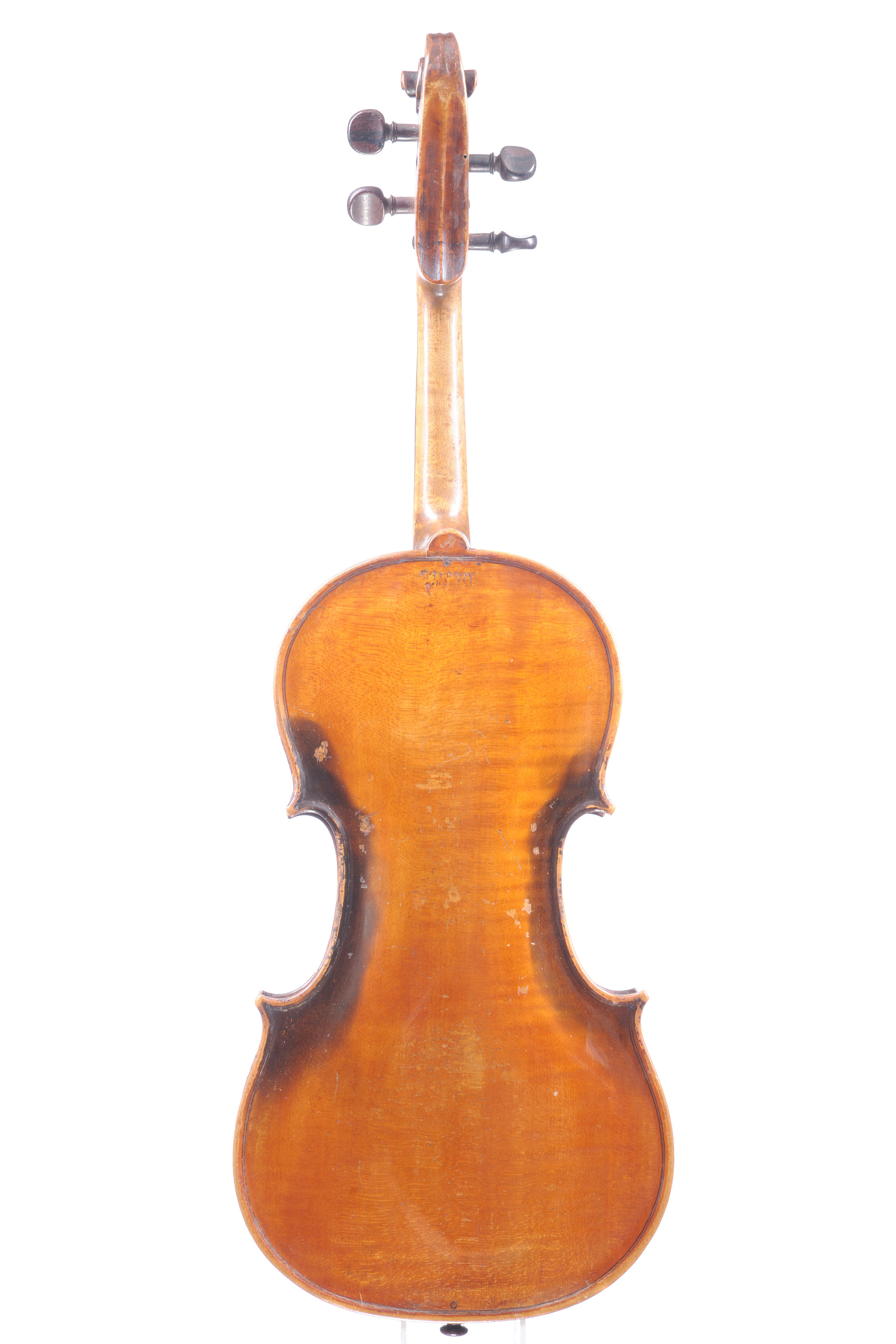 Fond d'une pièce. Vernis brun foncé doré. Porte une marque au fer au dos en dessous du talon du manche. Diverses cassures, et manques sur sa table d'harmonie. Décollé au tasseau.