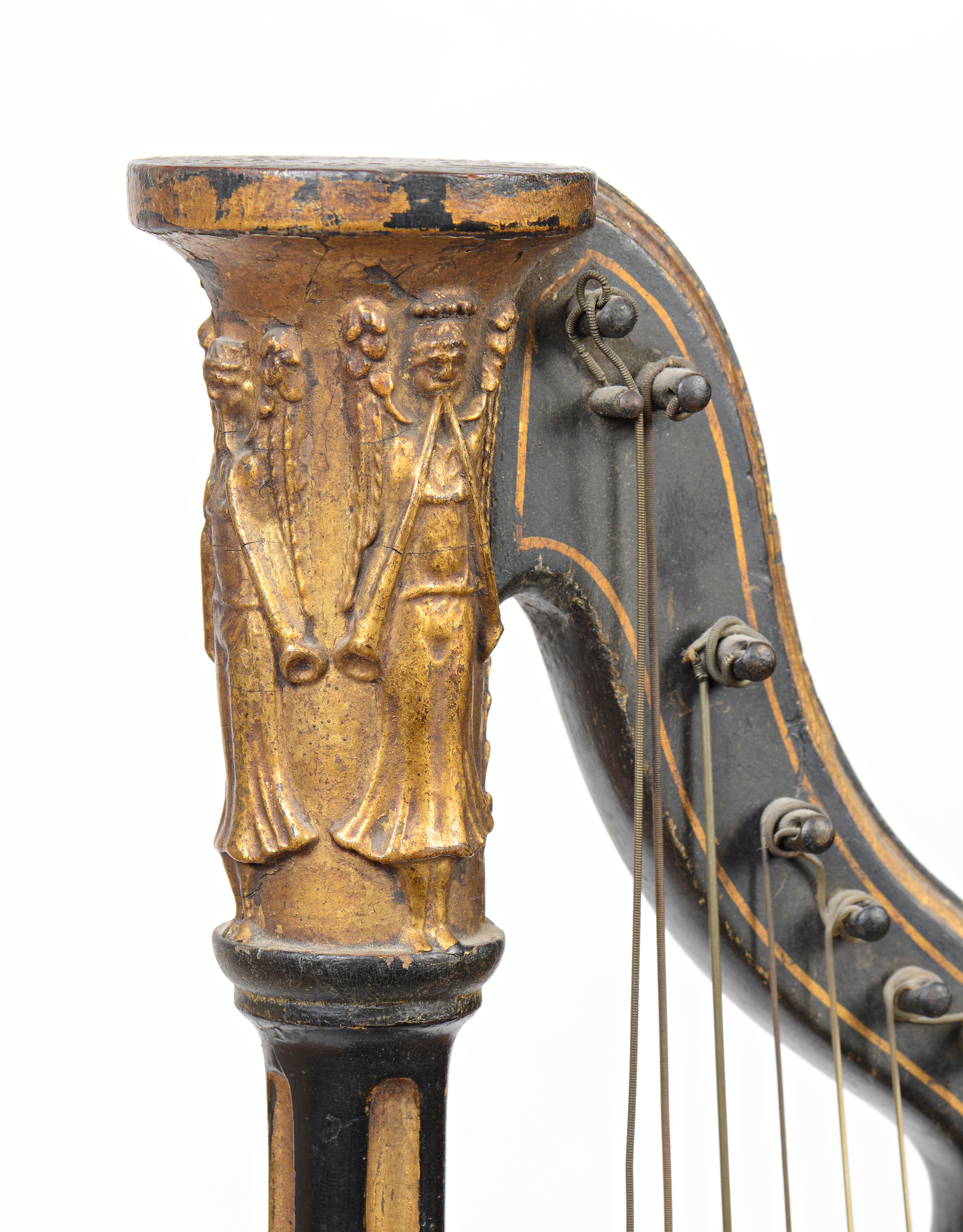 En bois laqué noir, et diverses dorures. Colonne à cannelures dorées. Chapiteau doré, et sculpté de personnages. A restaurer.