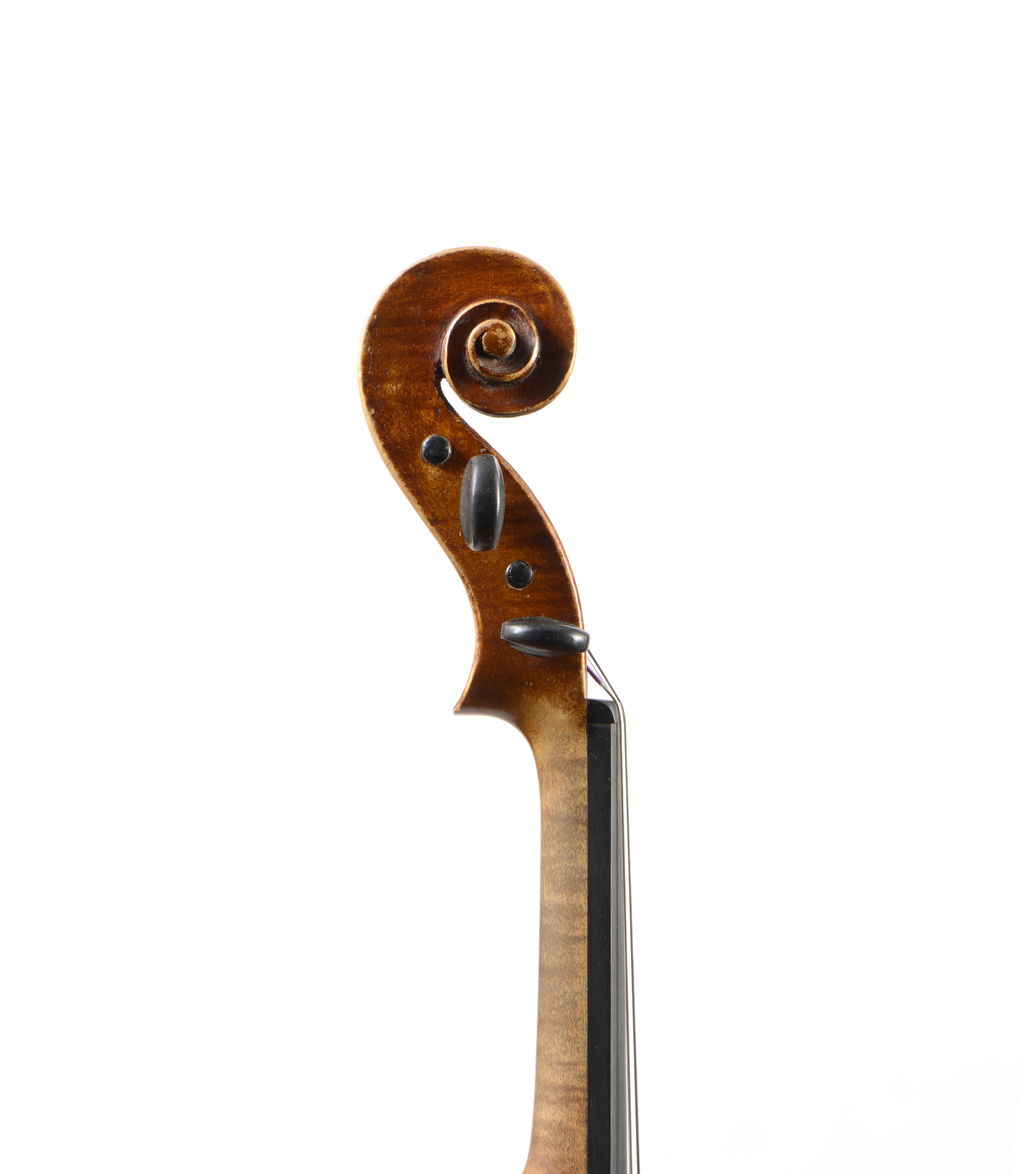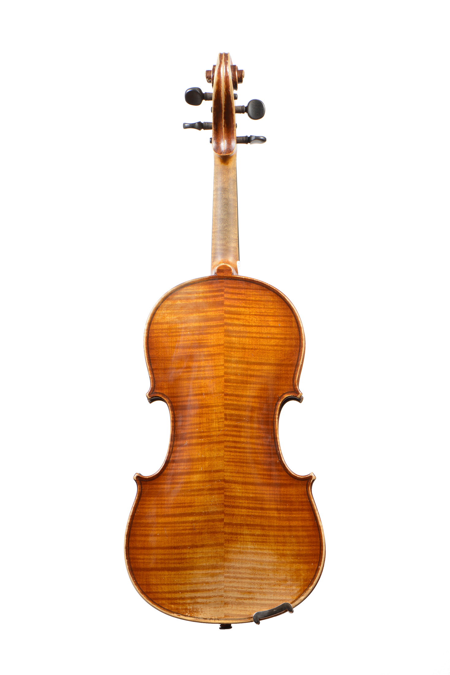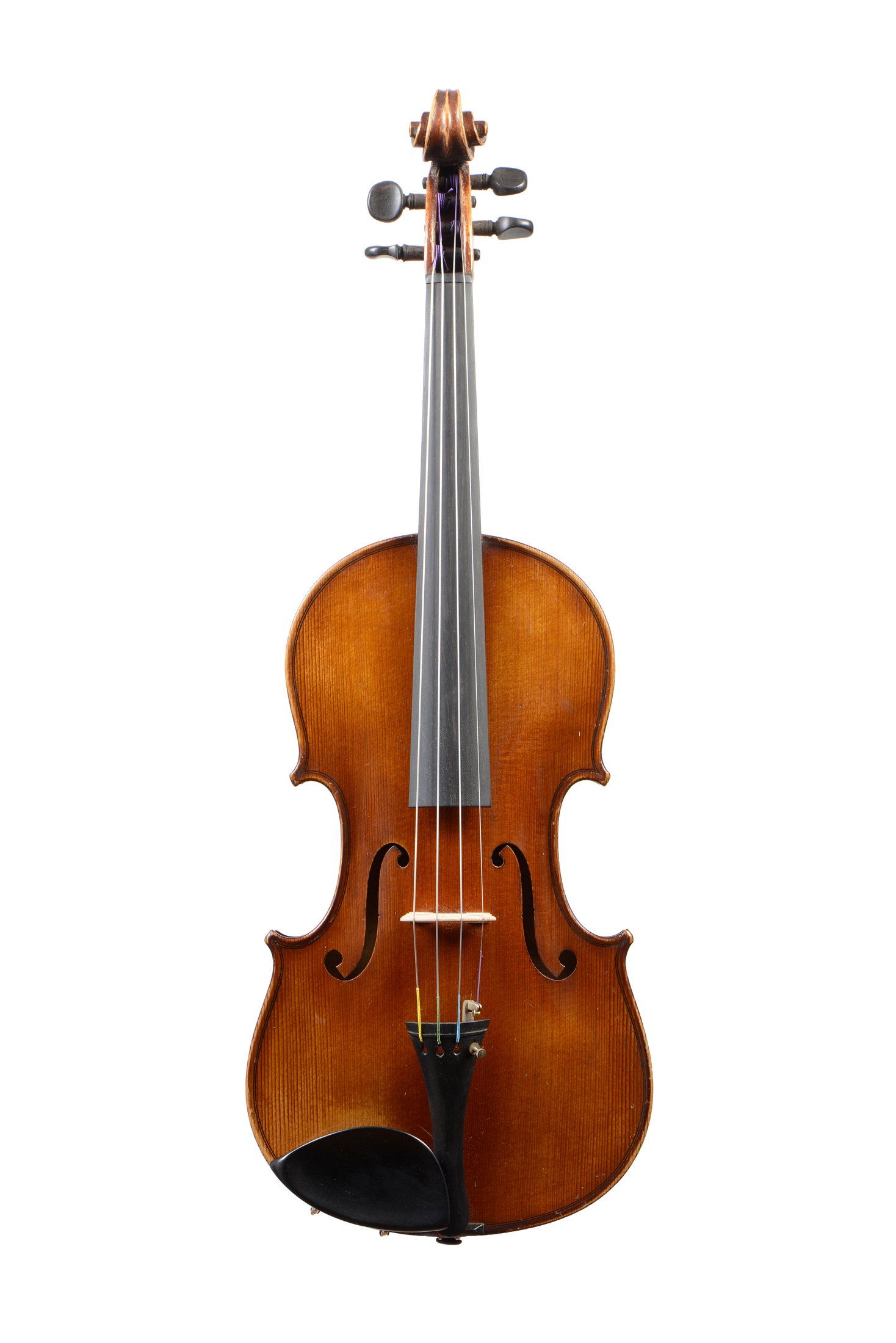Beau violon Français, fait vers 1930, en modèle de Stradivarius. Vernis brun sur fond doré. Avec boite et archet portant la marque BAUR. 360 mm.