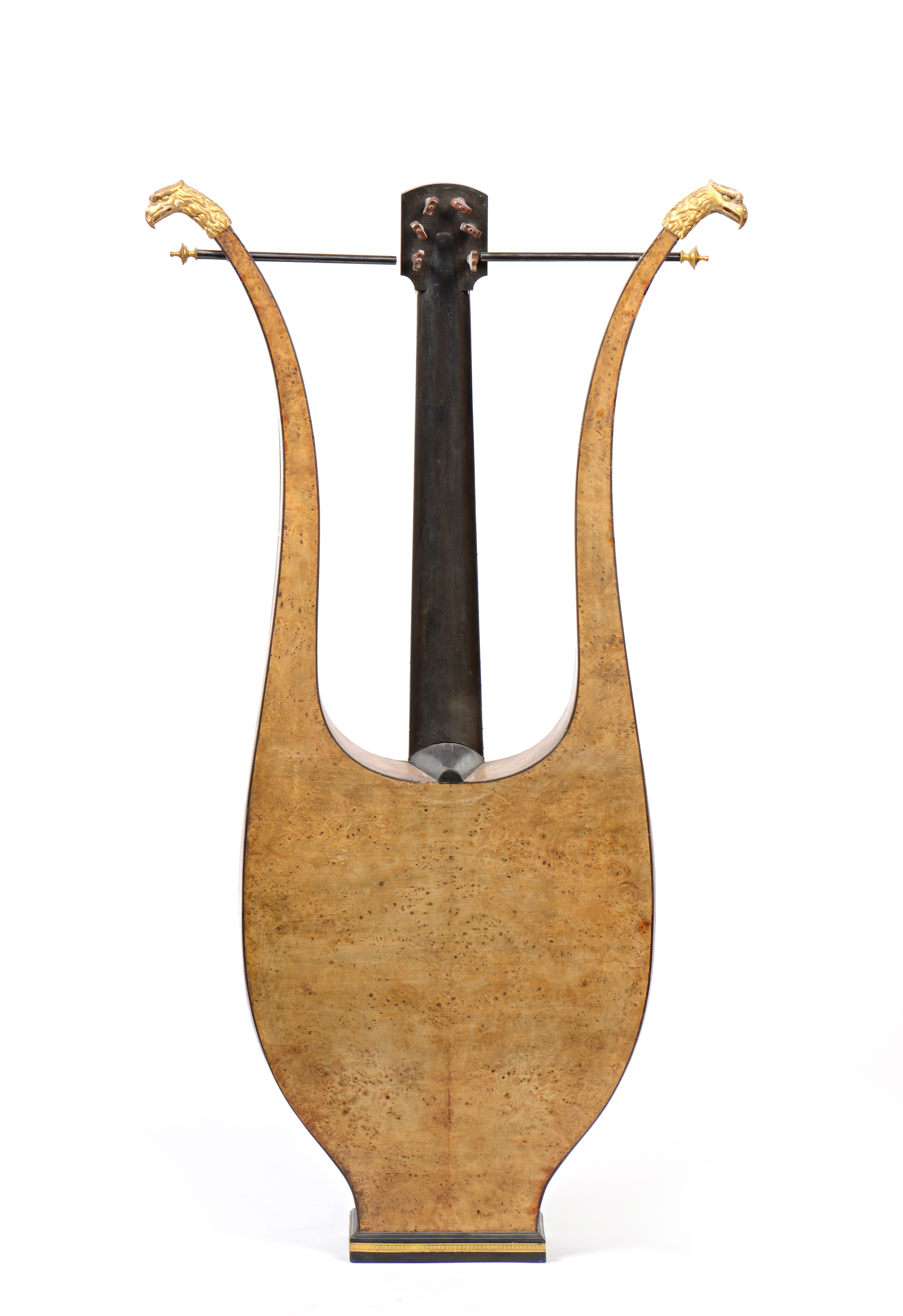 Le cheviller est plaqué ébène, entouré de deux têtes d'aigles, reliés à la tête par deux baguettes en ébène cannelée. L'ensemble est à restaurer.