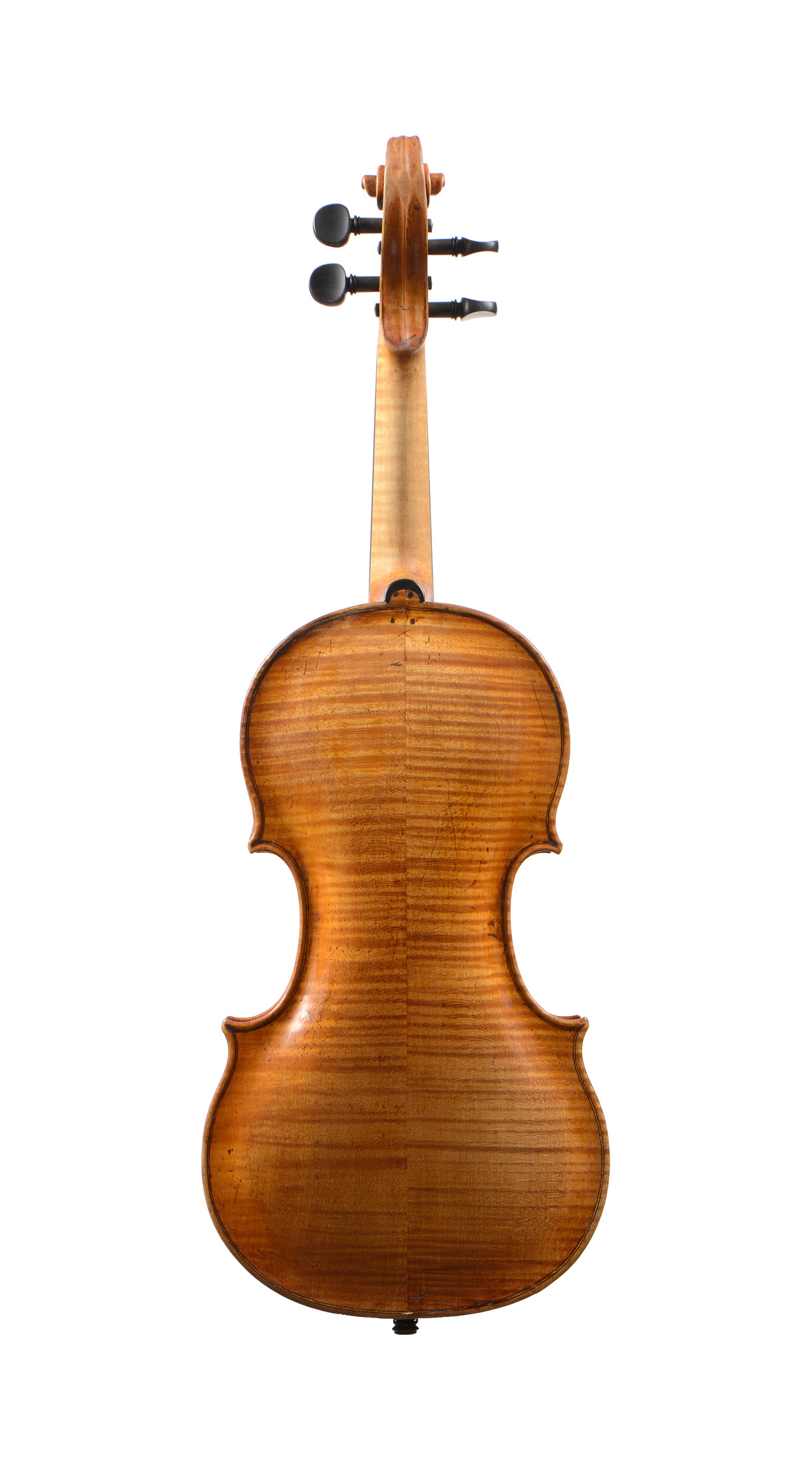 fait au XVIIIe. Probablement de l'école de Florence portant une étiquette de Lorenzo et Tomasso Carcassi au millésime de 1756. Fond de deux pièces aux ondes régulières horizontales. Tête et éclisses du même bois. Table en épicéa aux pores fins, s'élargissant sur les bords. Vernis brun doré. Diverses cassures à la table et aux éclisses, restaurées. 365 mm.