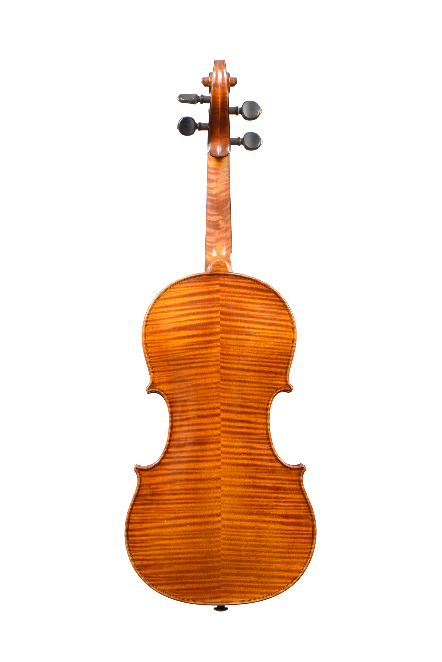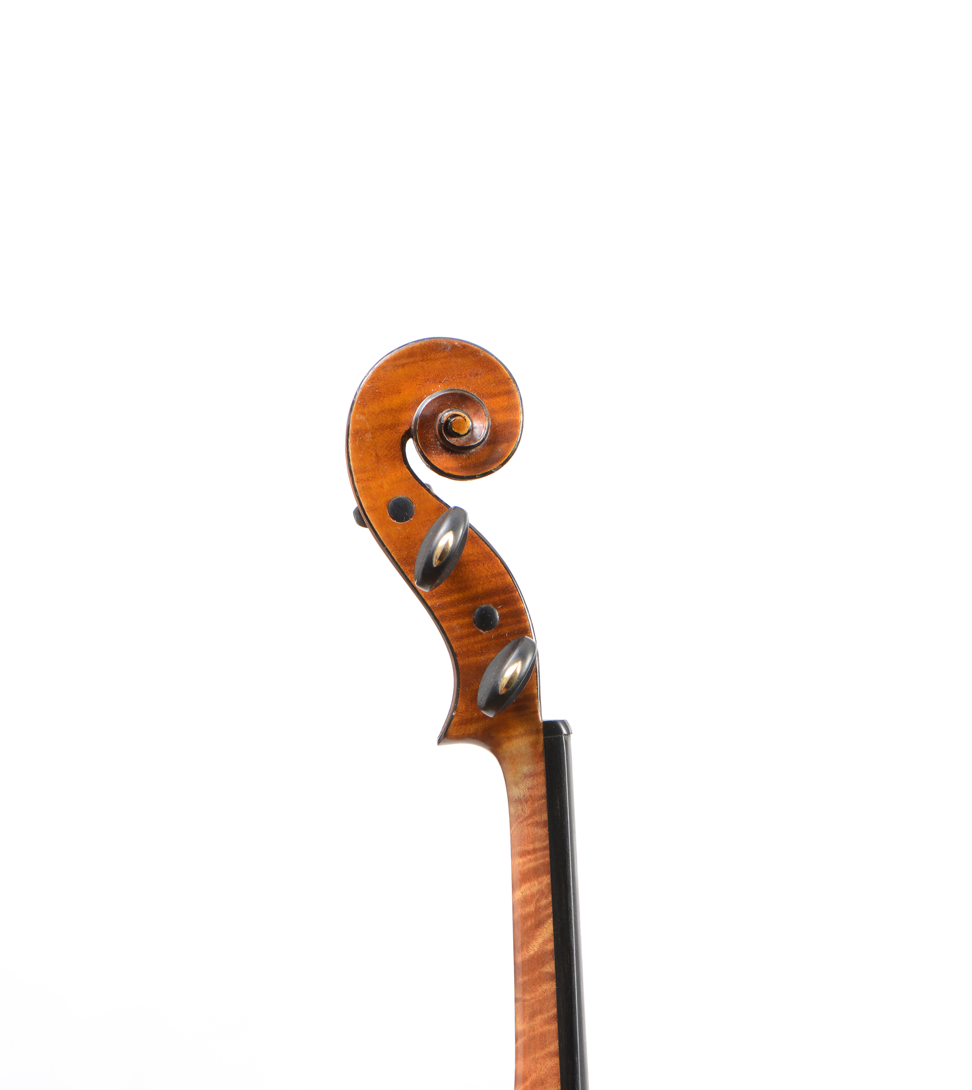 portant l'étiquette de "LABERT HUMBERT frères, à Mirecourt, en 1934. N°: 7020. Grand Prix, Exposition Bruxelles 1910". Fond de deux pièces en bel érable aux ondes plutôt fines. Eclisses et tête du même bois. 358 mm . En bon état: Une cassure restaurée sur le flanc gauche.