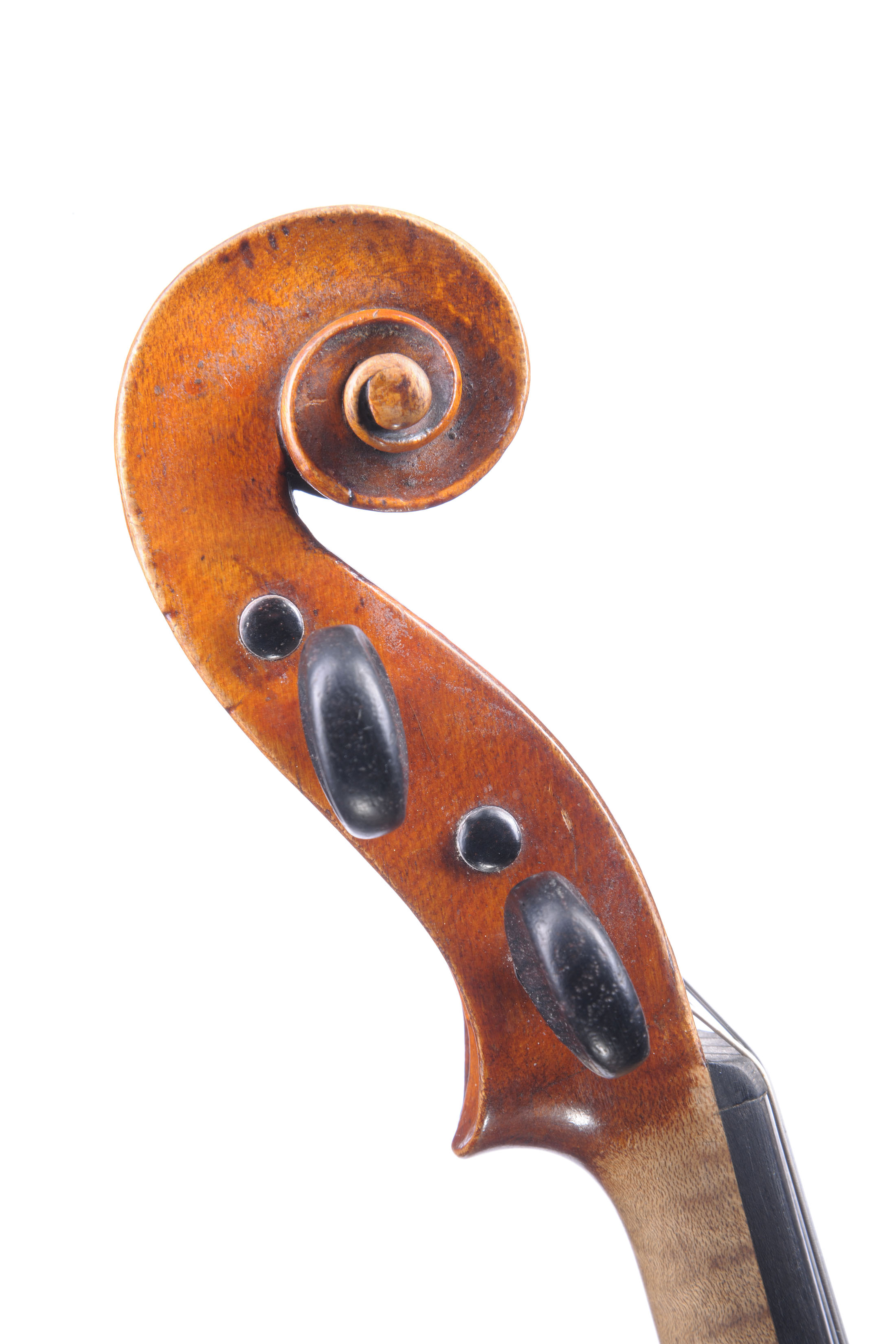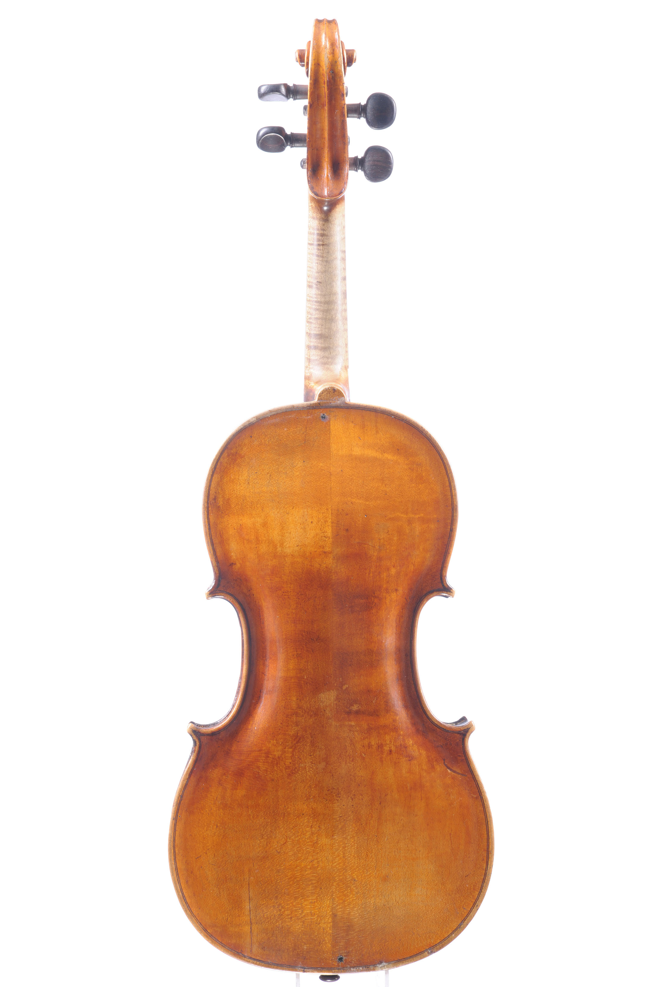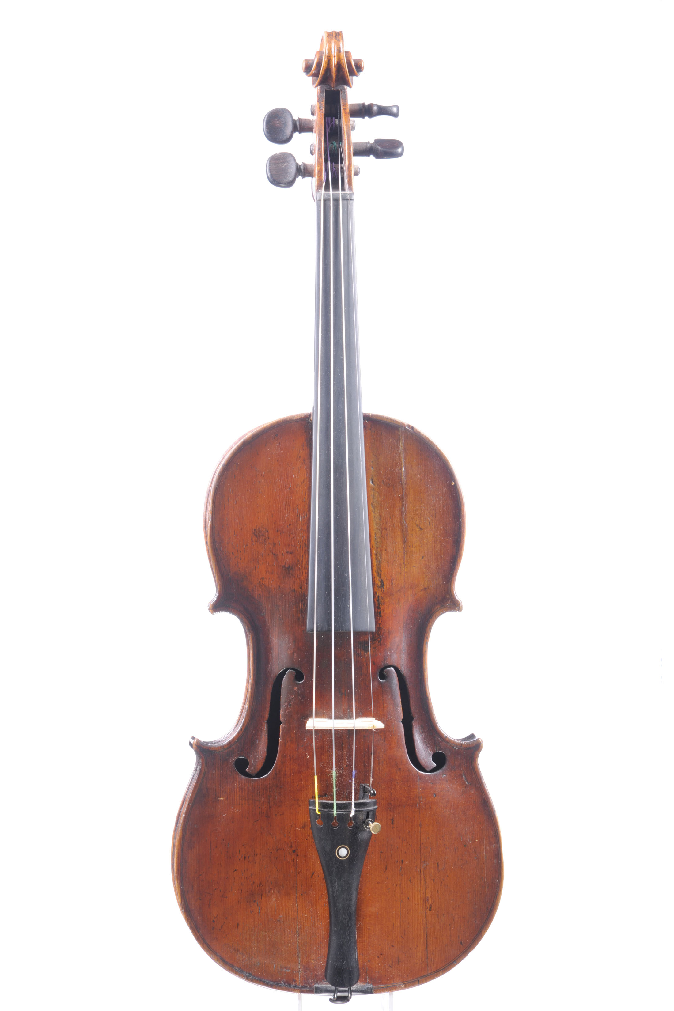 fait à la fin du XVIIIe . Fond de deux pièces en érable. Eclisses et tête du même bois. Table en épicéa aux pores fins et réguliers Deux cassures restaurées à la table. 357 mm. Avec son archet.