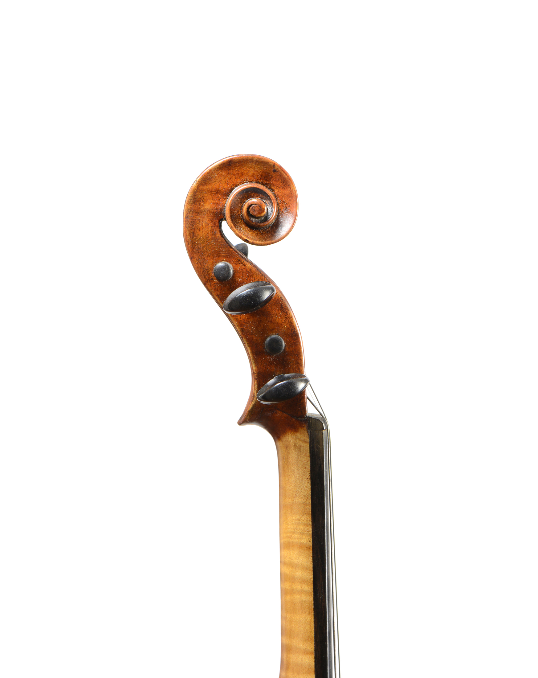 portant une étiquette "Jacobus Stainer", ainsi qu'une étiquette de réparation "Andrea Joesph GROB". Fond de deux pièces en érable. Eclisses et tête du même bois. Vernis brun sur fond doré. Avec boite et archet. Diverses cassures réparées. 350 mm.