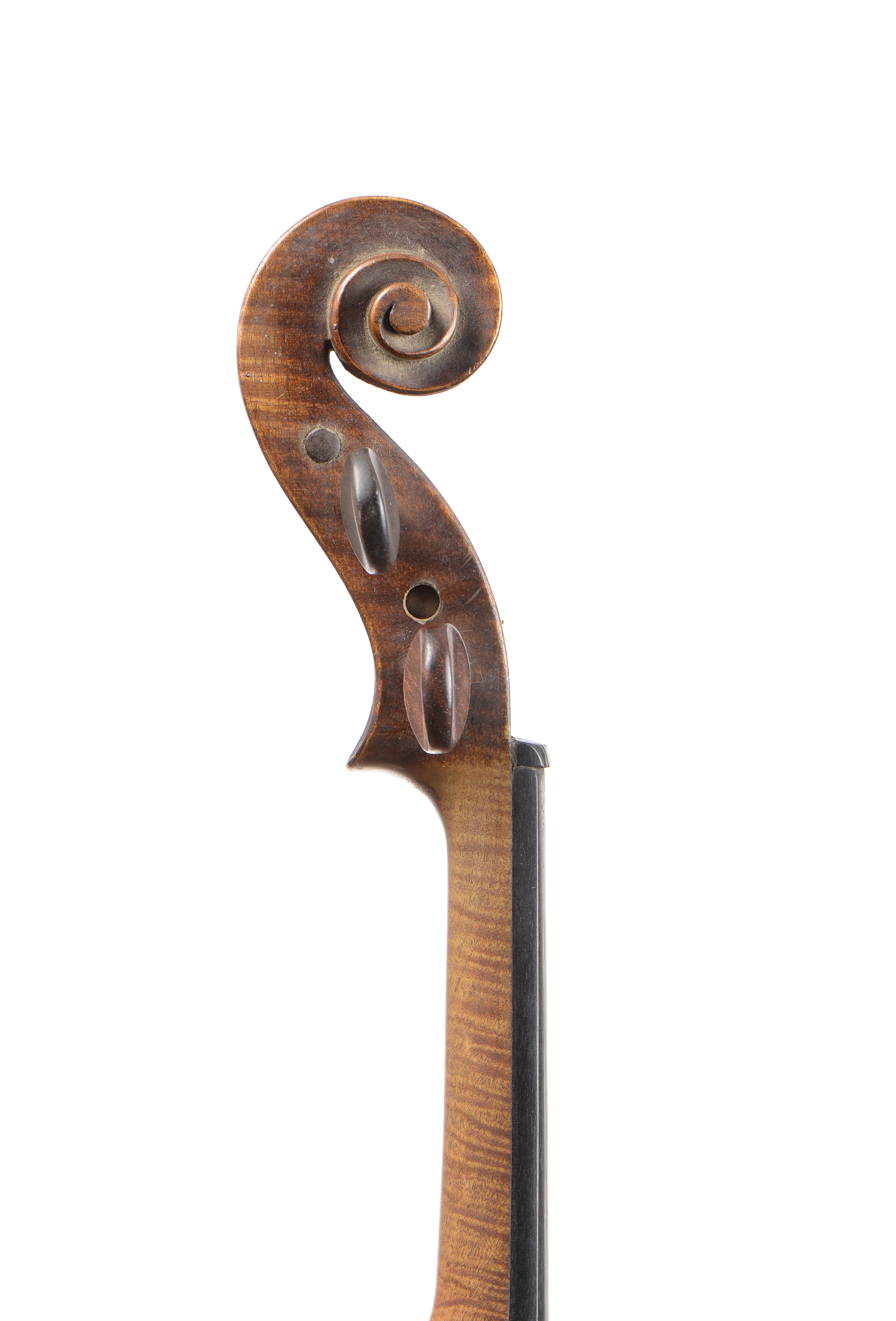 portant une étiquette Joseph Guarnerius 1735. Vernis brun sur fond doré. Cassures à la table. Avec son archet marqué, cassé à la tête.