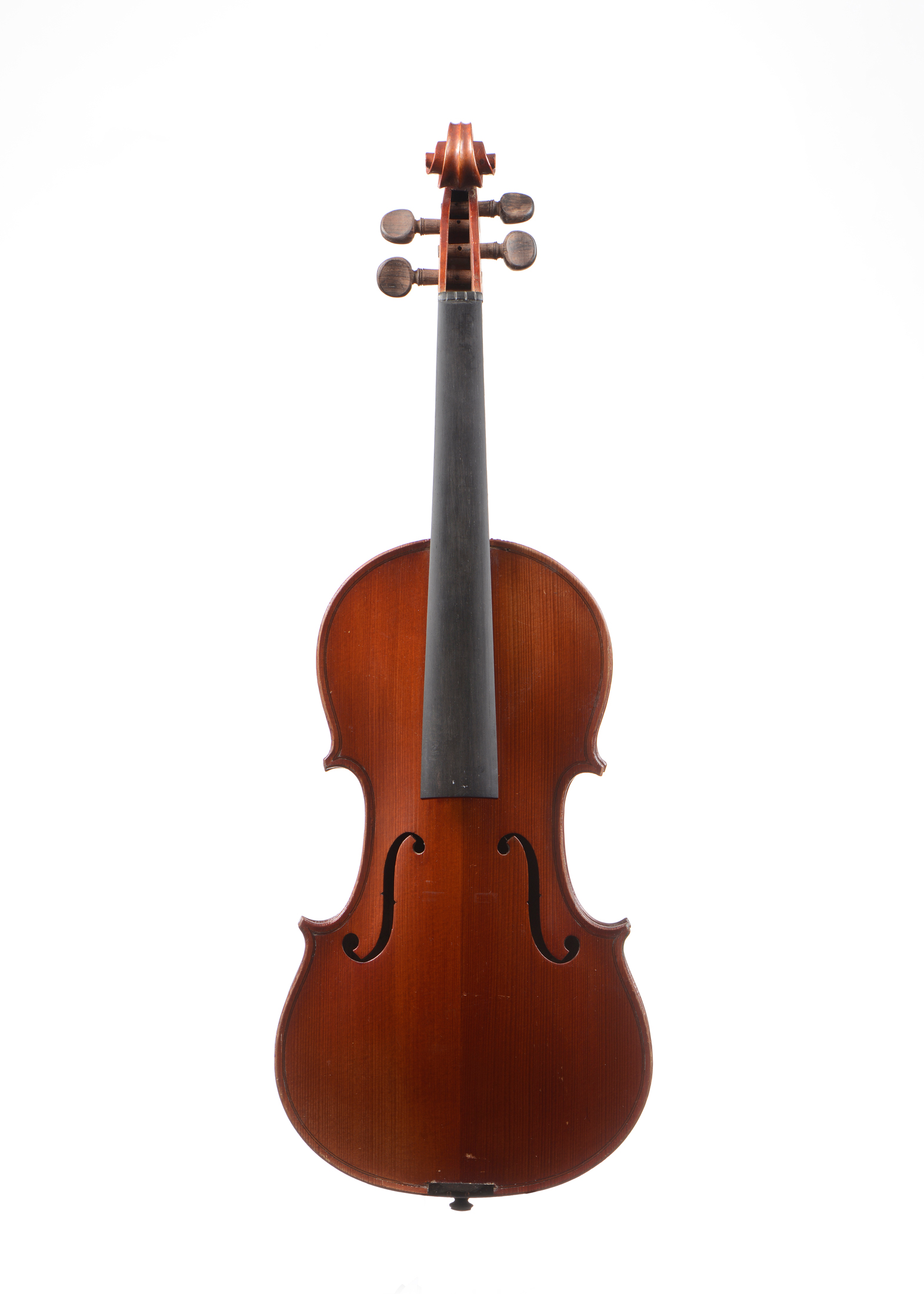 Violon d'étude portant l'étiquette "Dominicus Montagnana 1743." Vernis orangé brun sur fond doré. 359 mm.