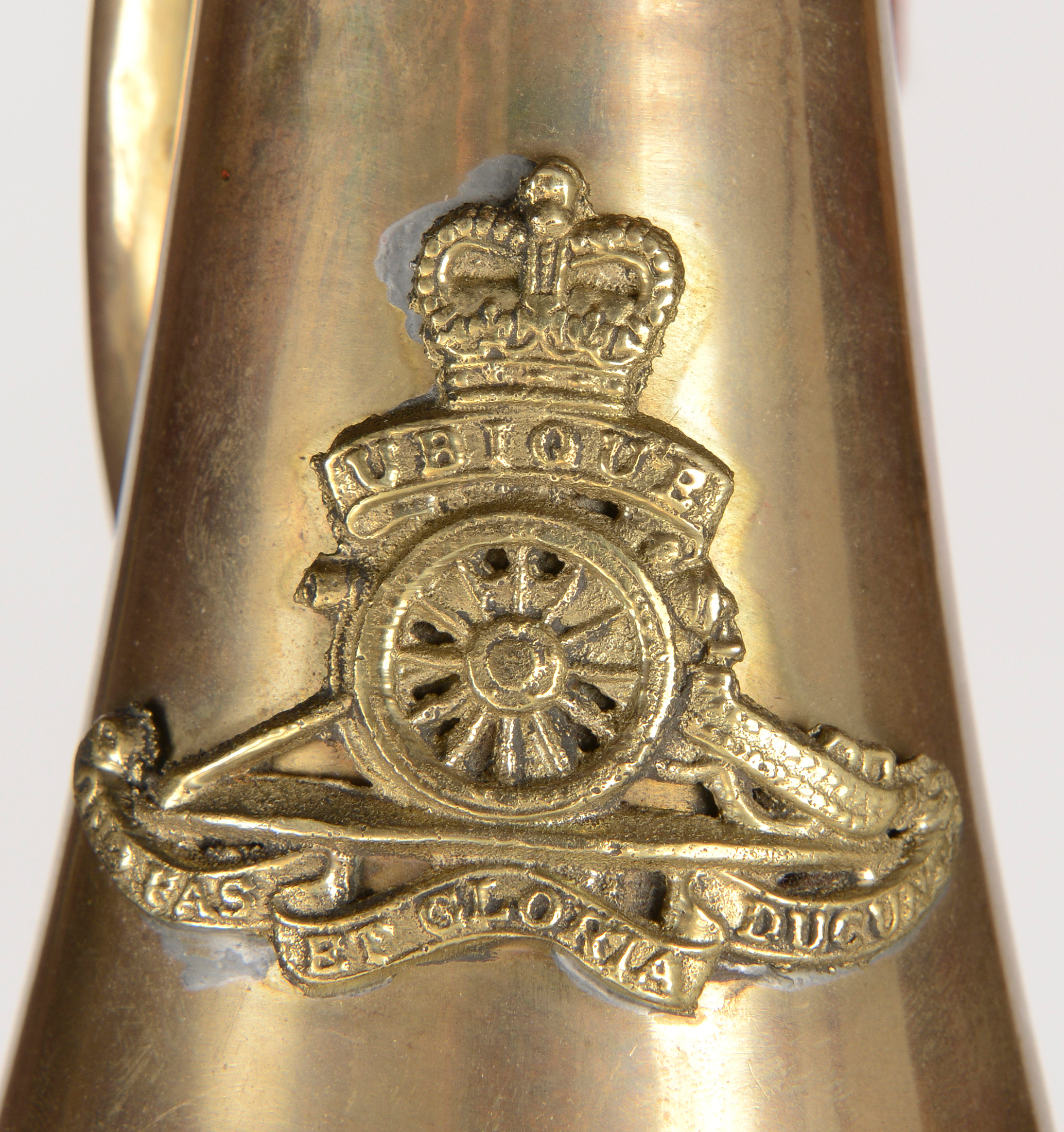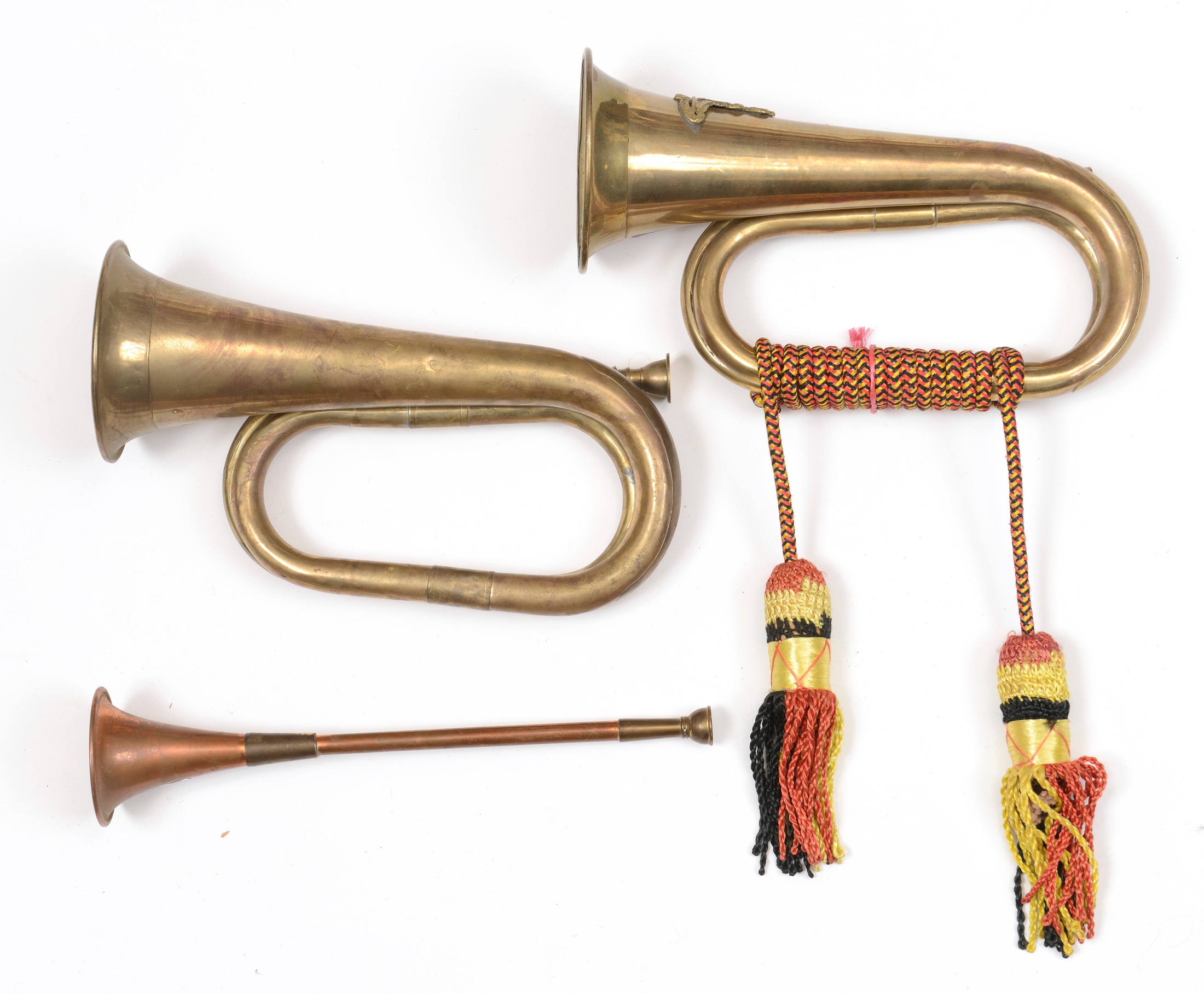 Deux clairons et une petite trompe, avec deux embouchures. Bossués, et rayés. L'un marqué "UBIQUE... Gloria..." A restaurer.