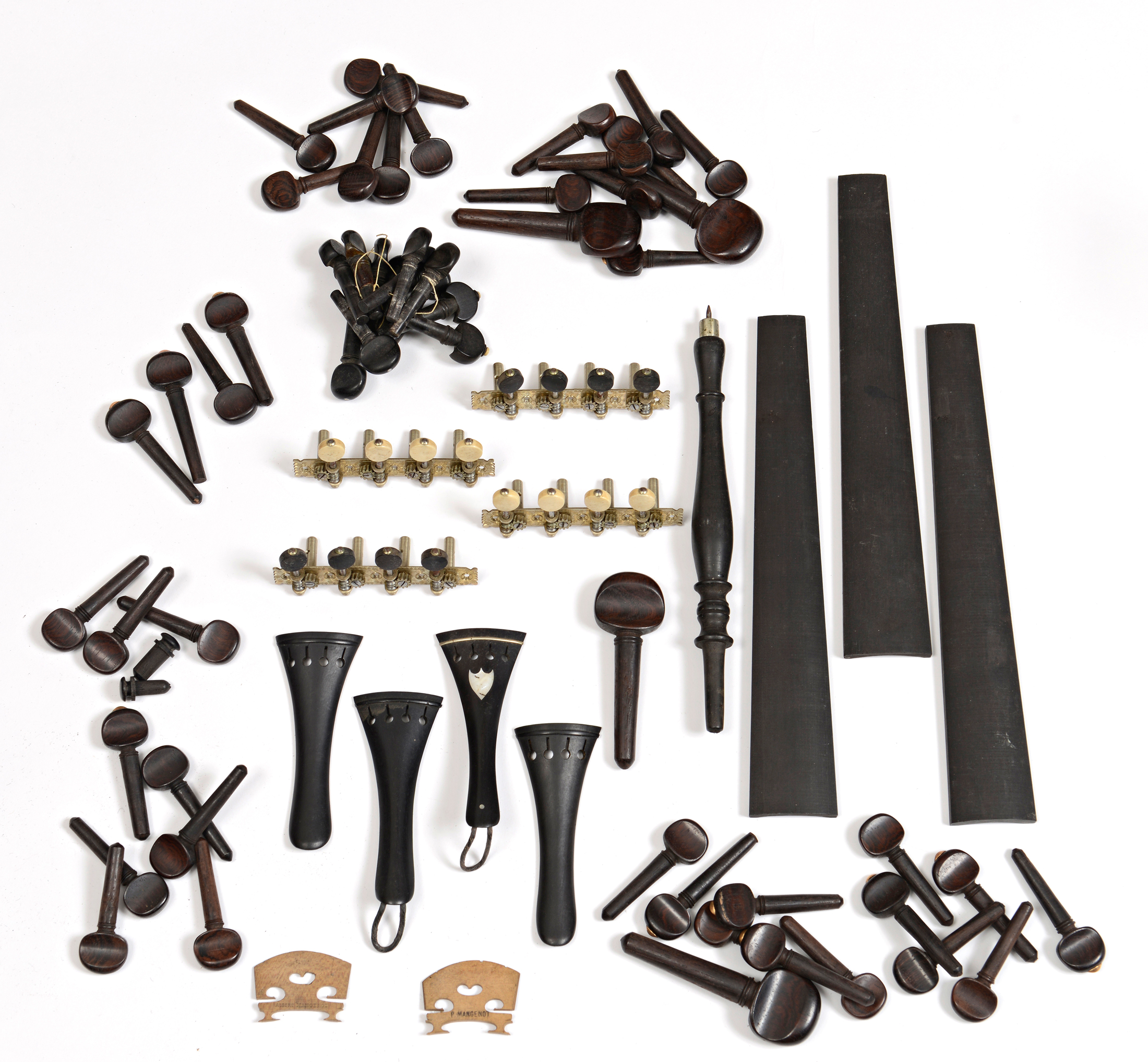 Deux jeux de mécaniques pour mandoline. Trois cordiers en ébène. Quatre touches pour violon en ébène. Une pique ancienne pour violoncelle. Deux chevalets pour violon. Ensemble de chevilles pour violon: 12 chevilles en ébène. 4 chevilles pour violoncelle en palissandre. 12 chevilles en palissandre avec des olives. 28 chevilles en palissandre pour violon. Deux boutons pour violon en ébène.