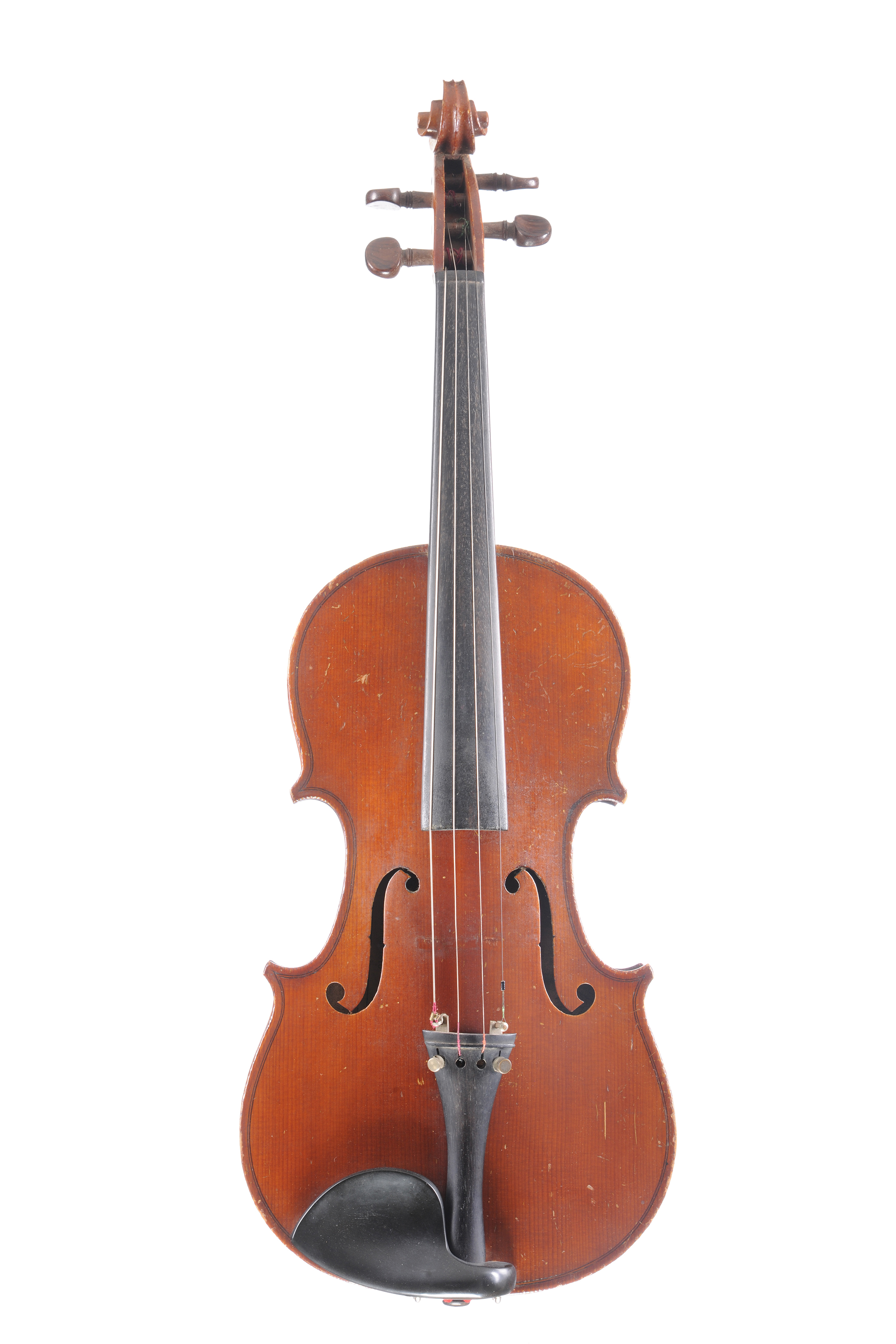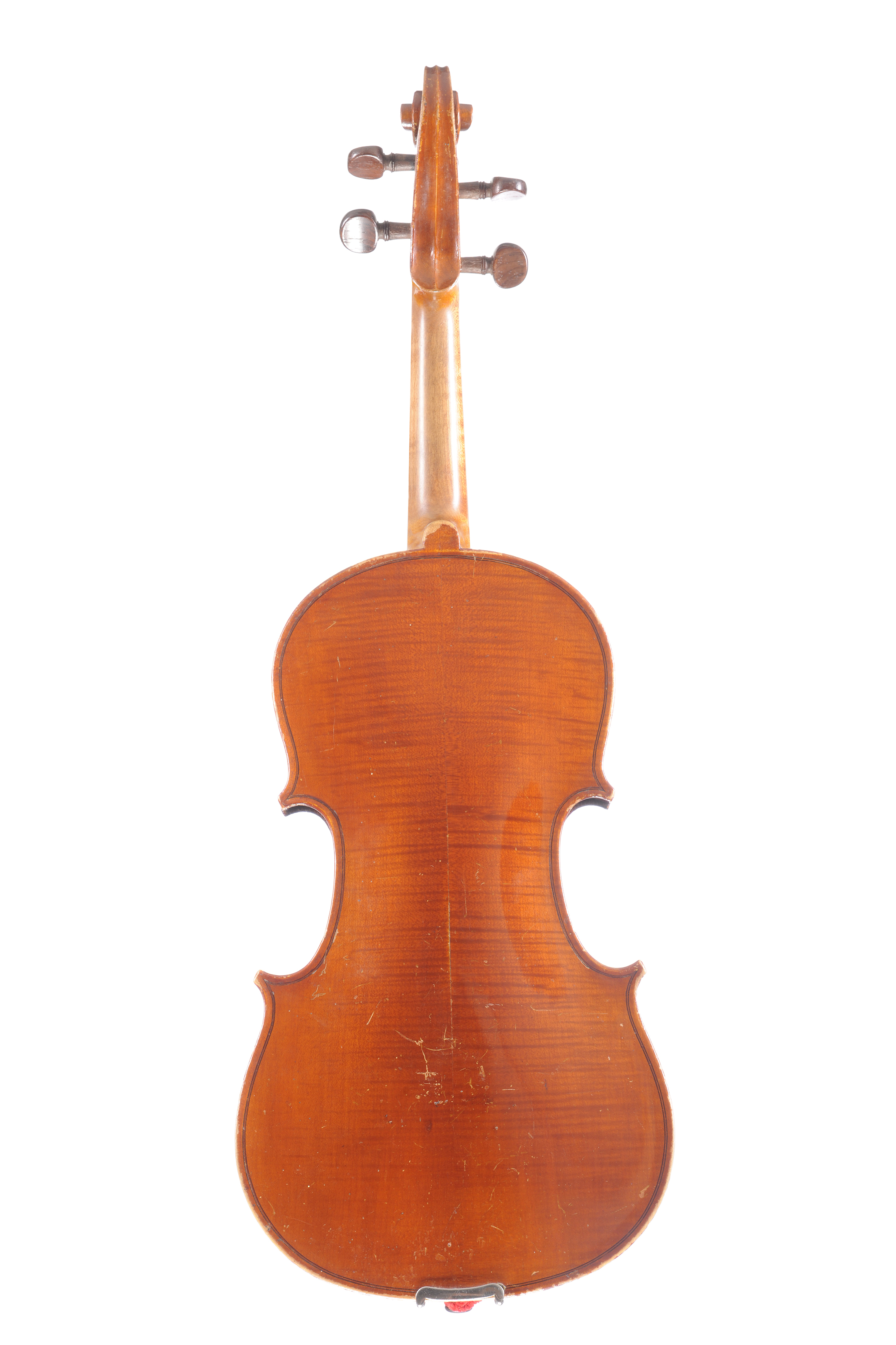 Violon fait à Mirecourt vers 1910 portant une étiquette de "Nicolas Bertholini, 1810". Fond de deux pièces (joint à revoir), ondes douces et régulières. Vernis orangé-brun. 357 mm. Avec boite et archet.