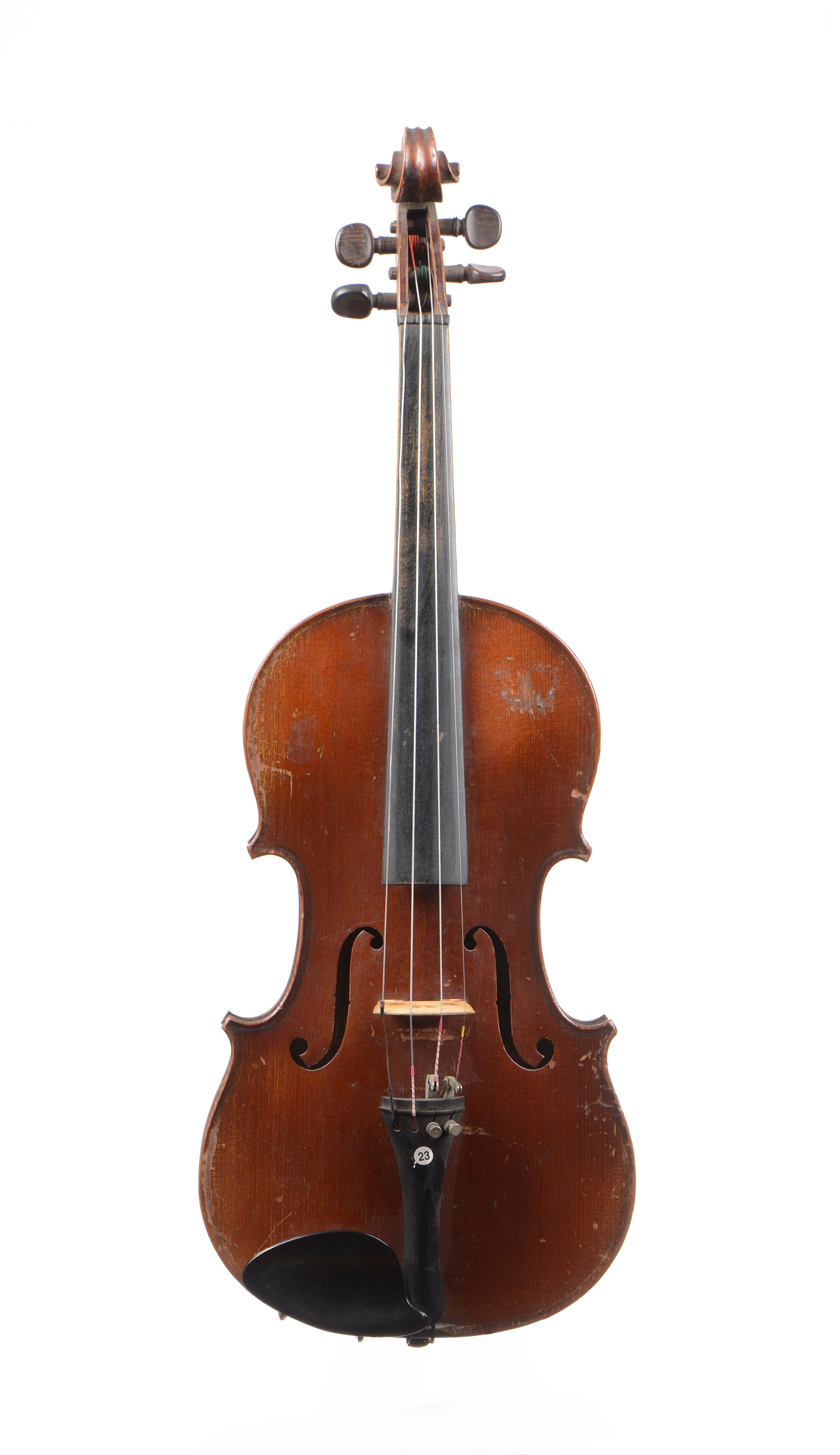 Violon Mirecourt fait vers 1900 en copie de J.B. Vuillaume, dont il porte l'étiquette, divers décollages, A restaurer, vernis brun orangé, 360 mm. Avec boite.