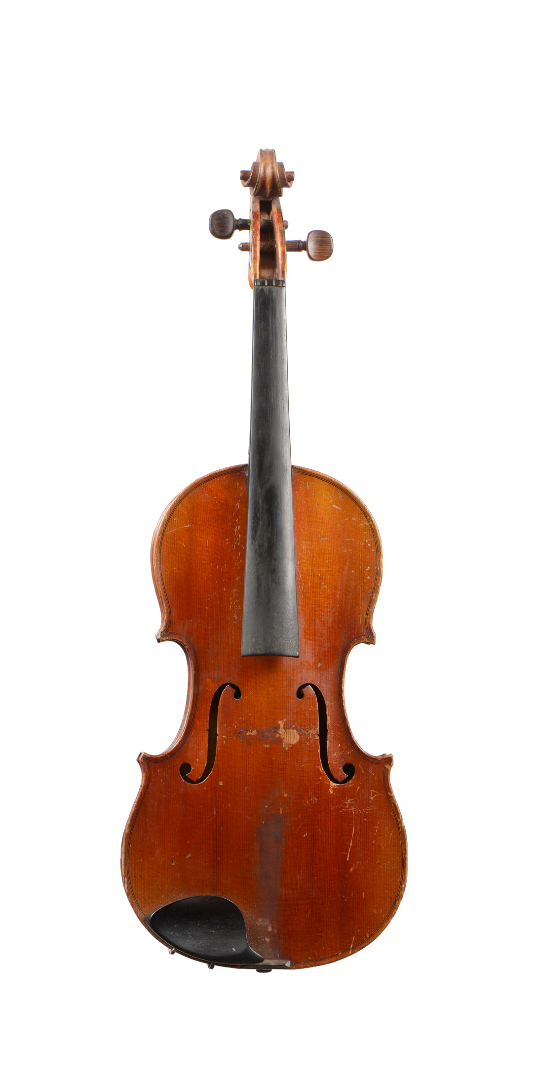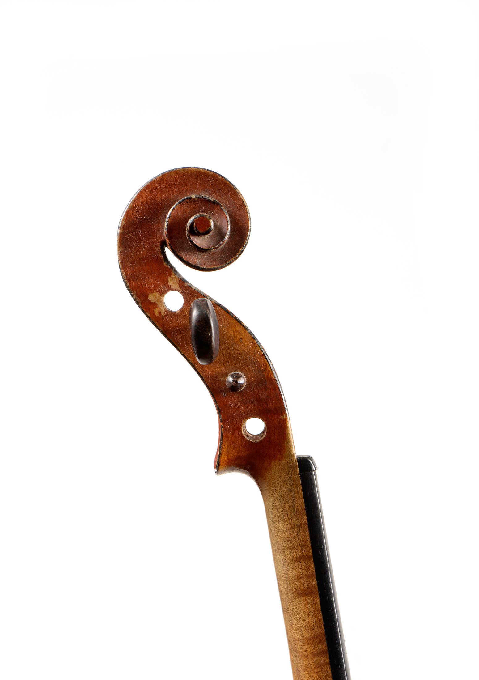 portant une étiquette VIOTTI N°2111 et la marque sur le talon du manche, fait vers 1900 à Mirecourt. Vernis légèrement abimé sur le fond. 359 mm. Avec boite et archet. Cassure d'ame.
