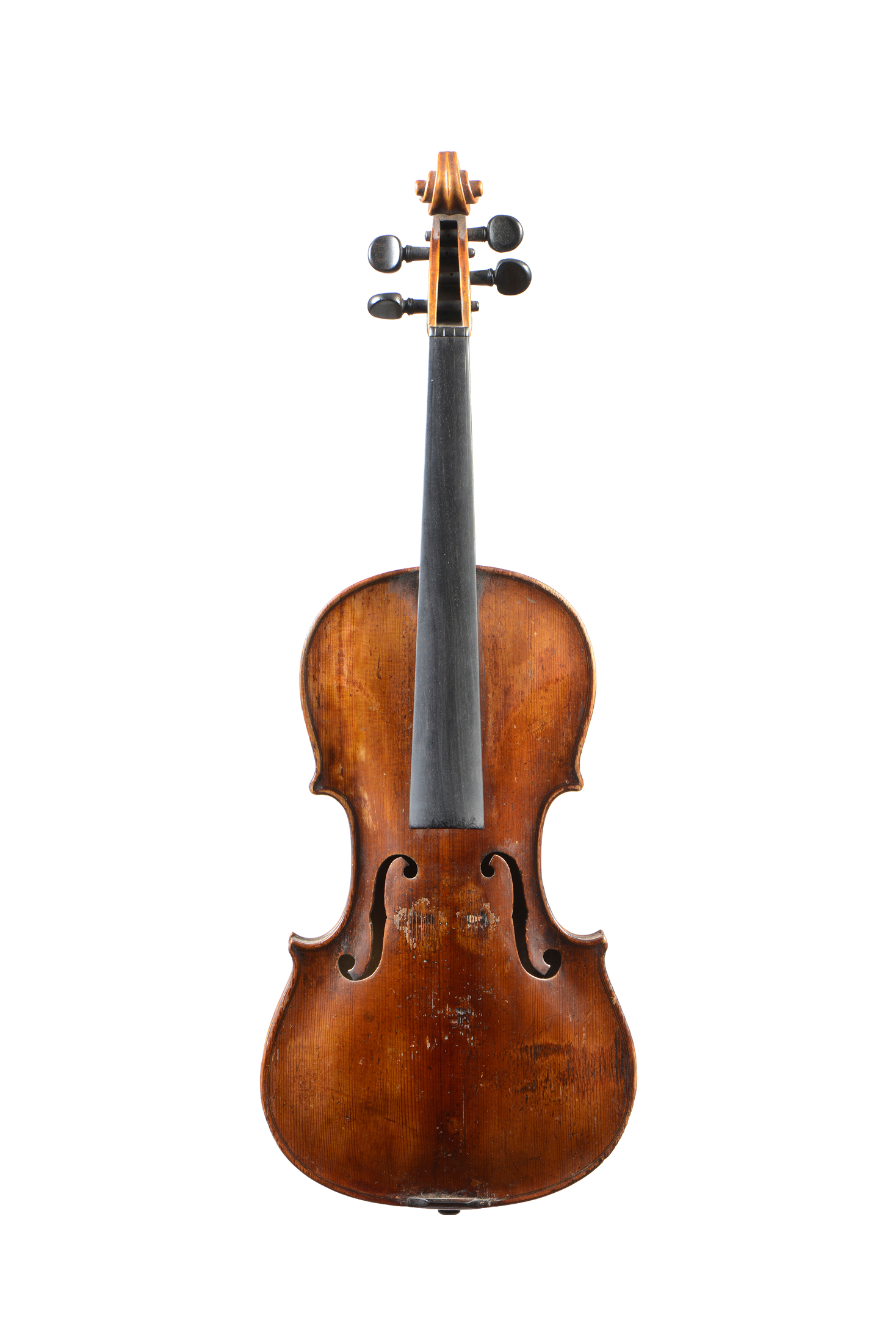 Fond de deux pièces en érable. Eclisses du même bois. Vernis orangé brun sur fond doré. Une cassure de table sur le flan gauche. 354 mm.