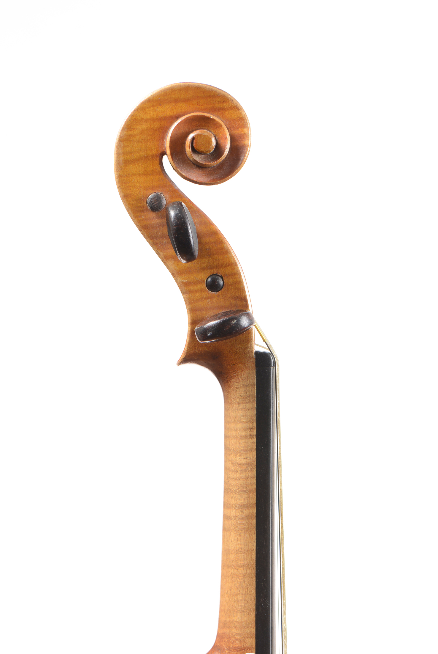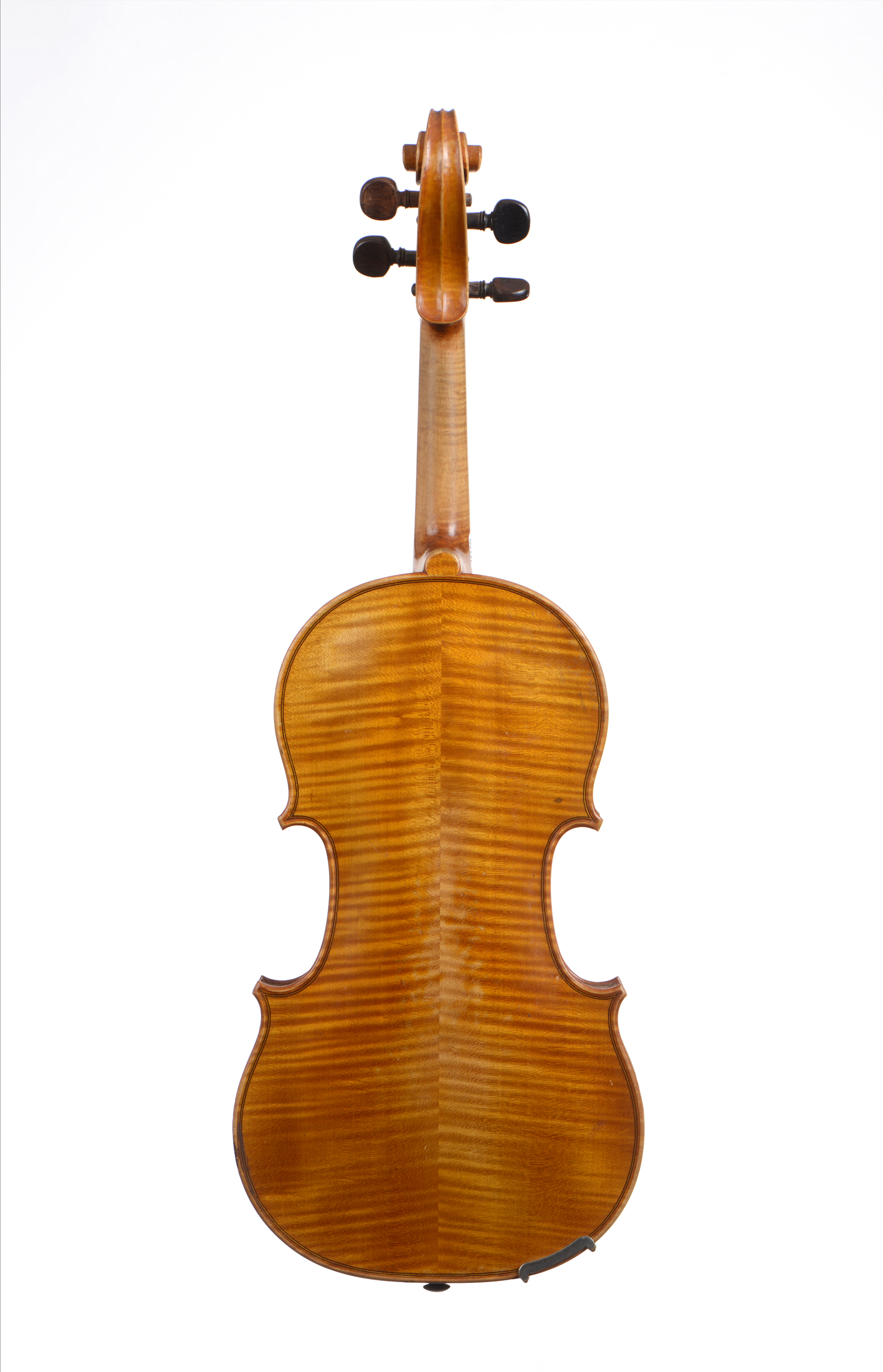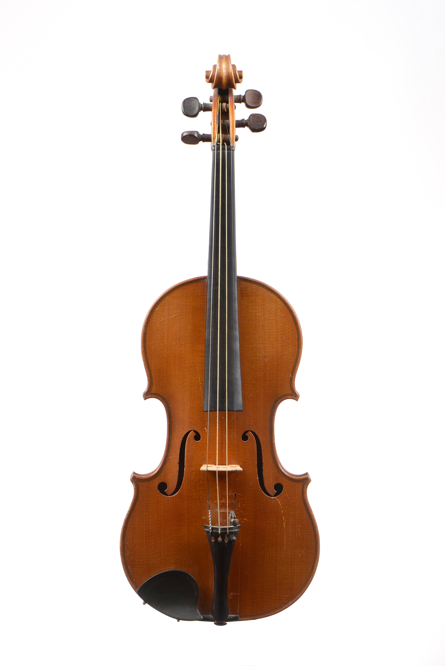 portant une étiquette de Mougenot Gauché, 1925. Fond de deux pièces aux ondes régulières. Fond de deux pièces en bel éraable aux ondes descendantes. Table en épicéa aux pores serrés au centre s'élargissant sur les bords. Cassure de table à restaurer, au dessus du sillet du bas. Vernis brun doré. 357 mm. Avec son archet.