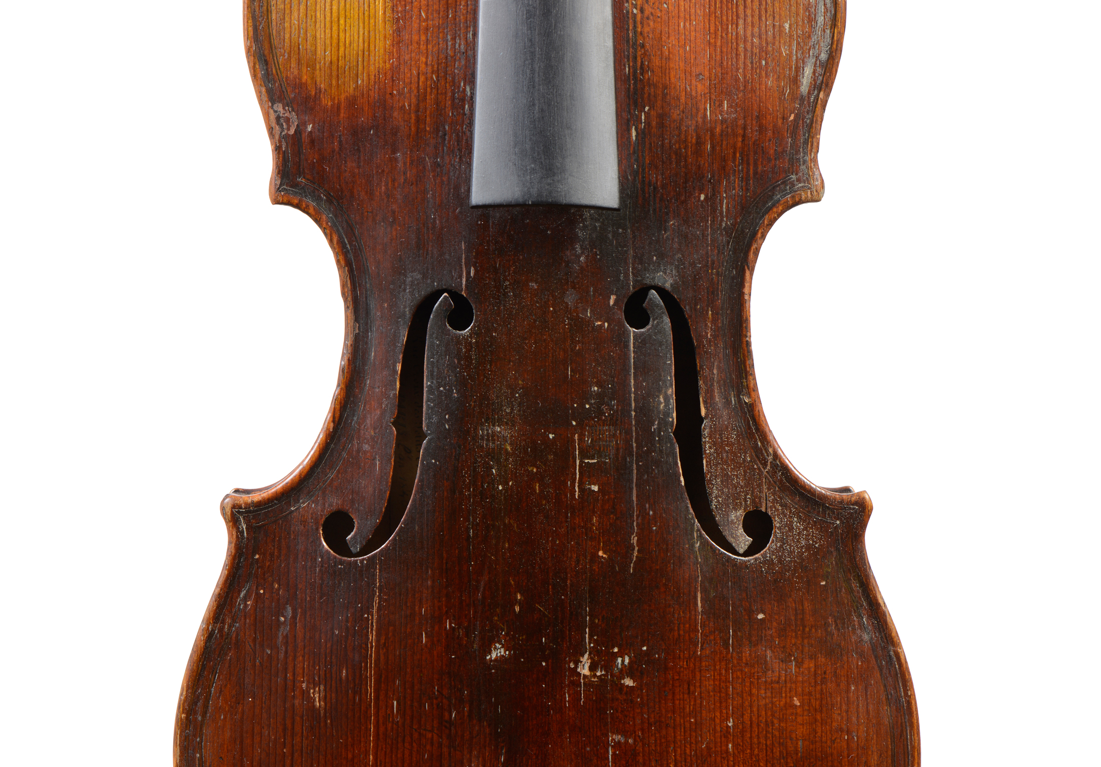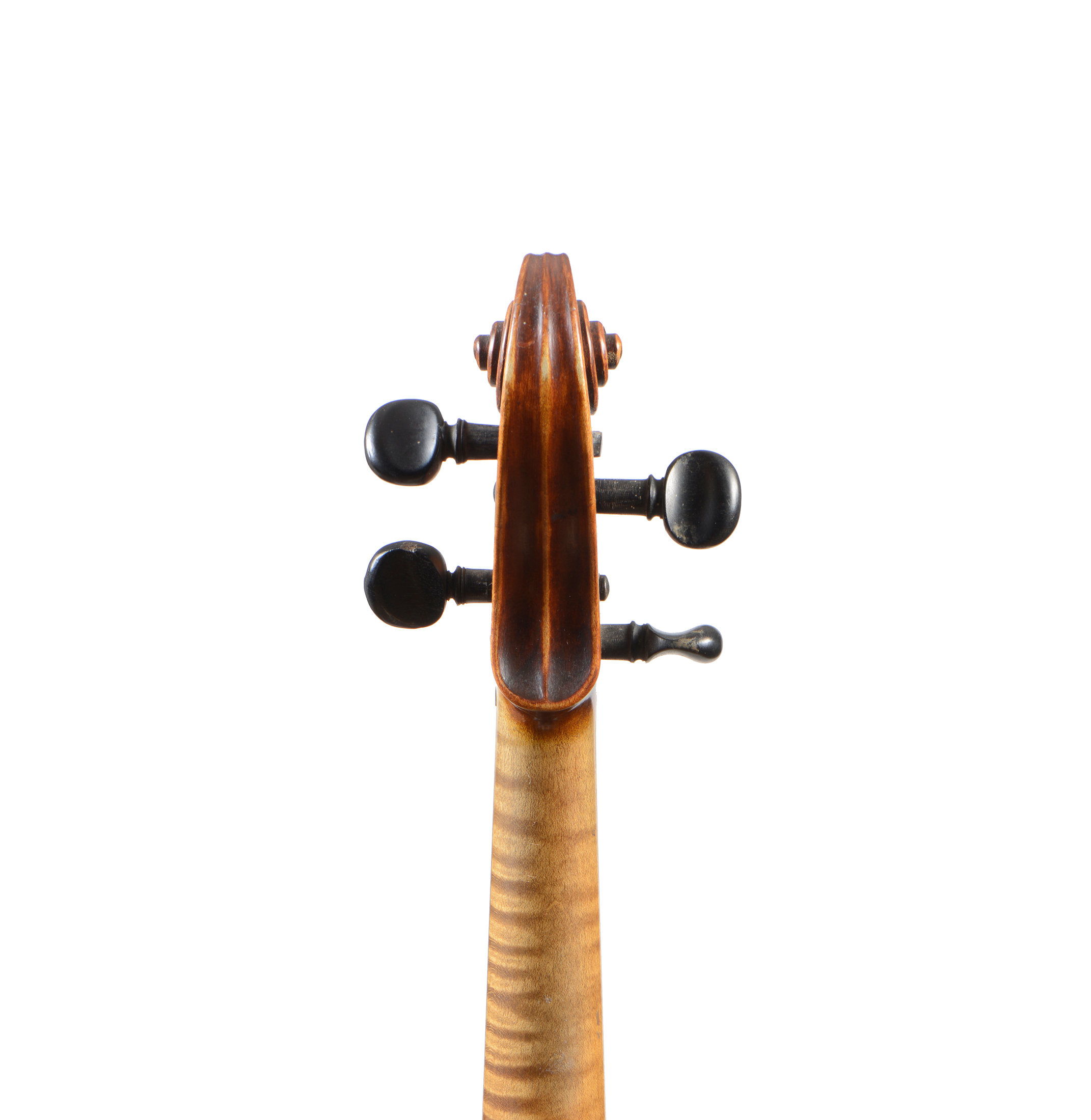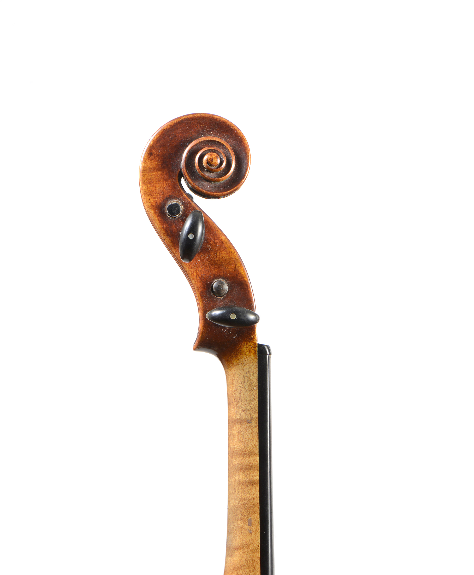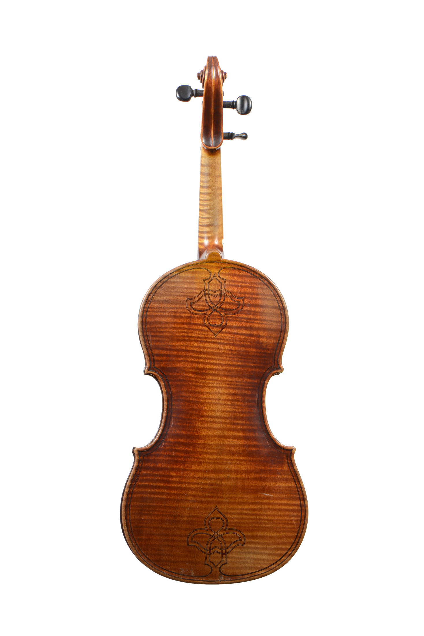 Dont il porte l'étiquette originale, au millésime de 1940. Fait en modèle de "Giovan Paolo MAGINI BRESSIA 1649". Tête à double volute. Diverses cassures sur la table restaurées. Double filets. Fond d'une pièce. 368 mm.