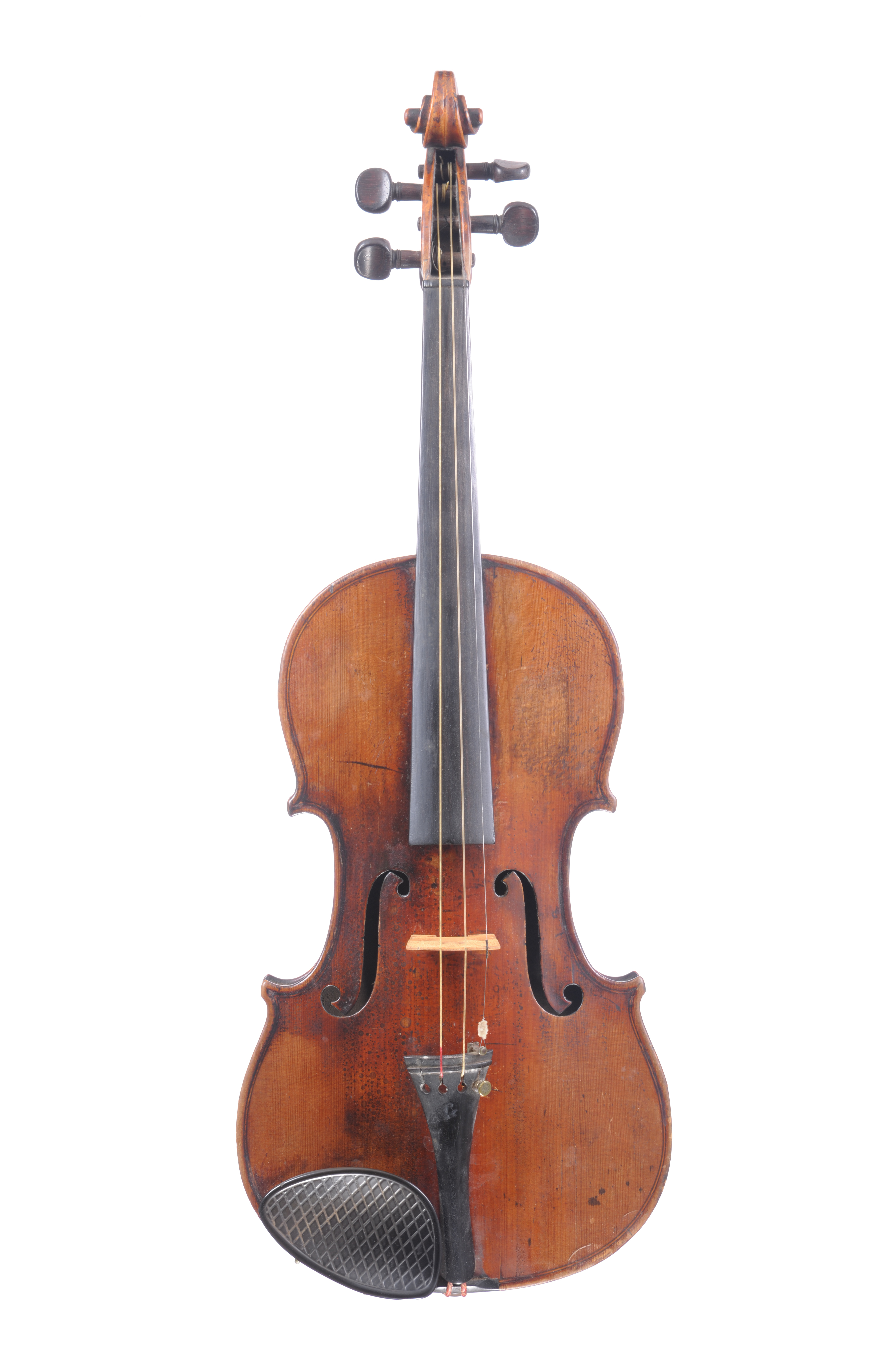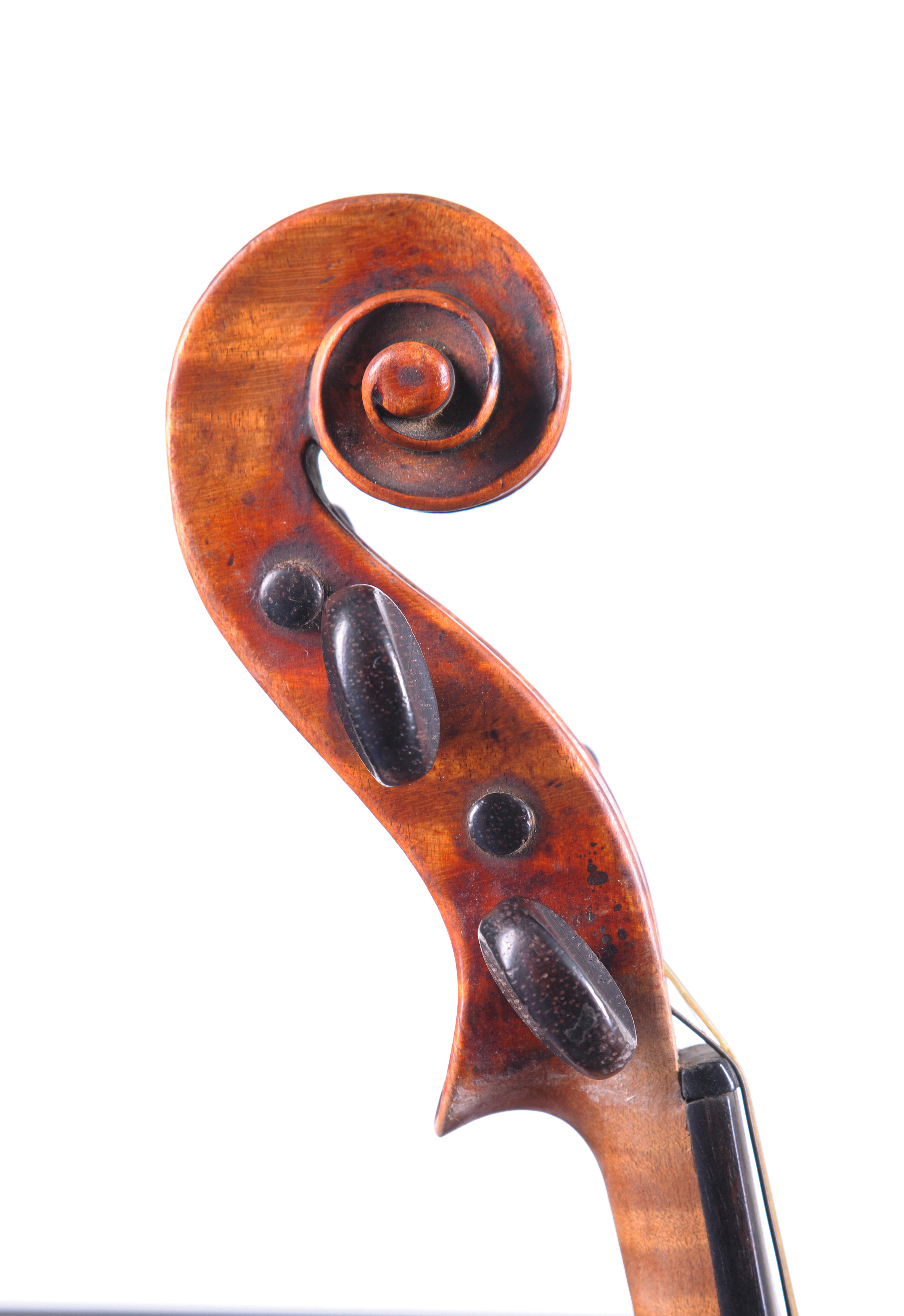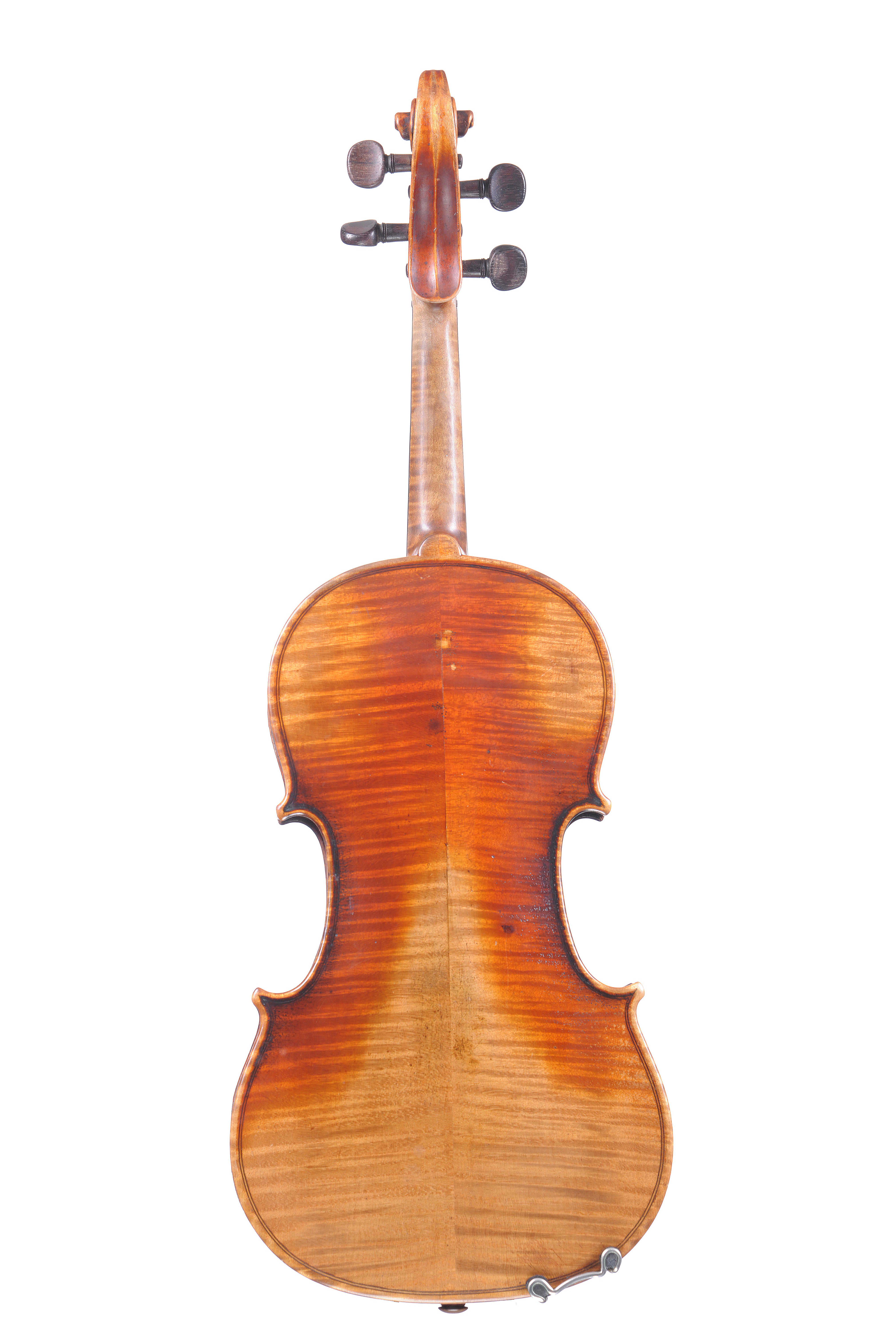 Violon Allemand. Fond de deux pièces en bel érable, aux ondes régulières, légèrement flammées. 356 mm. Diverses cassures. En l'état.