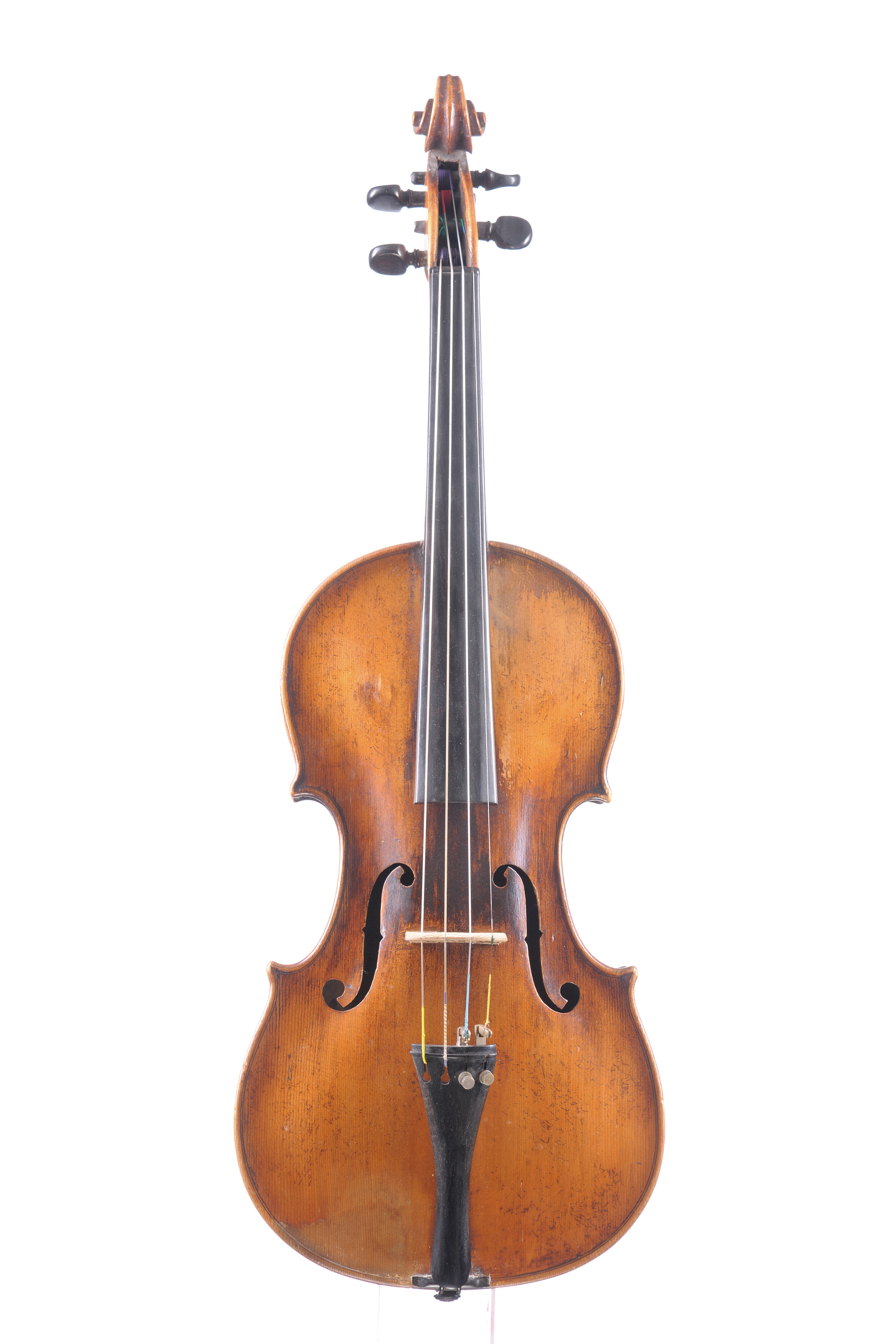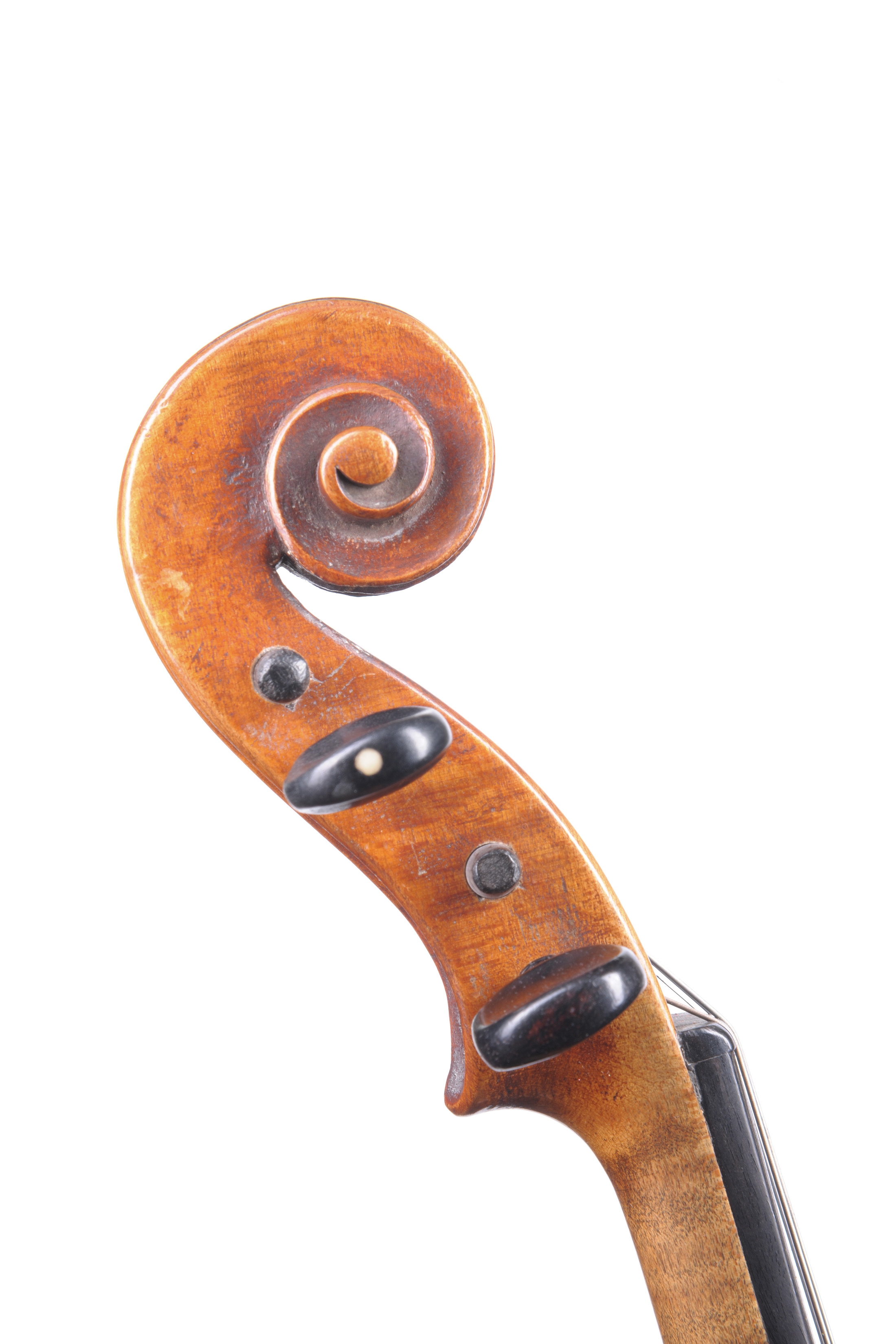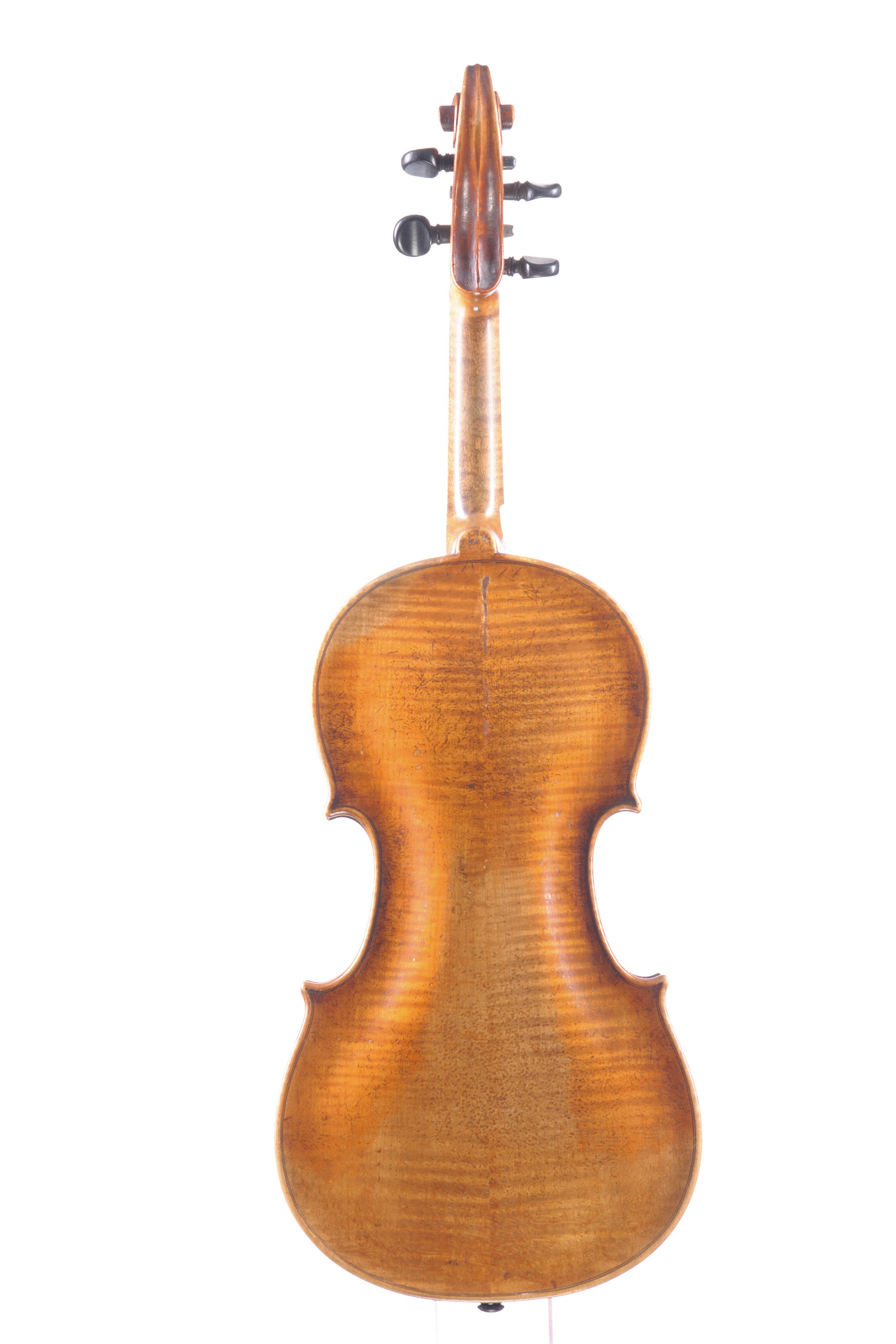 portant une étiquette apocryphe de Cappa. Traces de vers sur le fond, au tasseau du haut et sur les éclisses, rebouchées. 361 mm. Vernis brun doré. Avec boite et archet.