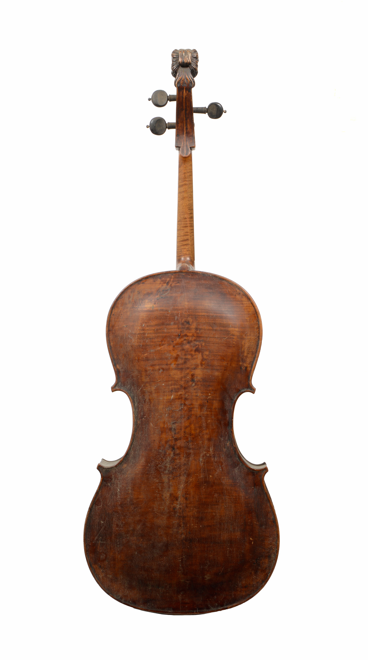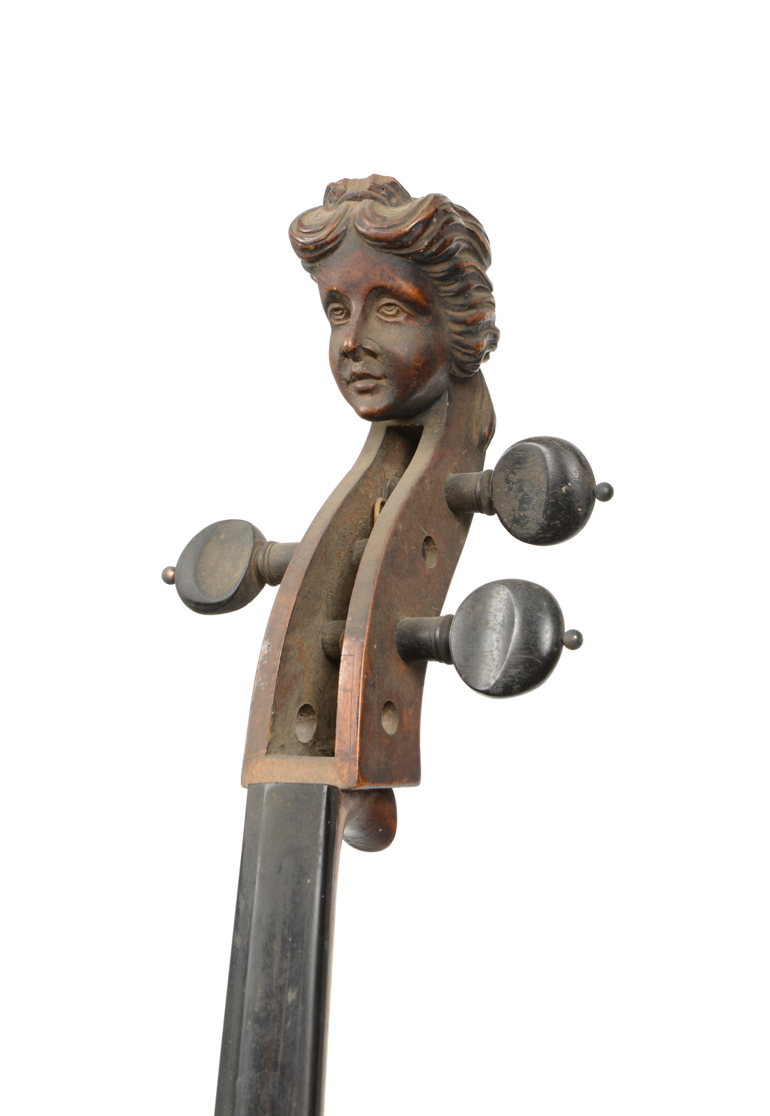 portant une étiquette de Antonio Carlo Bergonzi, avec une tête sculptée de femme. Fond de deux pièces en érable aux ondes régulières, horizontales. Diverses petites cassures sur la table. L'ensemble à restaurer. 757 mm.