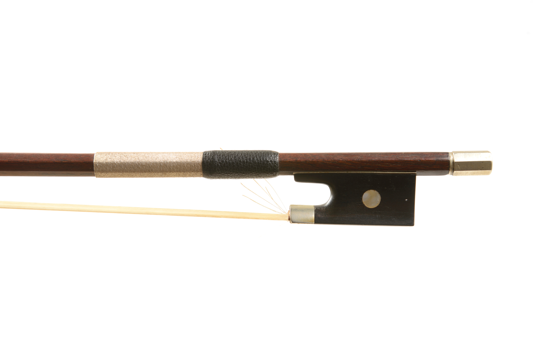 Baguette en pernambouc. Hausse ébène montée maillechort. Garniture argent sur soie et une mèche usée.