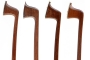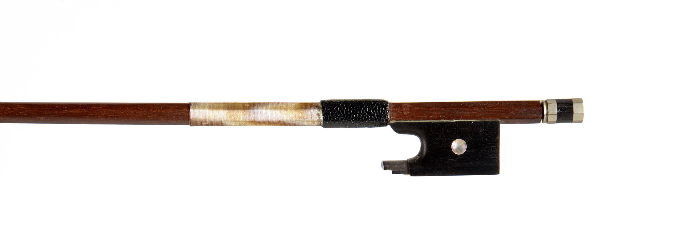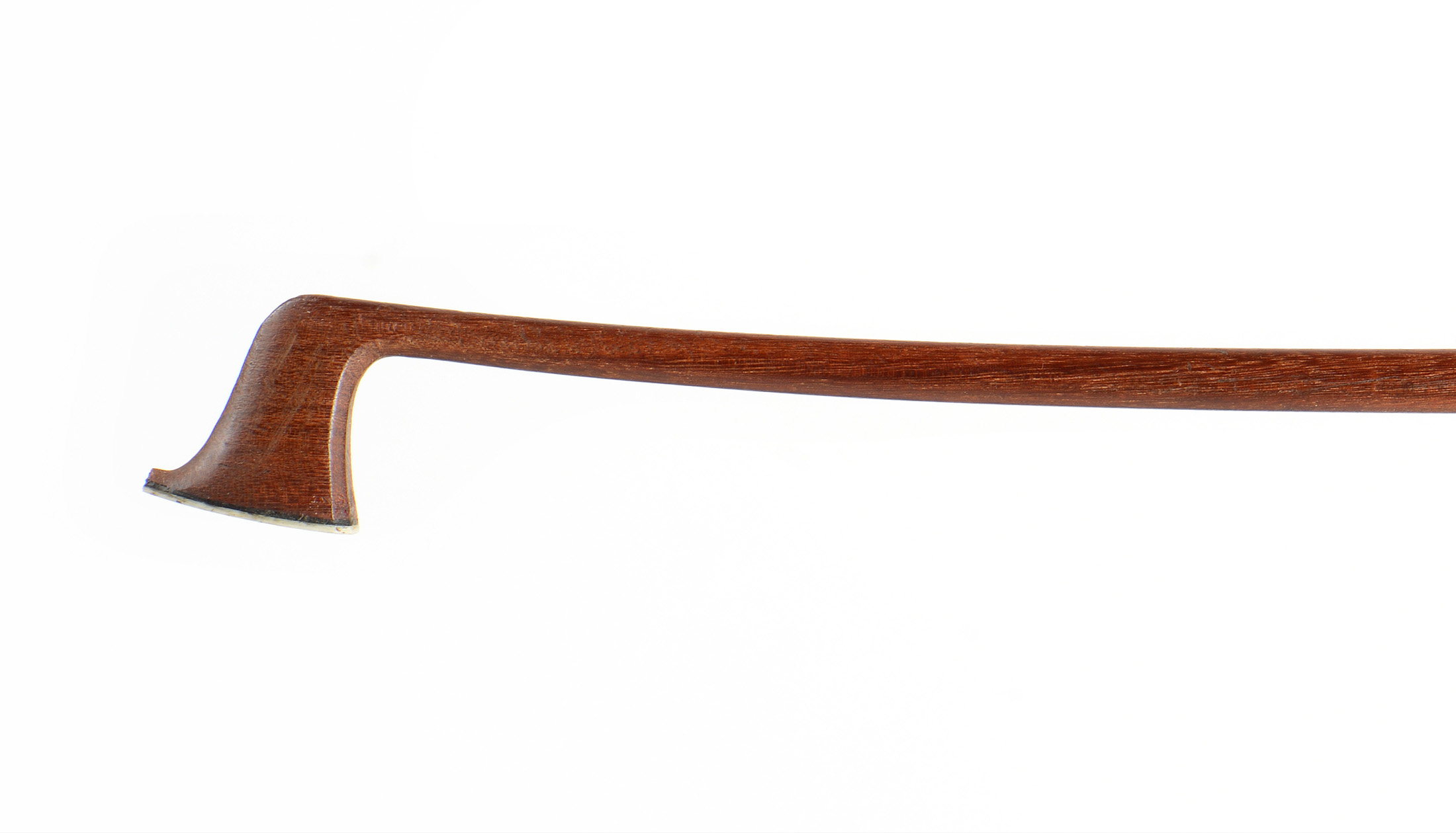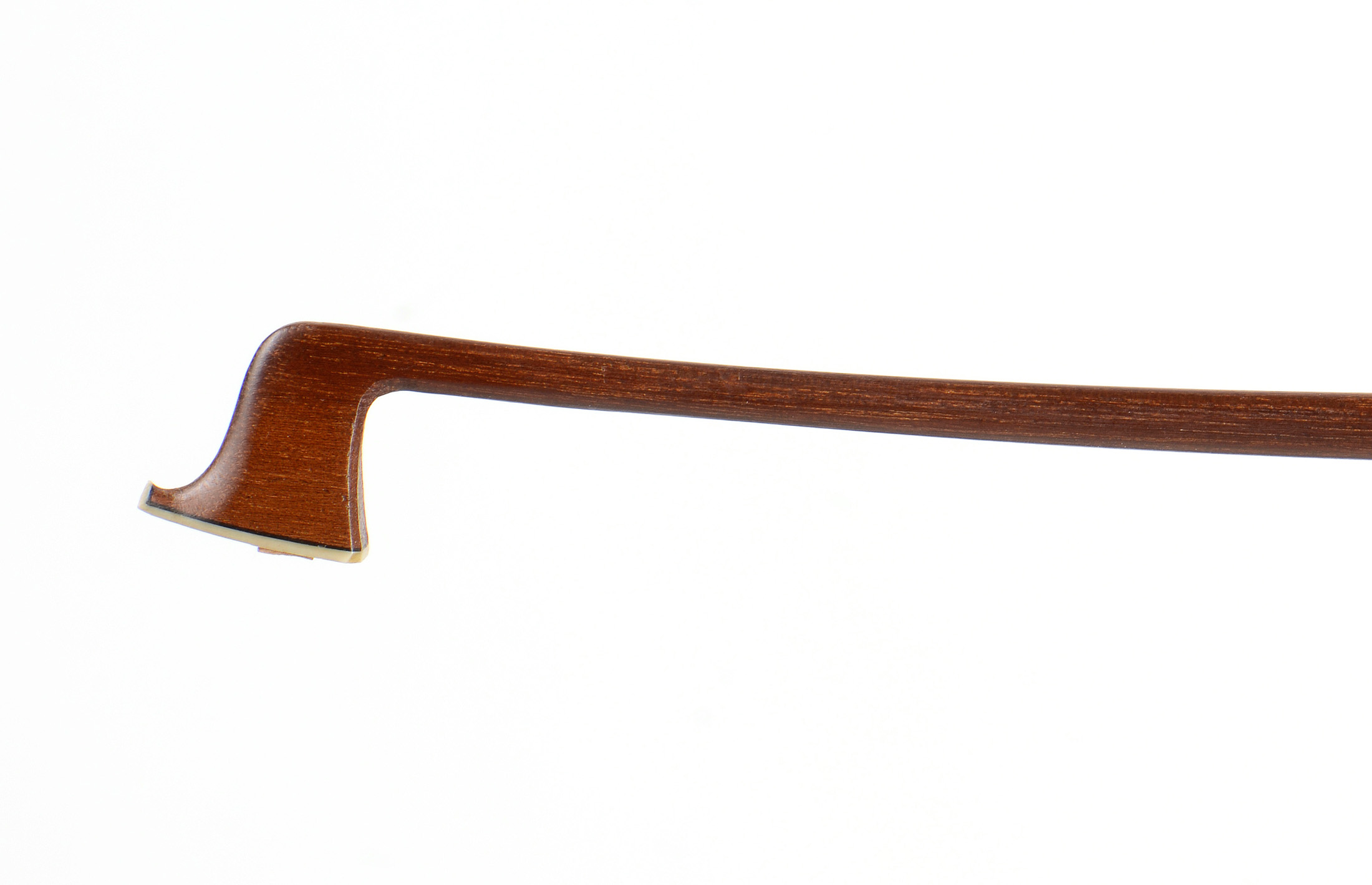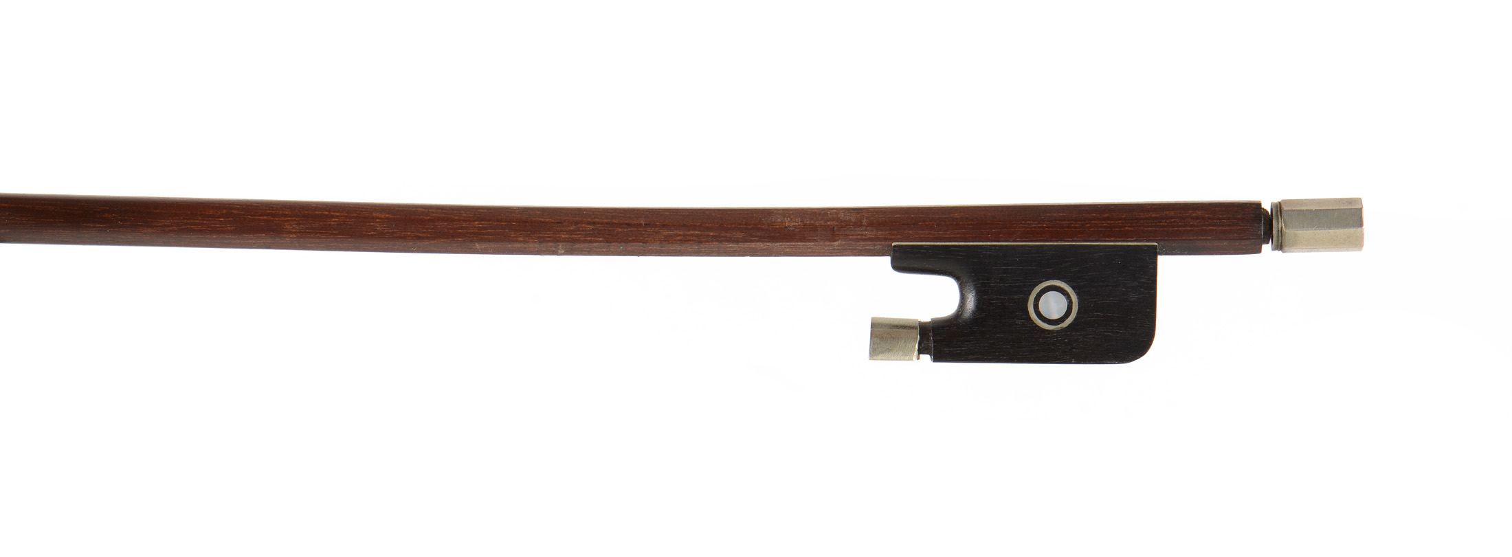 Un archet, fait en beau bois de pernambouc. Hausse ébène montée maillechort. Sans plaque de tête, sans mèche, ni garniture. 729 mm. 52,4 g.
