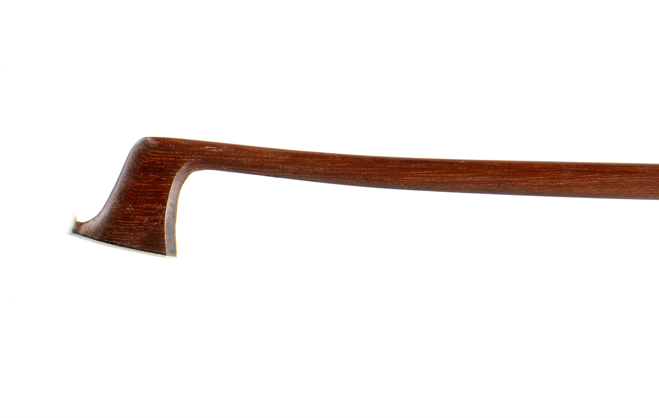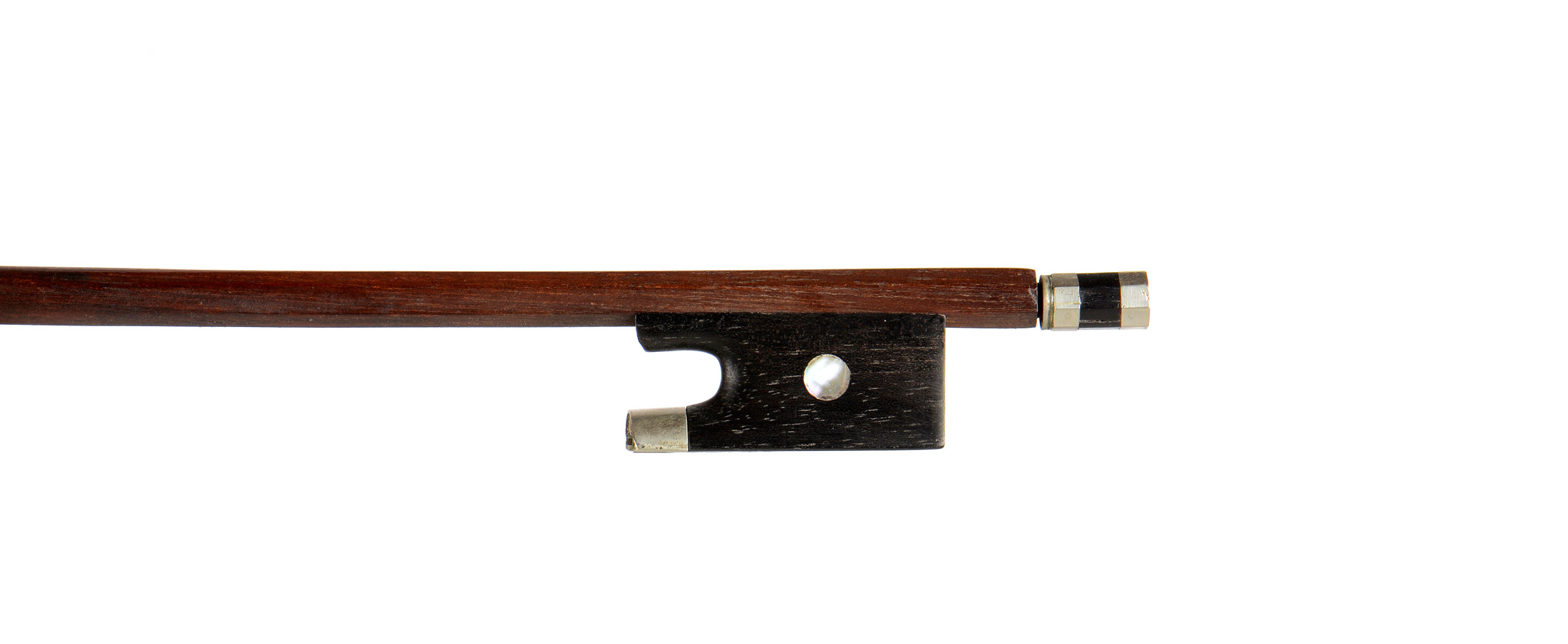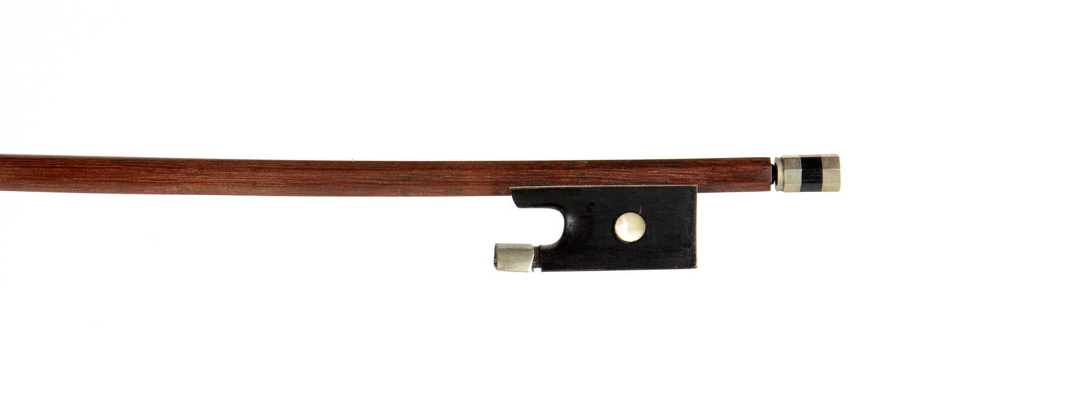 Trois archets de violon: Un archet de violon en bois d'abeille. Hausse ébène montée maillechort. Un archet de violon en bois d'abeille. Hausse ébène sans coulisse, montée maillechort. Une baguette de violon en bois d'amourette, petite cassure au pan.