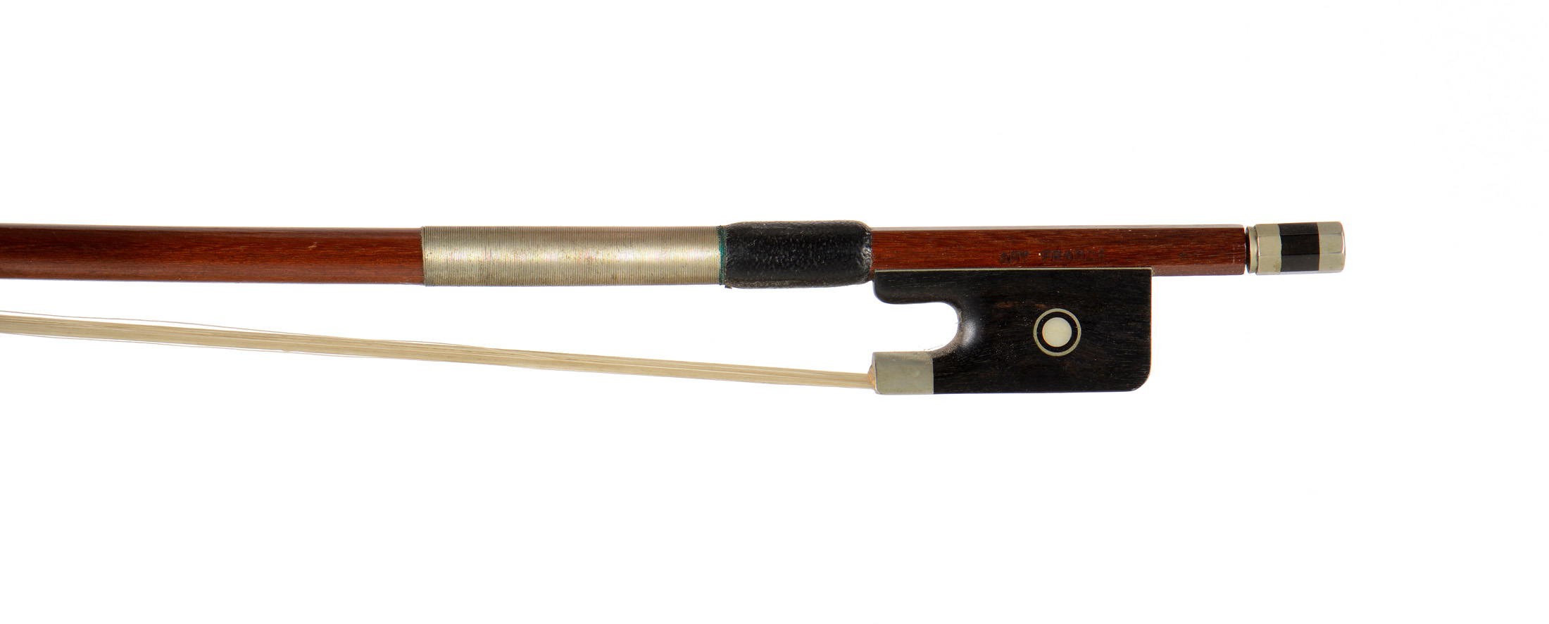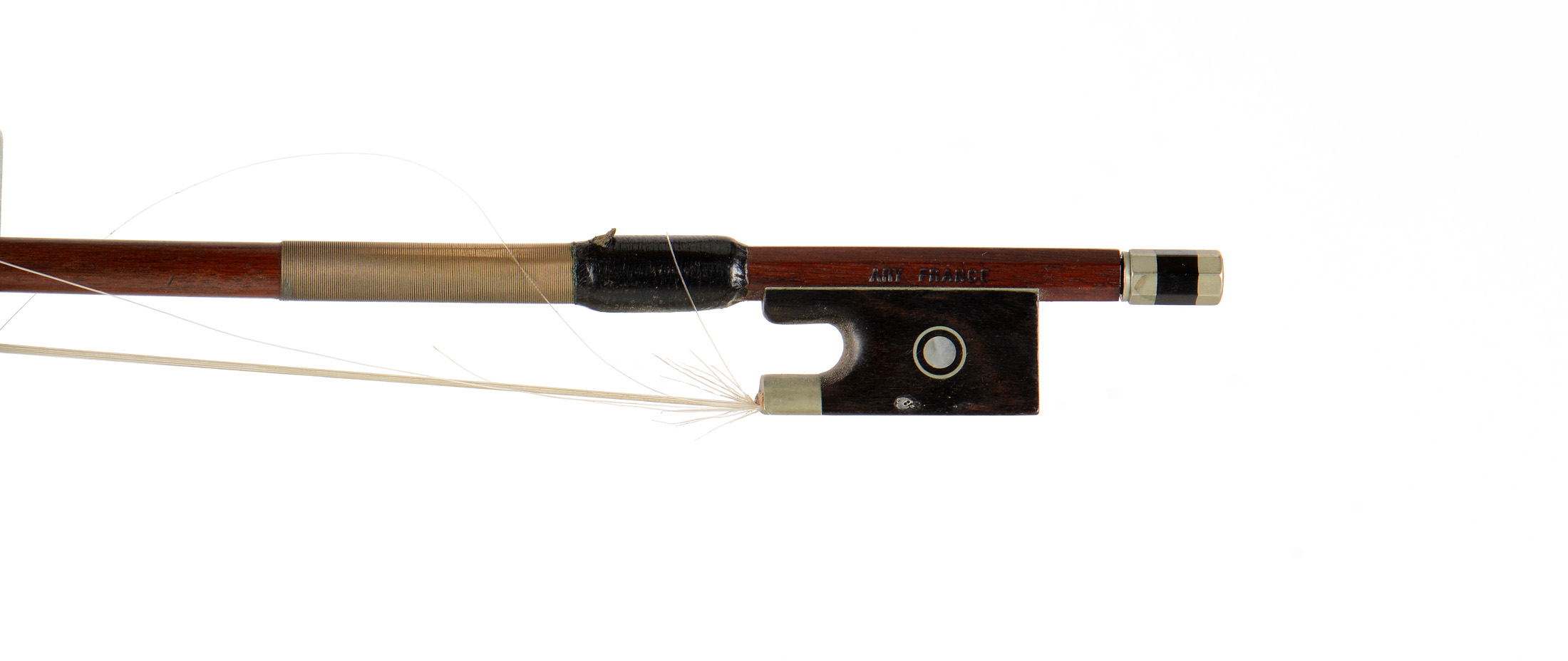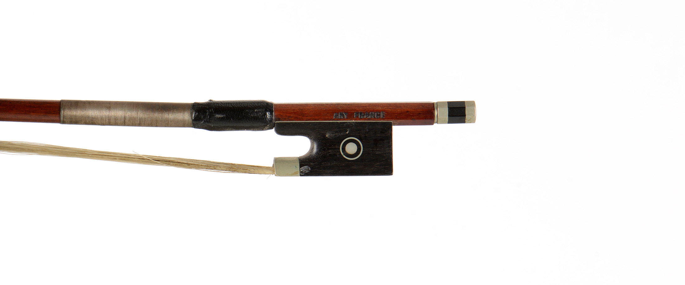 Trois archets de violon ARY FRANCE: Un archet de violon 3/4, en bois de pernambouc, dont il porte la marque au fer. Un archet de violon 1/2, en bois de pernambouc, dont il porte la marque au fer. Un archet d'alto, Hausse ébène montée maillechort avec grain cerclé.
