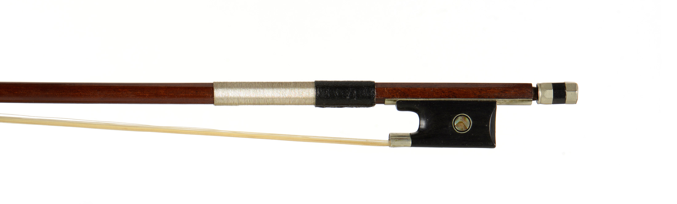 Deux archets de violon: Un archet de violon Allemand sur le modèle Vuillaume. Un archet de violon "PC", hausse ébène montée maillechort, en bois d'abeille.