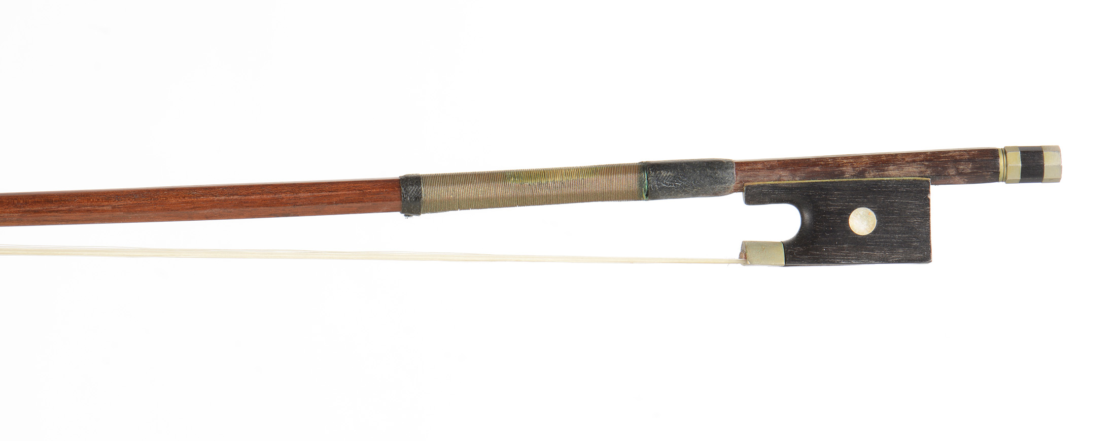 Fait à Mirecourt. Baguette en pernambouc. Hausse ébène montée maillchort. 55,9 g.728 mm.