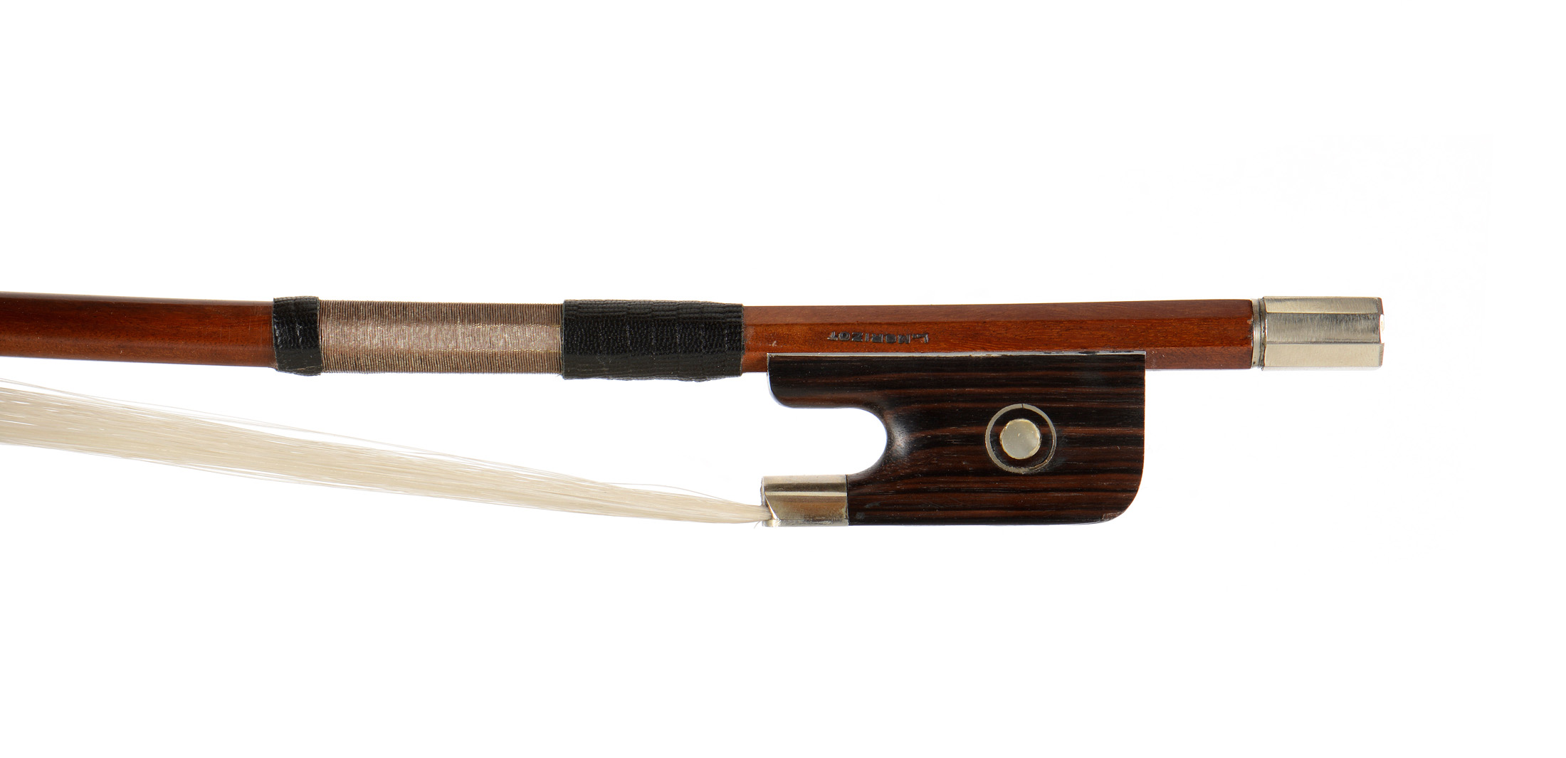 portant la marquede L.Morizot. Hausse Ebene de Macassar, monté maillechort. Baguette en beau bois de pernambouc. 674 mm. 117 g.