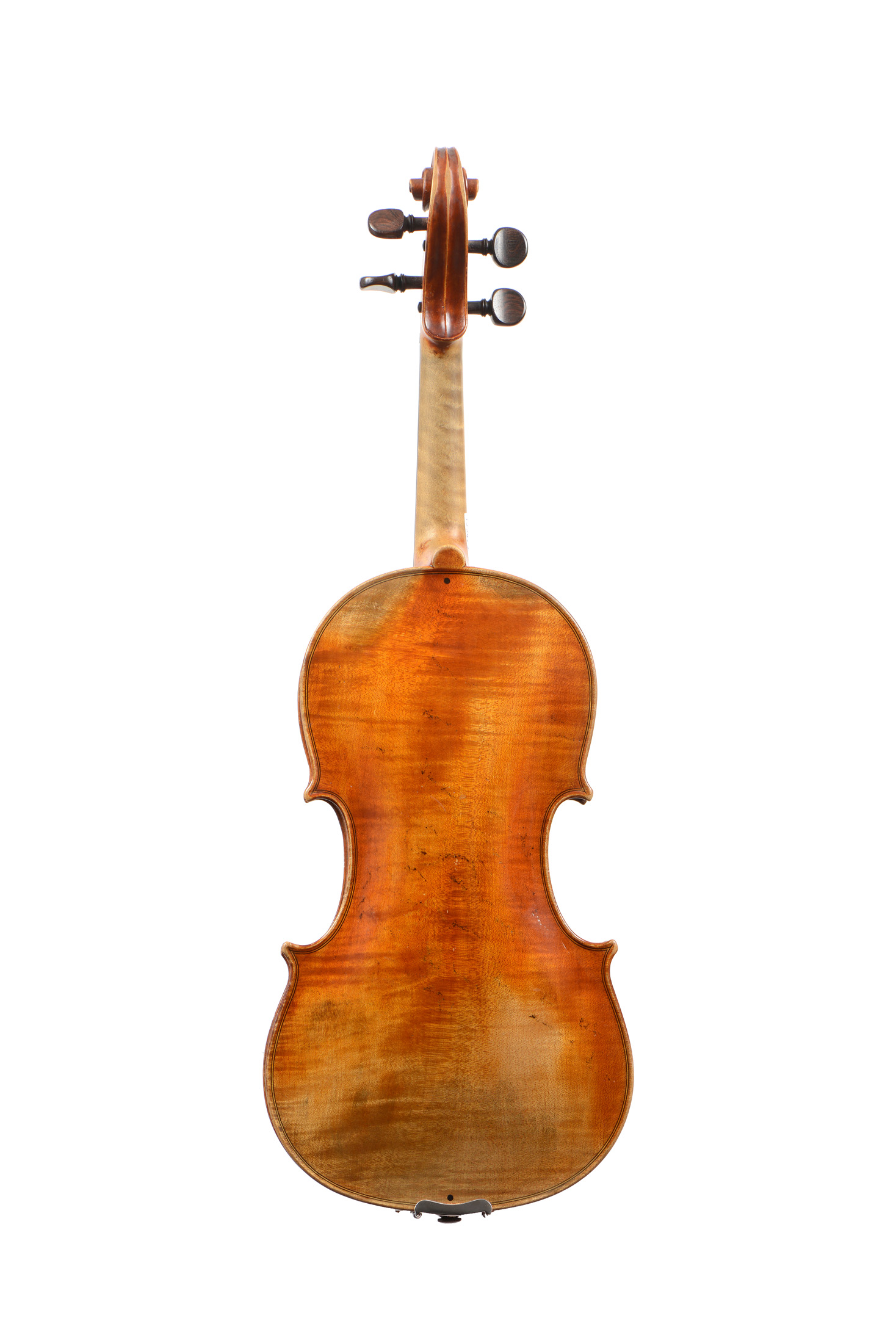 fait par Pierre Claudot, à Dijon en 1966, pour mademoiselle Raphaelle Des Graviers, "en hommage à son talent". Fond d'une pièce aux ondes douces, irrégulières. Eclisses sans ondes. Tête du même bois. Table en épicéa aux pores réguliers plutôt serrés. 357 mm. En parfait état de jeu. Avec certificat de RAMPAL.