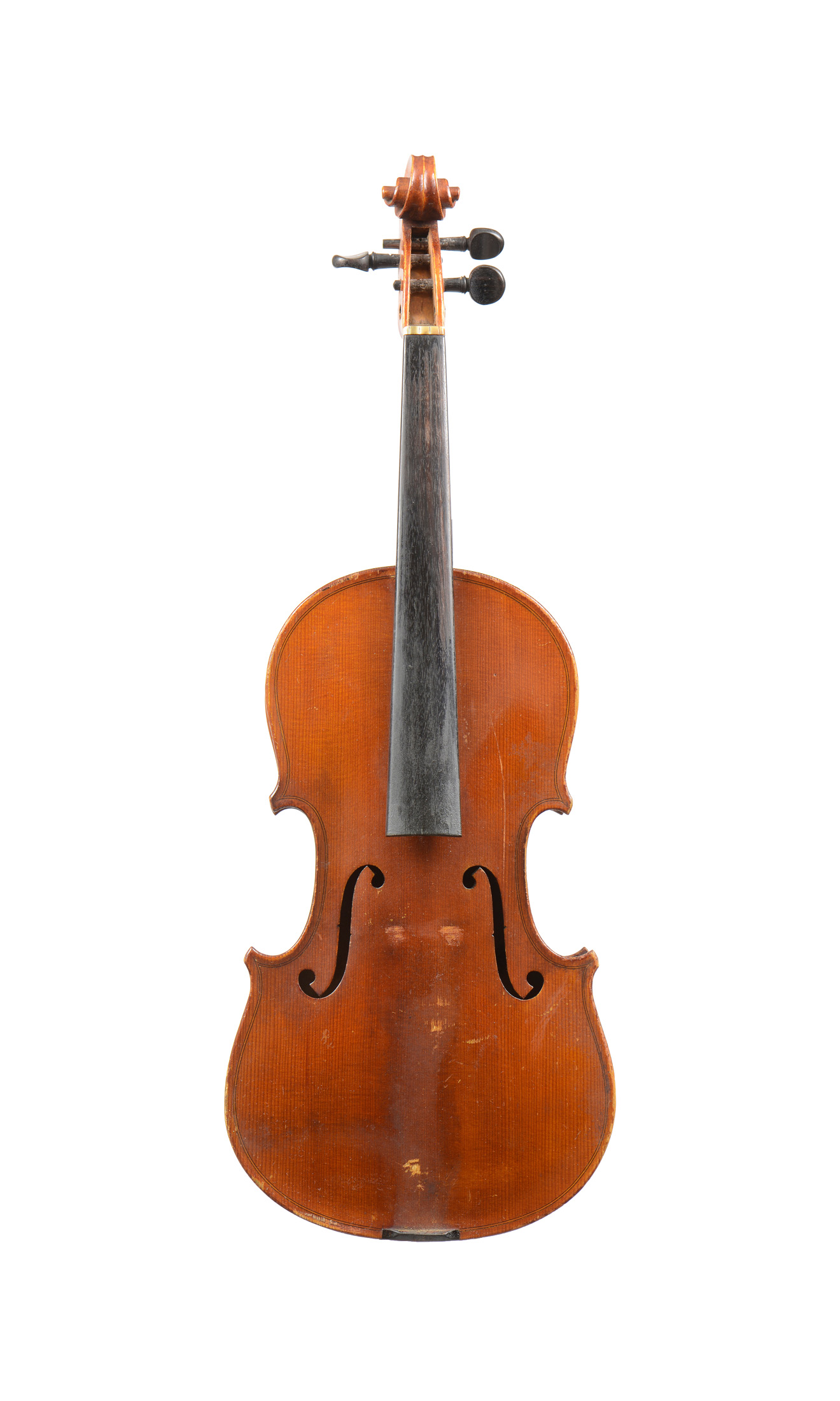 Violon d'étude fait en Europe centrale. Fond d'une pièces. Vernis brun orangé sur fond doré. Bon état général. 360 mm.