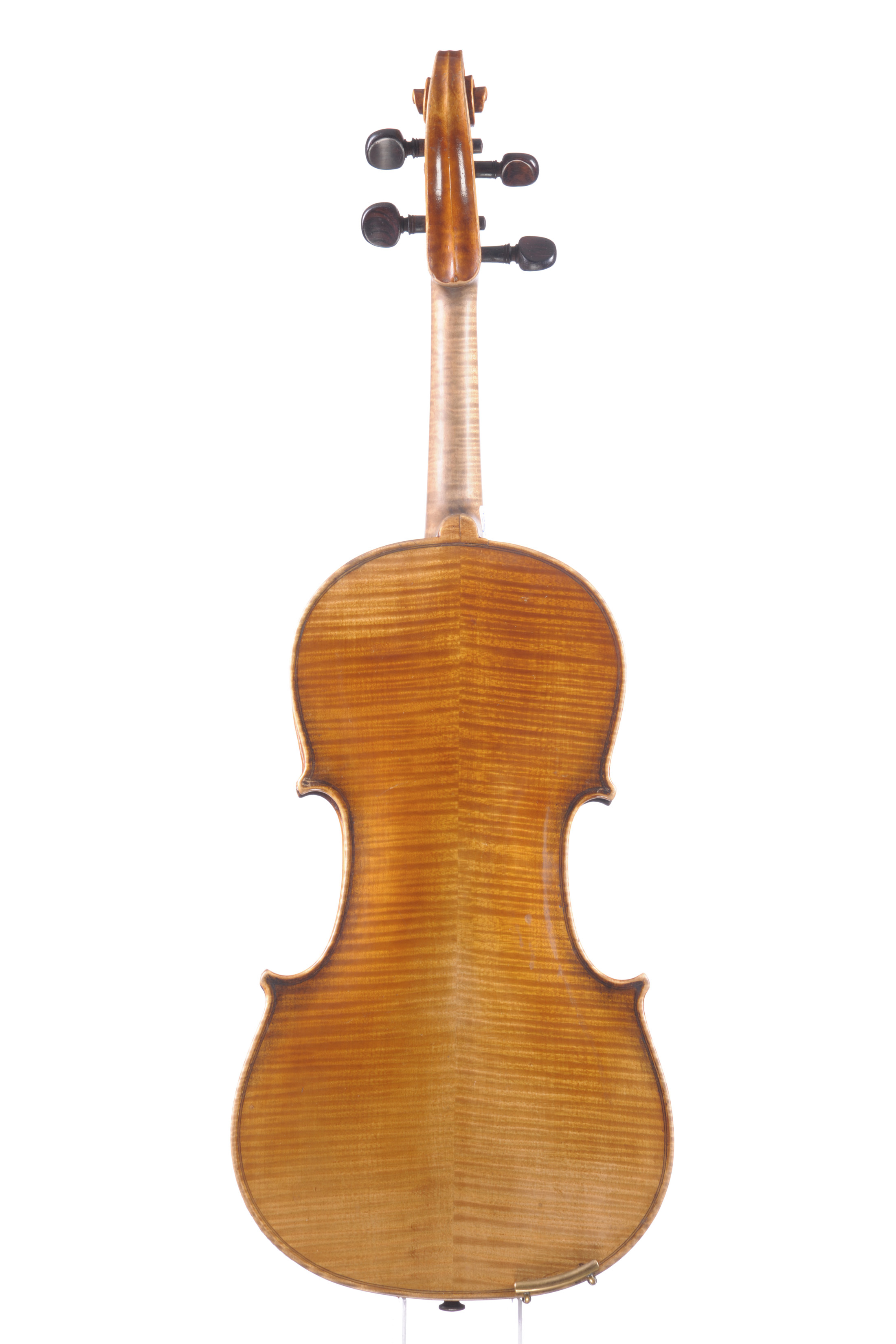Il porte une étiquette abimée d'Amati. Fait vers 1890. Cassures à la tête. Beau fond de deux pièces en érable aux ondes serrées et horizontales. 359 mm. Vernis brun doré. Avec sa boite et deux archets ordinaires.