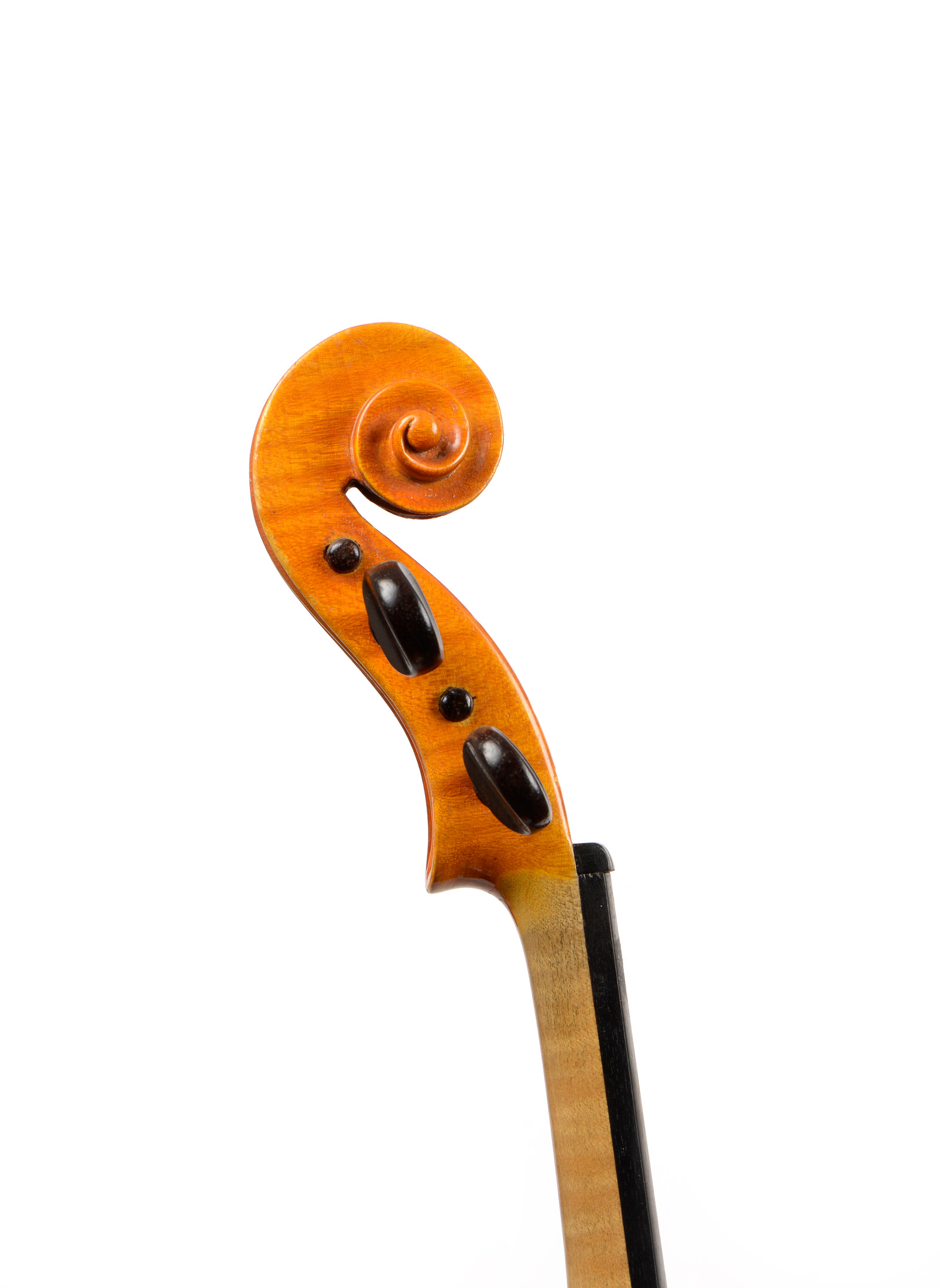 fait par Francesco De Nicolo, à Florence, en 1980. Fond d'une pièce. Belles ondes régulières. Eclisses et tête du méme bois. Table en épicéa, aux pores réguliers. Vernis légèrement craquelé. En parfait état. 355 mm.