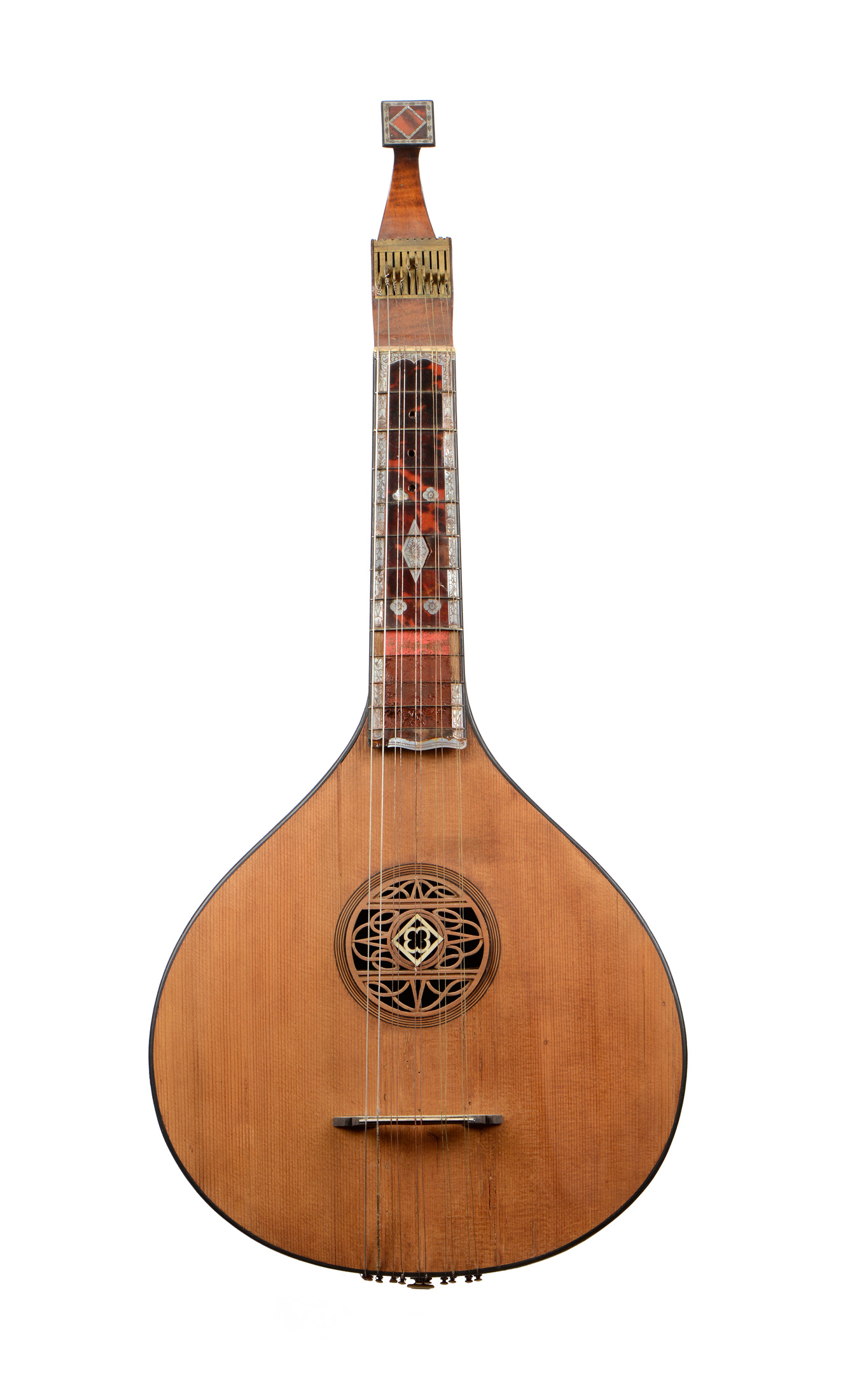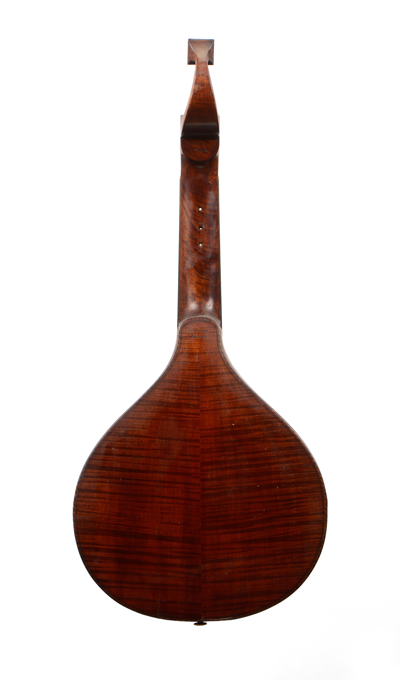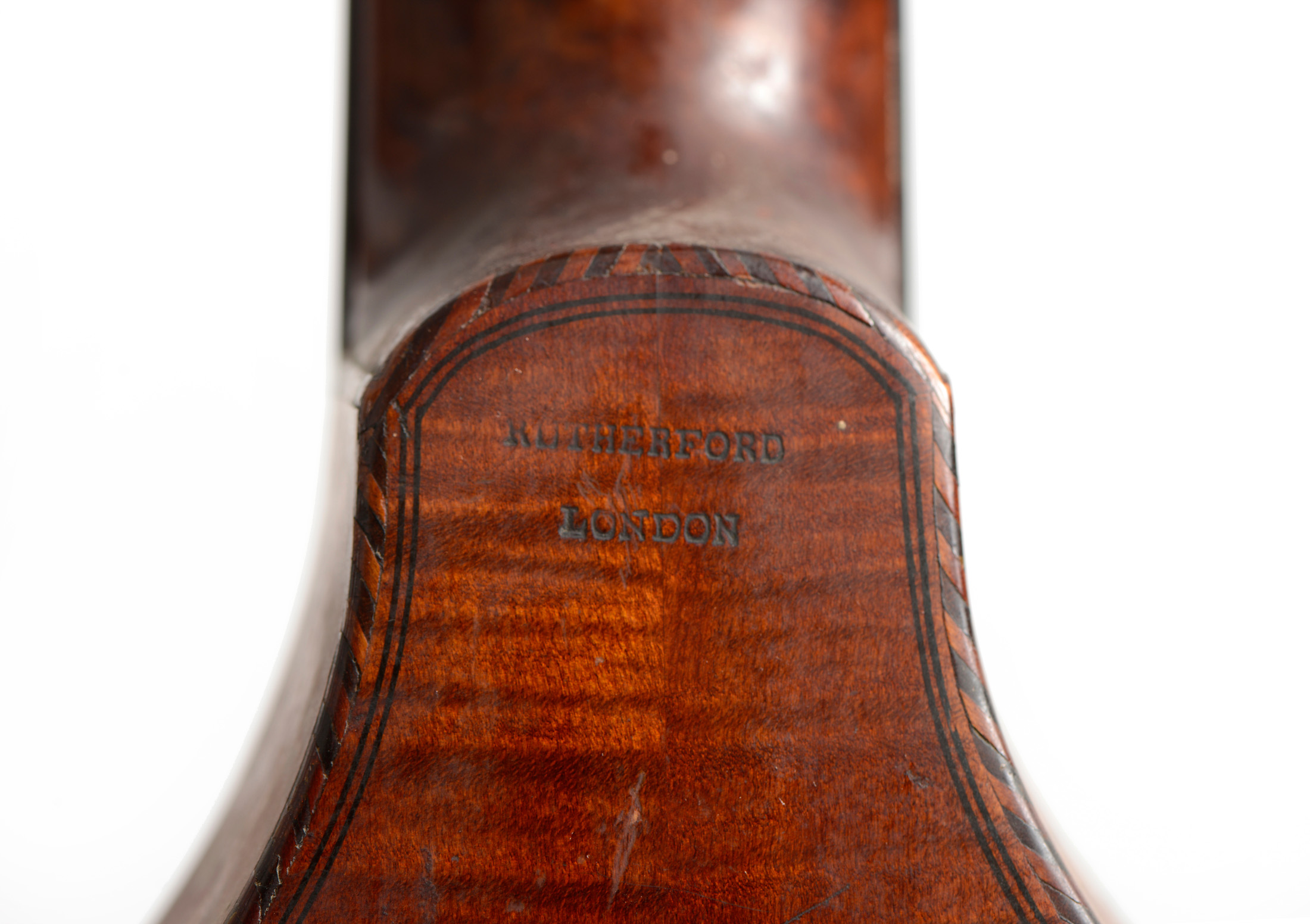 portant la marque sous le talon du manche RUTHER FORD London. Fait à la fin du XVIIIe. Fond plat en érable. Eclisses du même bois. Table en épicéa avec quelques traces de vers. Rosace sculptée, et touche marquetée.