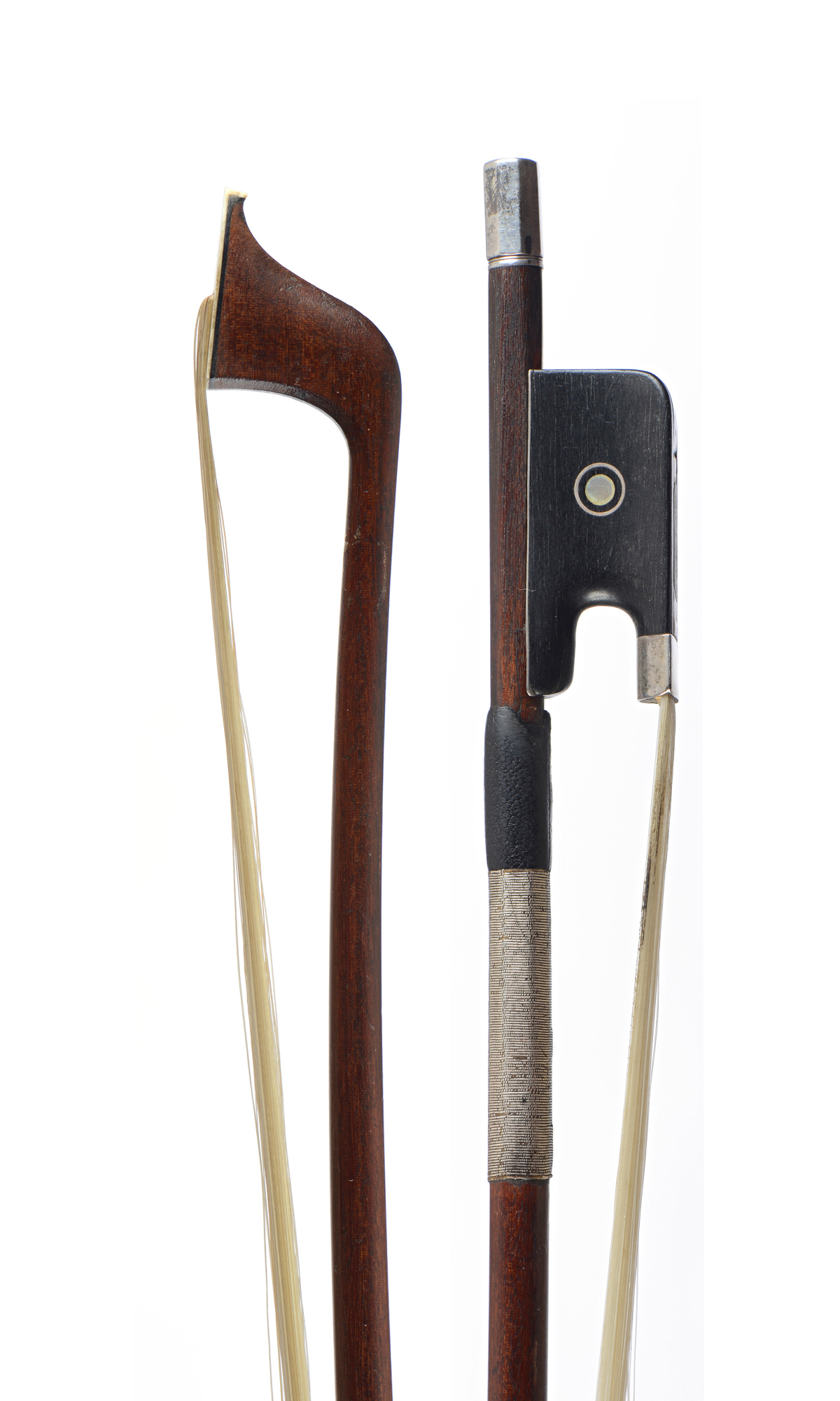 Probablement fait par Charles Nicolas BAZIN (1847- 1915), vers 1900. Baguette ronde en beau bois de pernambouc. La hausse est en ébène montée argent, avec grain cerclé. Bouton argent plein. Une pièce de bois au pouce; avec usures. Usure au pan, au dessus de la hausse. 685mm. 68 g avec garniture argent sur soie.
