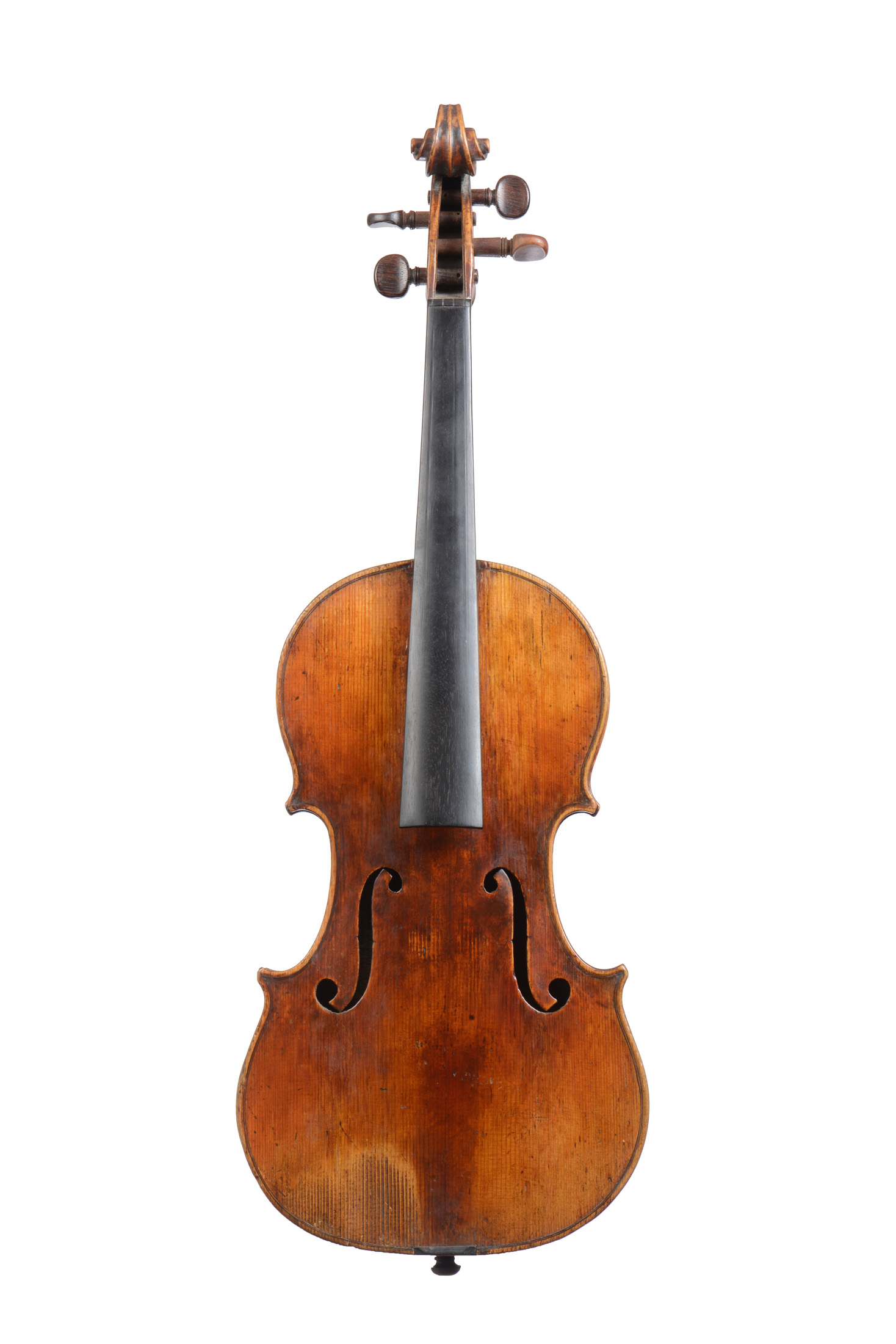 Intéressant violon portant une étiquette "Médaille d'or et d'argent Charles Jacquot. 42 rue de l'échiquier à Paris. JC". Probablement fait par C.JACQUOT, vers 1850. Fond d'une pièce en bel érable, vernis brun sur fond doré. L'ensemble en bon état de restauration. 356mm. Vernis repris à la table.