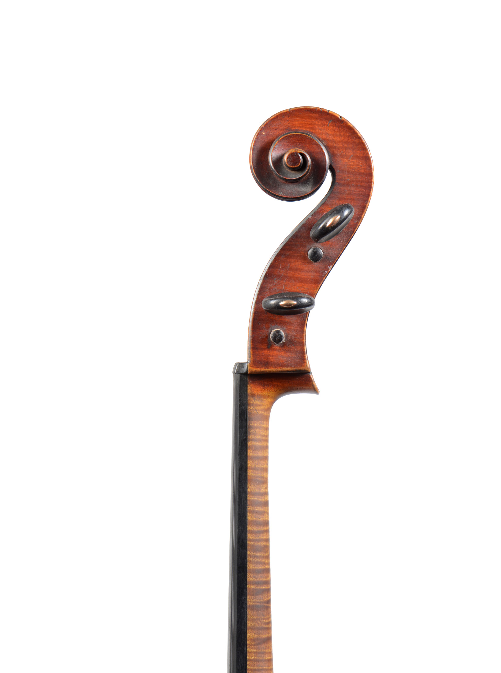 fait par Caressa et Français, dont il porte l'étiquette originale, à Paris, au millésime de 1910. Numéro 321. Marques au fer à l'intérieur. Fond de deux pièces en très bel érable aux ondes régulières horizontales. Premier prix décerné par le conservatoire nationale de musique: Une couronne de laurier et de chêne. Table en épicéa aux pores réguliers s'élargissant légèrement sur les bords. Fractures à la table restaurée. Vernis rouge brun sur fond doré. Usures de jeu sur le vernis. L'ensemble en bon état de restauration. 765 mm.