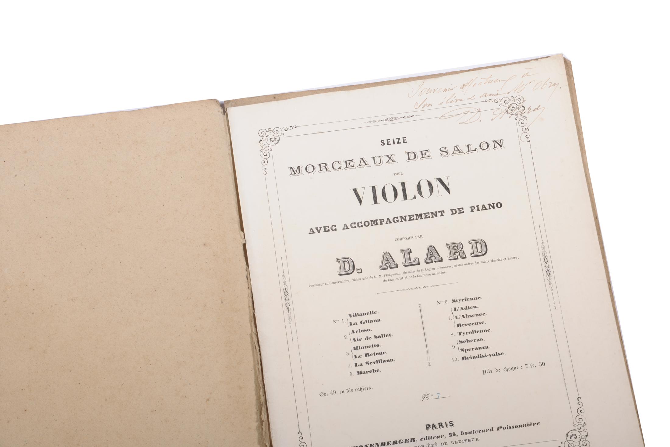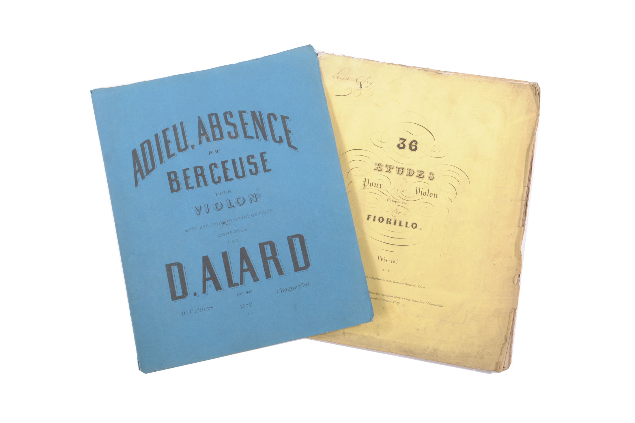 ON JOINT un ensemble de dix partitions brochées et reliées d’études, sonates et duos pour le violon ayant appartenu à Obry : BERIOT, DANCLA, FIORILLO (Nouvelle édition Marquerie, imprimée en taille douce), HERMAN, HOFFMAN, KREUTZER (Nouvelle édition Meisonnier), MAZAS (2 vol.), VIOTTI (pleine percaline rouge), ainsi qu’un bel exemplaire en demi-reliure de l’Ecole du Violon de Delphin ALARD (Schonenberger).