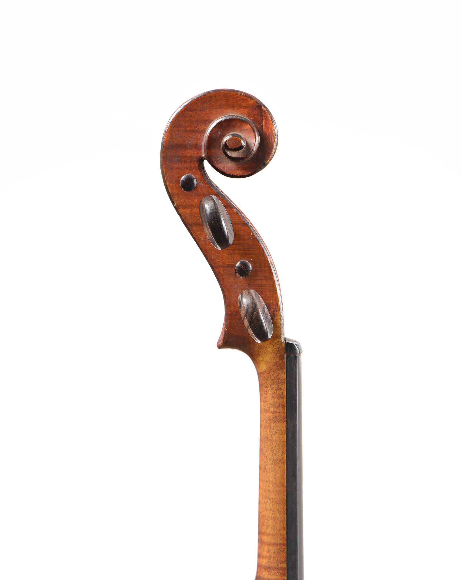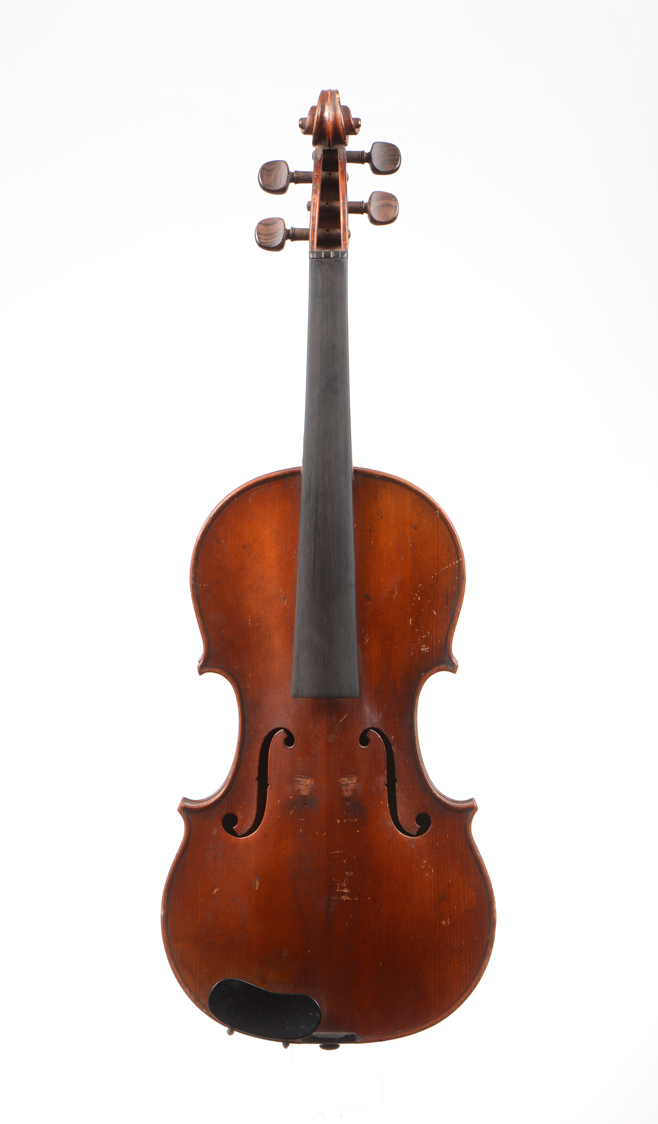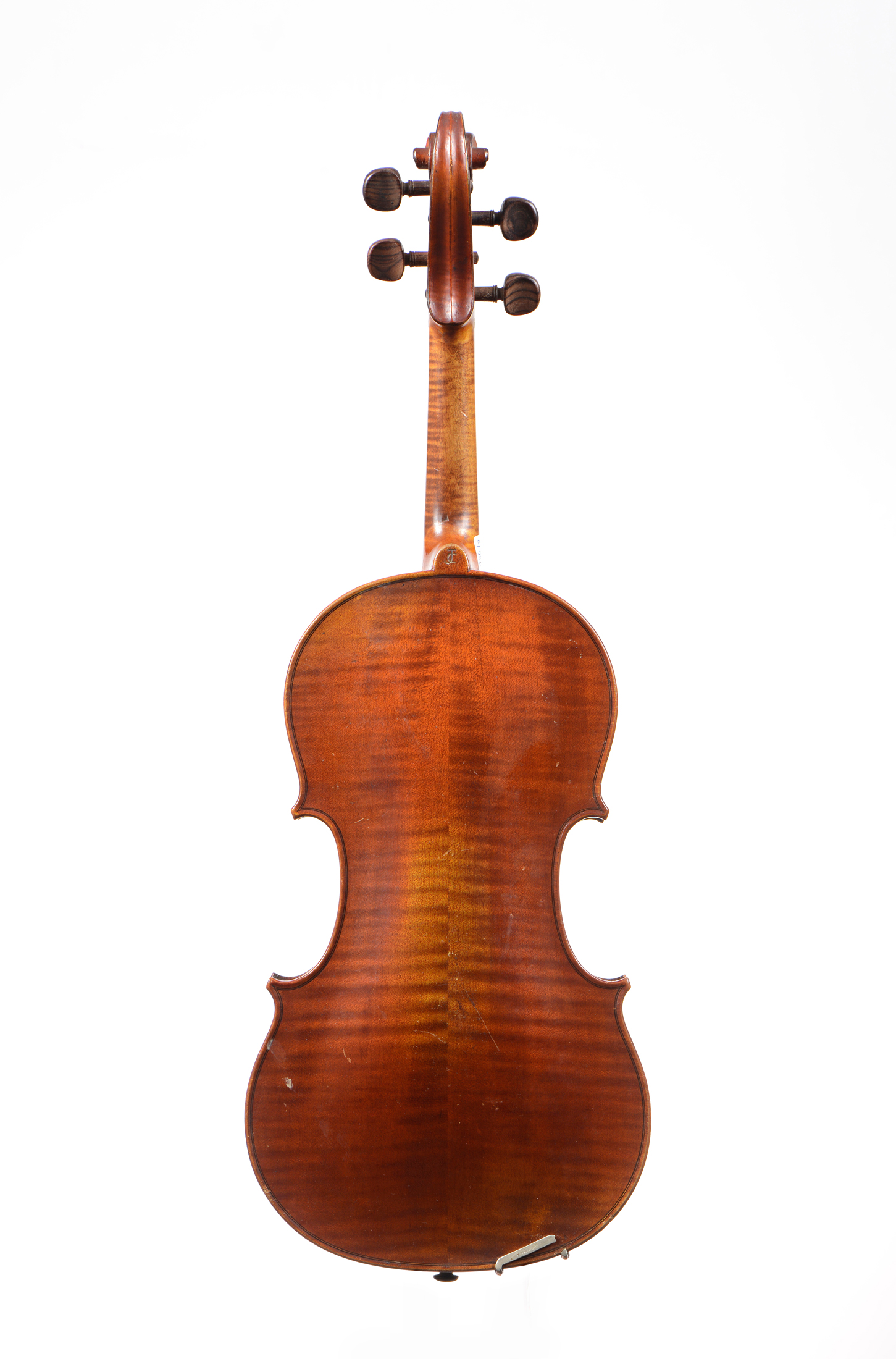 portant une étiquette "Copie de Nicolaus Amatus...", et une seconde étiquette " Chenantais et le Lyonnais...", marque d'amateur au talon du manche. Fond de deux pièces. Vernis brun rouge sur fond doré. Petites cassures aux flancs du haut. Usures. Bon état de conservation. 359 mm.
