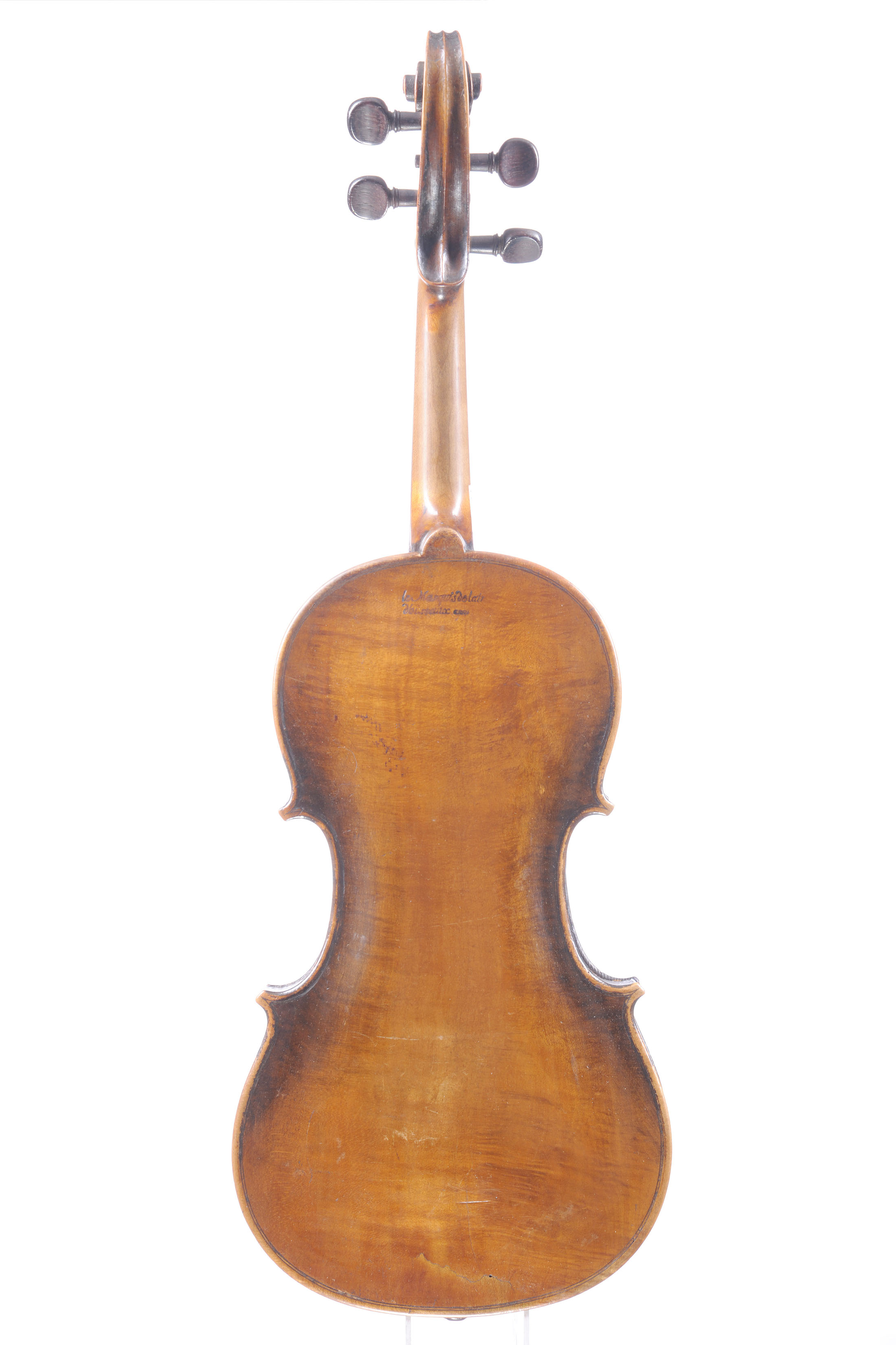 fait par C.Claudot, "Marquis de l'air d'oiseaux" dont il porte la marque au fer sous le talon du manche. Vernis brun foncé sur fond doré. Fond d'une pièce. Montage Baroque. Importantes cassures et traces de vers sur les éclisses, ainsi que diverses cassures sur sa table d'harmonie. 363 mm.