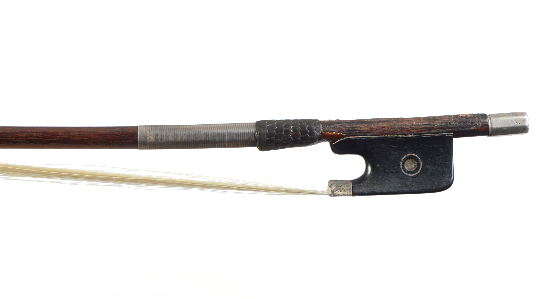 Probablement fait par A.VIGNERON A PARIS, dont il porte la marque au fer. La baguette est ronde en beau bois de pernambouc. La hausse est en ébène, avec grain cerclé, montée argent. Bouton plein, et initiales R.L sur le passant.