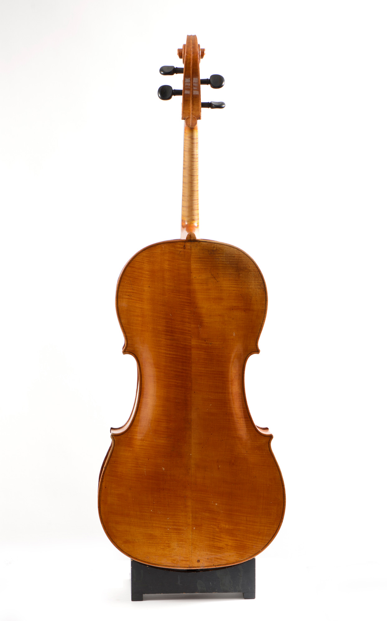 Fait vers 1830 à Mirecourt. Intéressant violoncelle 7/8. Fond de deux pièce en érable ondé. Eclisses et tête du même bois. La table est en sapin aux pores s'élargissants sur les bords. Bon état de restauration. 723 mm. Belle sonorité. Cassure d'âme restaurée, à la table.