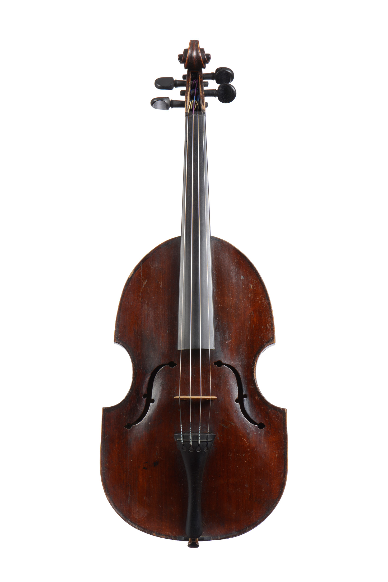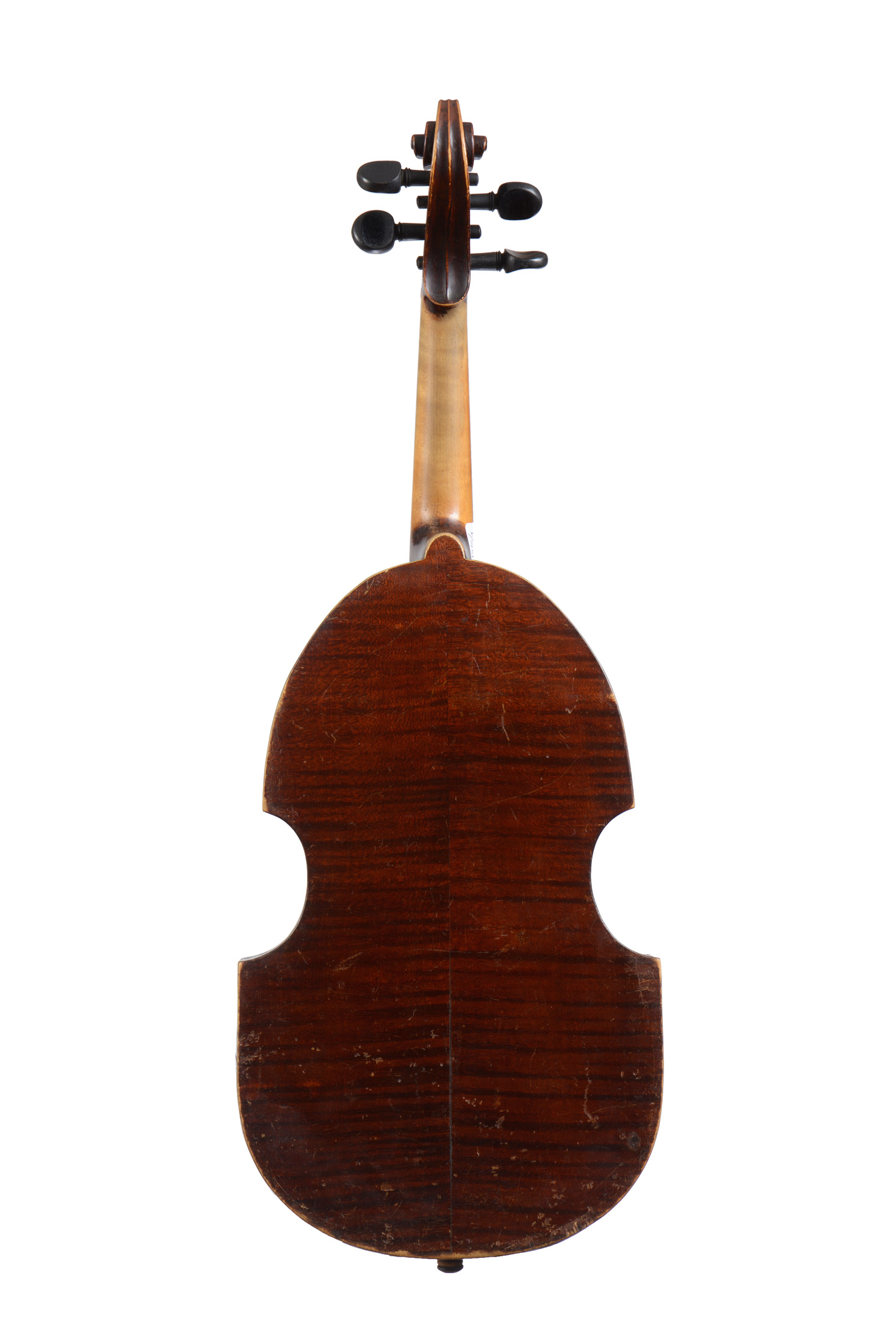 Portant une étiquette originale "Agustus FACINNI". Fait au XVIIIè par un amateur. Portant une étiquette de réparation à Trieste. Fond de deux pièces en bel érable. Joint du fond à revoir. Verni brun rouge sur fond doré, diverses cassures restaurées, retouches de vernis, une trace de ver au manche. 369 mm.