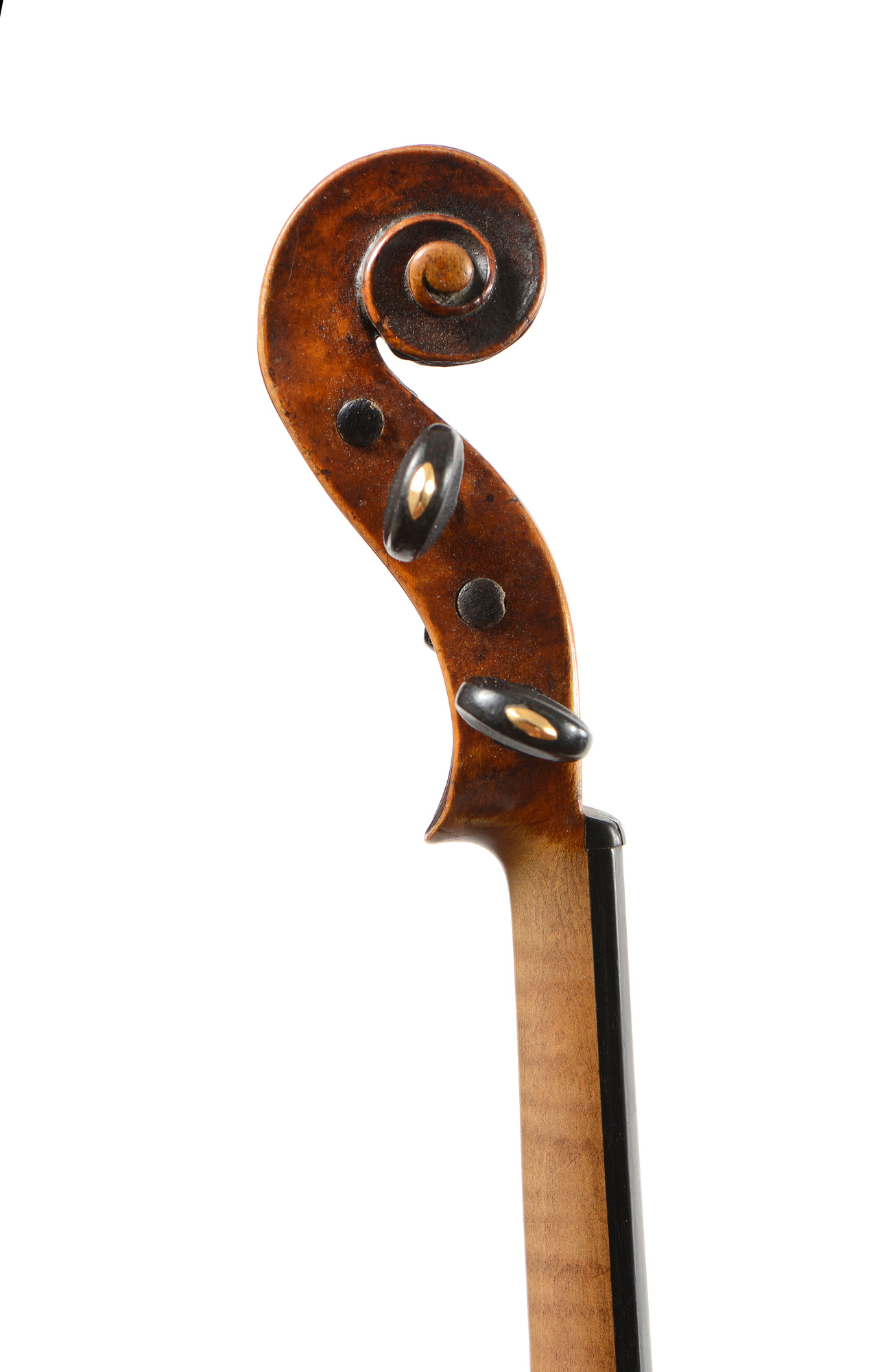 portant une étiquette de François Lejeune, rue de la Juiverie à Paris, 1755. Beau fond d'une pièce. Vernis brun sur fond doré. Cassures d'éclisses et diverses cassures de table réparées, Cassure d'âme à la table. 359 mm.