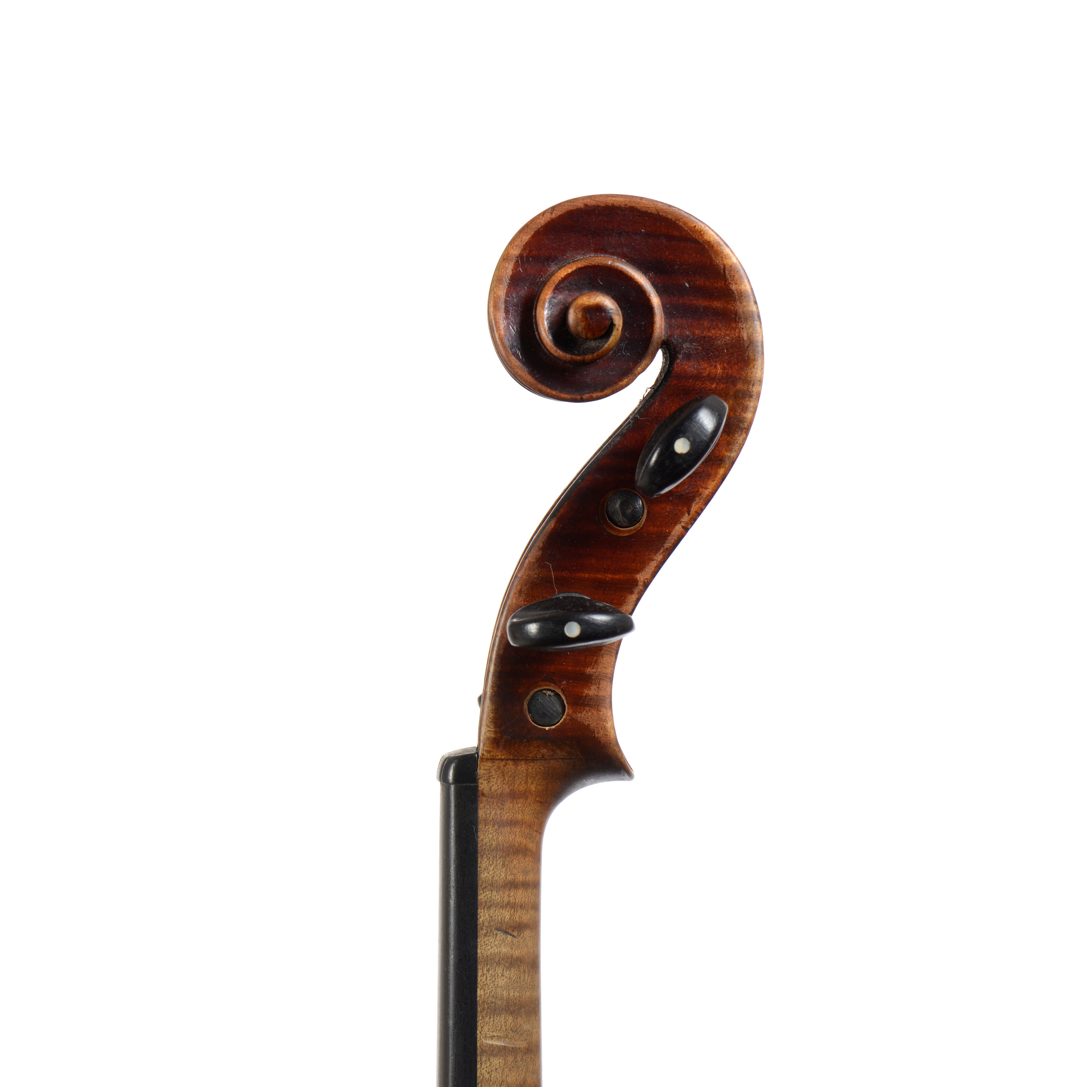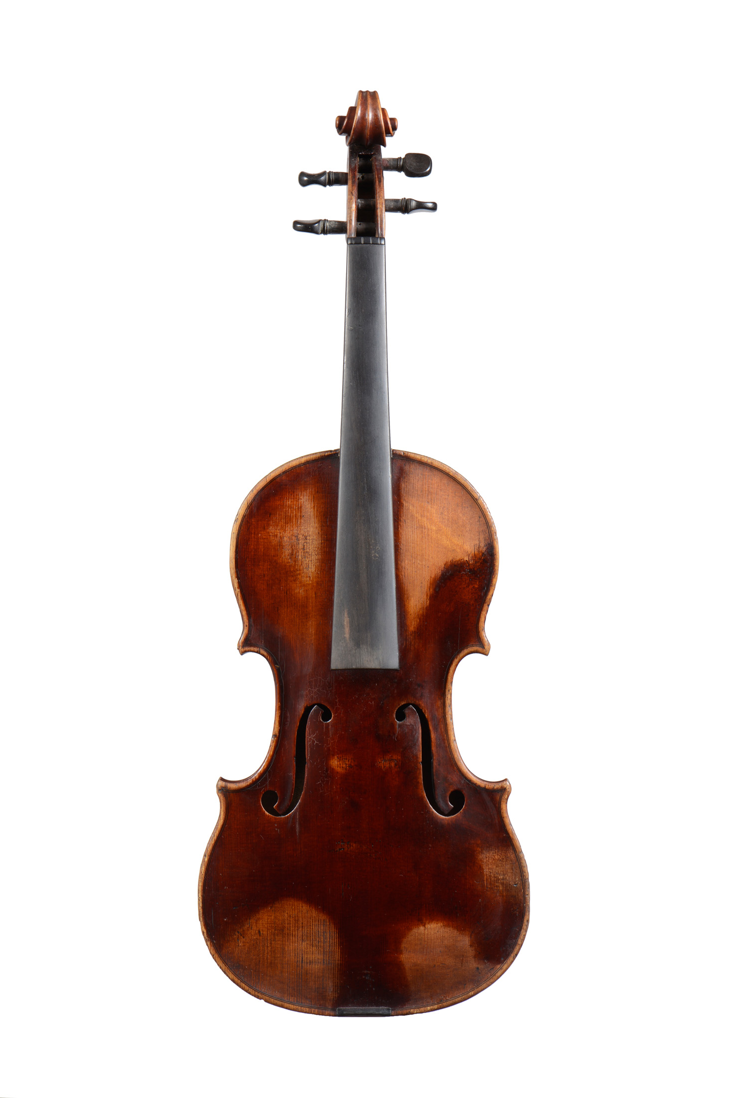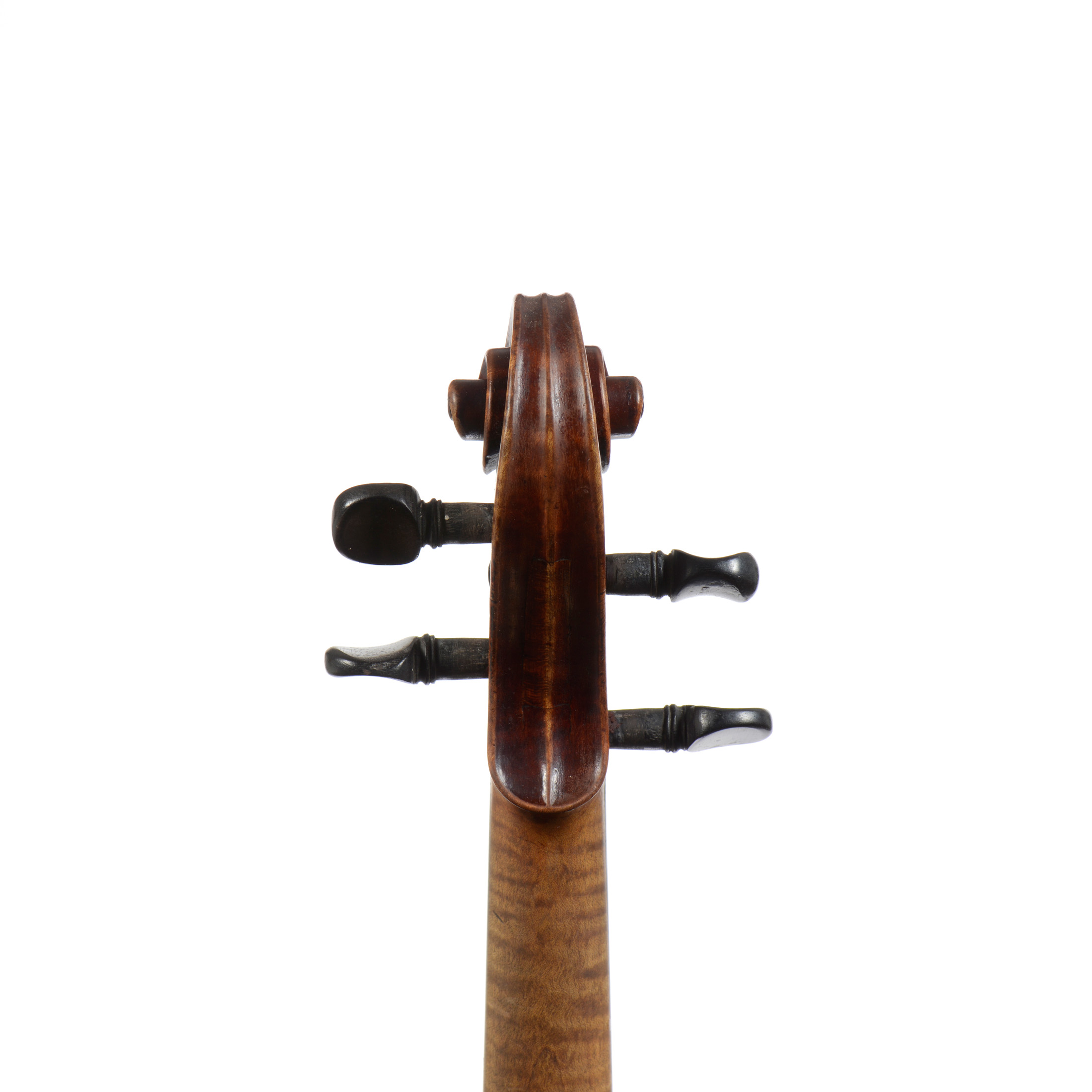 Remarquable violon fait par Guillaume GAND (1792 - 1858). Portant une étiquette de Gosselin, et une signature à la plume Guillaume Gand 1812. Beau fond d'une pièce en érable, avec trois goupilles. Eclisses et tête du même bois. Table d'une pièce aux pores irréguliers. Vernis brun rouge sur fond doré. 357 mm. Bon état général. Diverses petites cassures à la table et au talon. L'ensemble en bon état de conservation.
